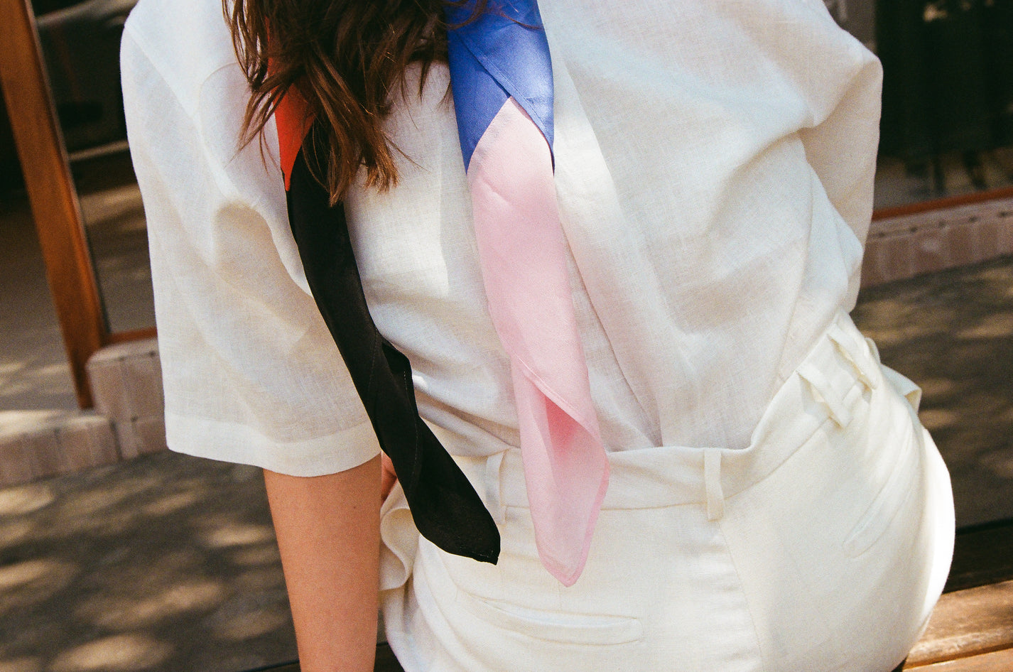 Os looks ganham vida com nosso lenço de patchwork em seda — nas cores da coleção — e com as papetes que ela usa em diferentes tons.