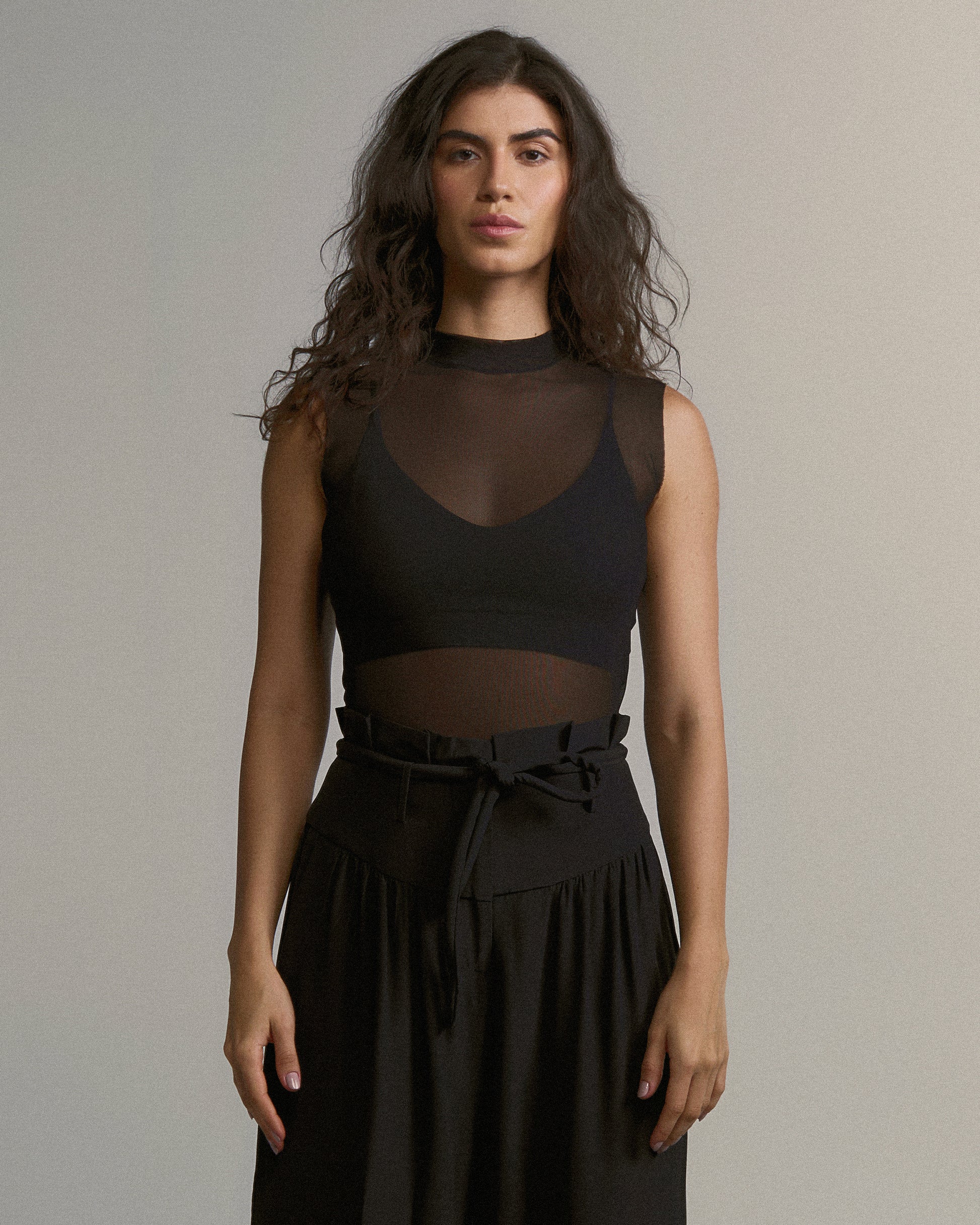 Versão de manga curta da nossa segunda pele. Feita em tule poliamida, é justa e se adequa ao corpo como uma extensão da pele. Com gola baixa e corte a fio (laser), é uma peça básica e indispensável, perfeita para ser usada sozinha ou em sobreposição a casacos e vestidos. Disponível nas cores pele e preto.