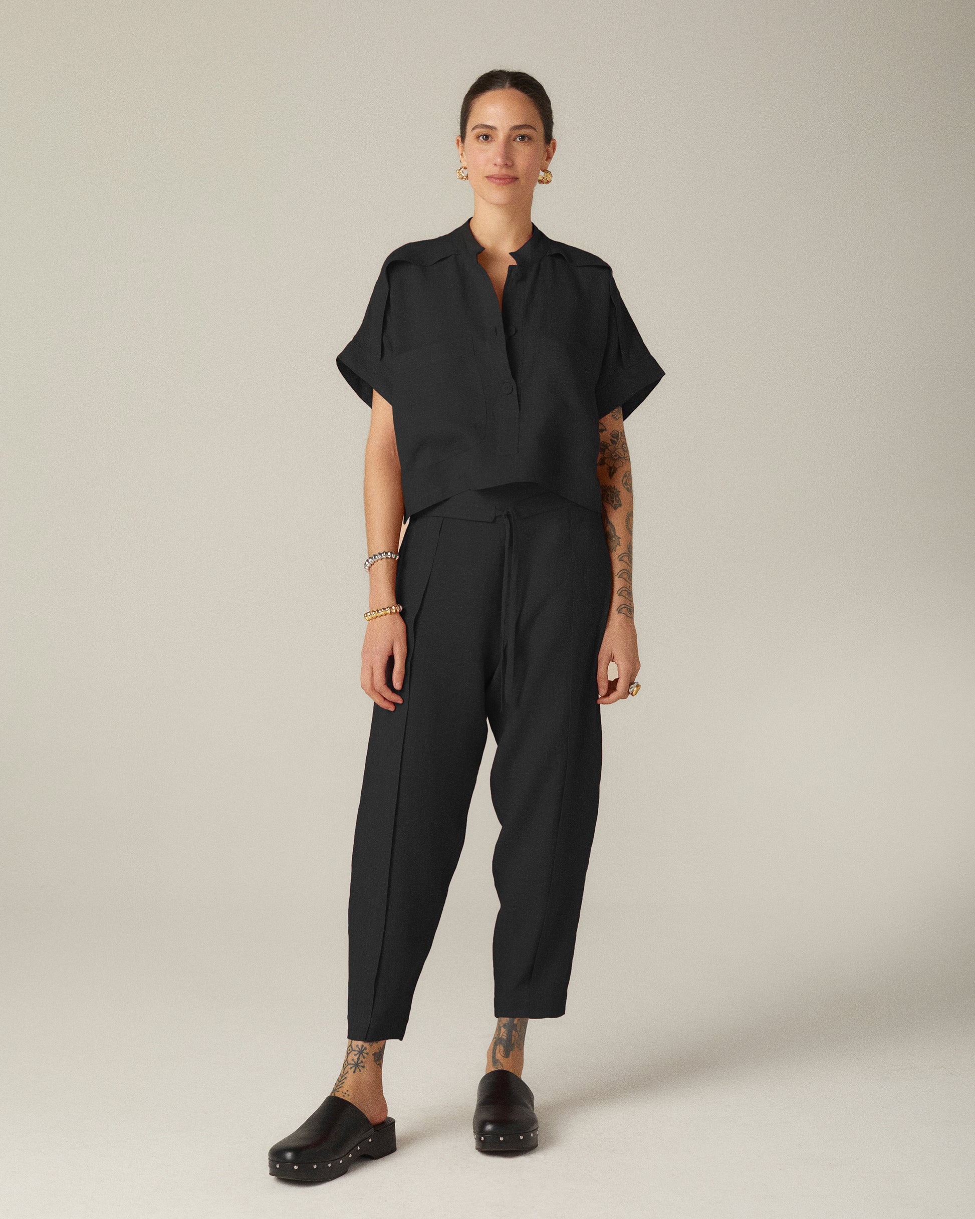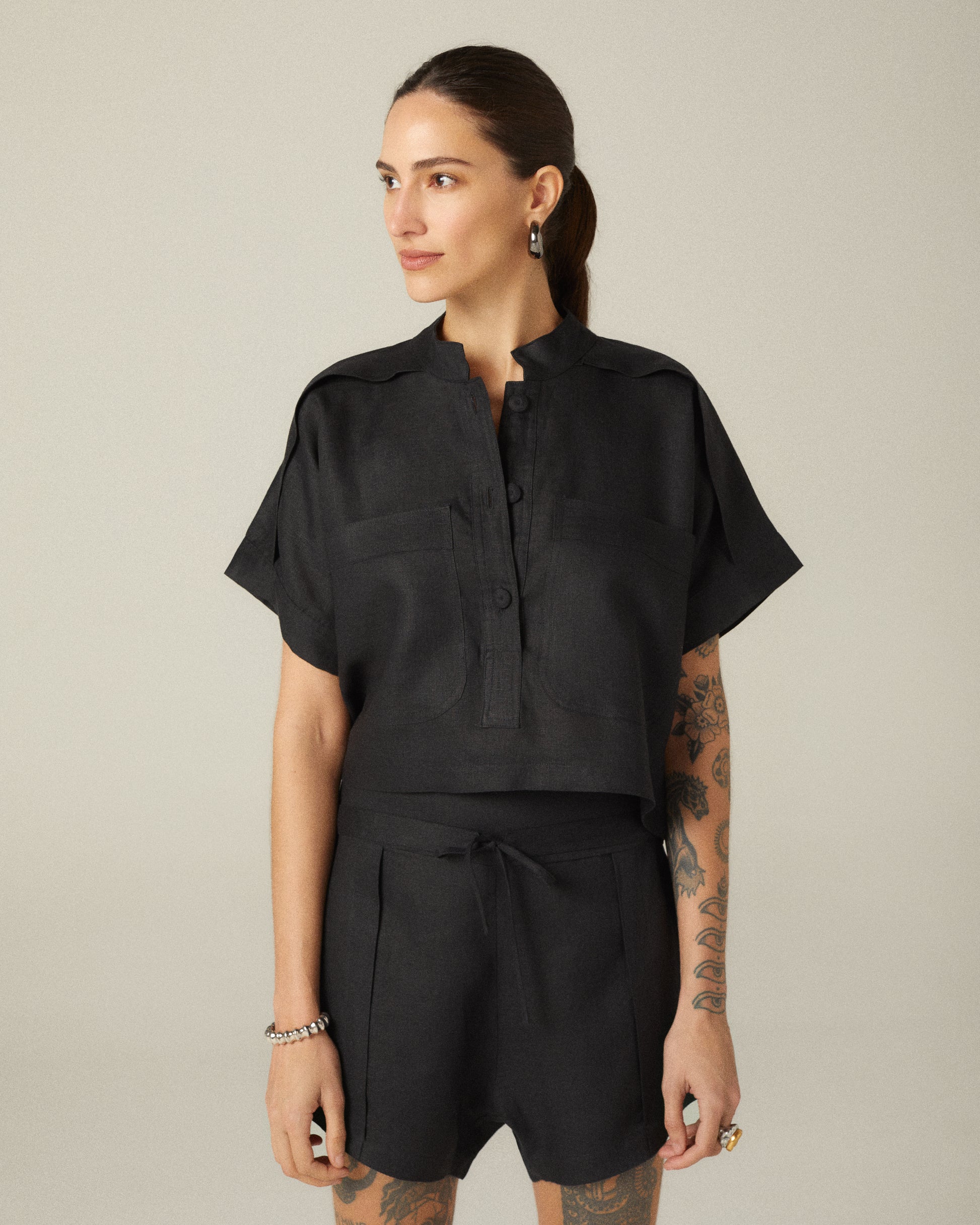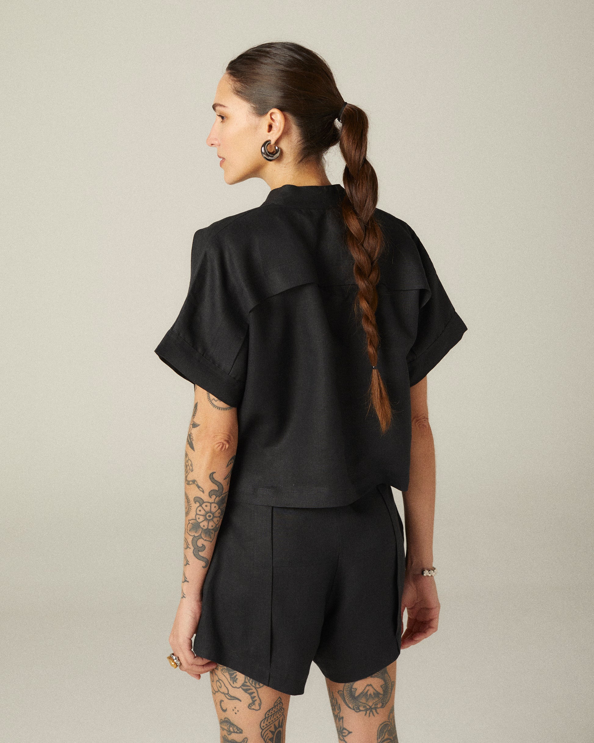 A Blusa Égide é um cropped amplo em linho. Possui gola fechada, abertura frontal estilo carcela e dois bolsos grandes aplicados. Os botões são forrados no próprio tecido.