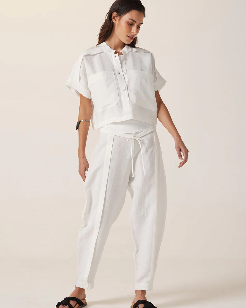 A Blusa Égide é um cropped amplo em linho. Possui gola fechada, abertura frontal estilo carcela e dois bolsos grandes aplicados. Os botões são forrados no próprio tecido.