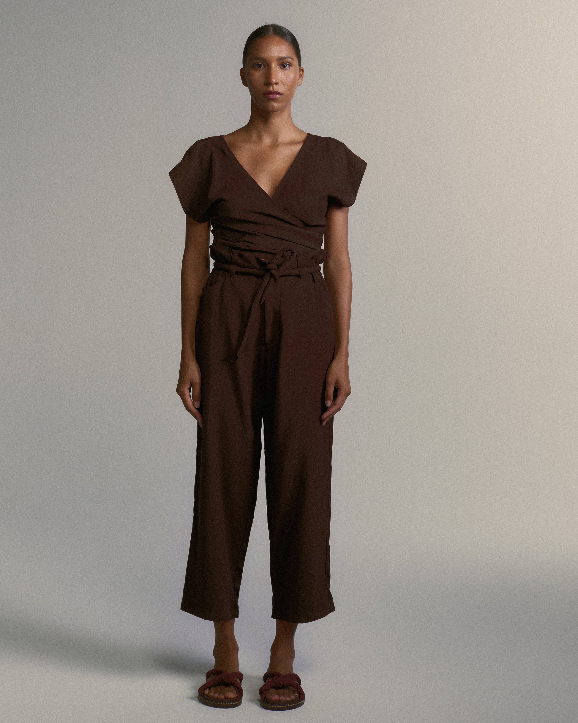 Blusa Geia é um cropped de Tencel com mangas curtas japonesas e amarração regulável, que permite diferentes formas de uso - com decote fechado na frente e em V nas costas, torção frontal, nó ou envelope.