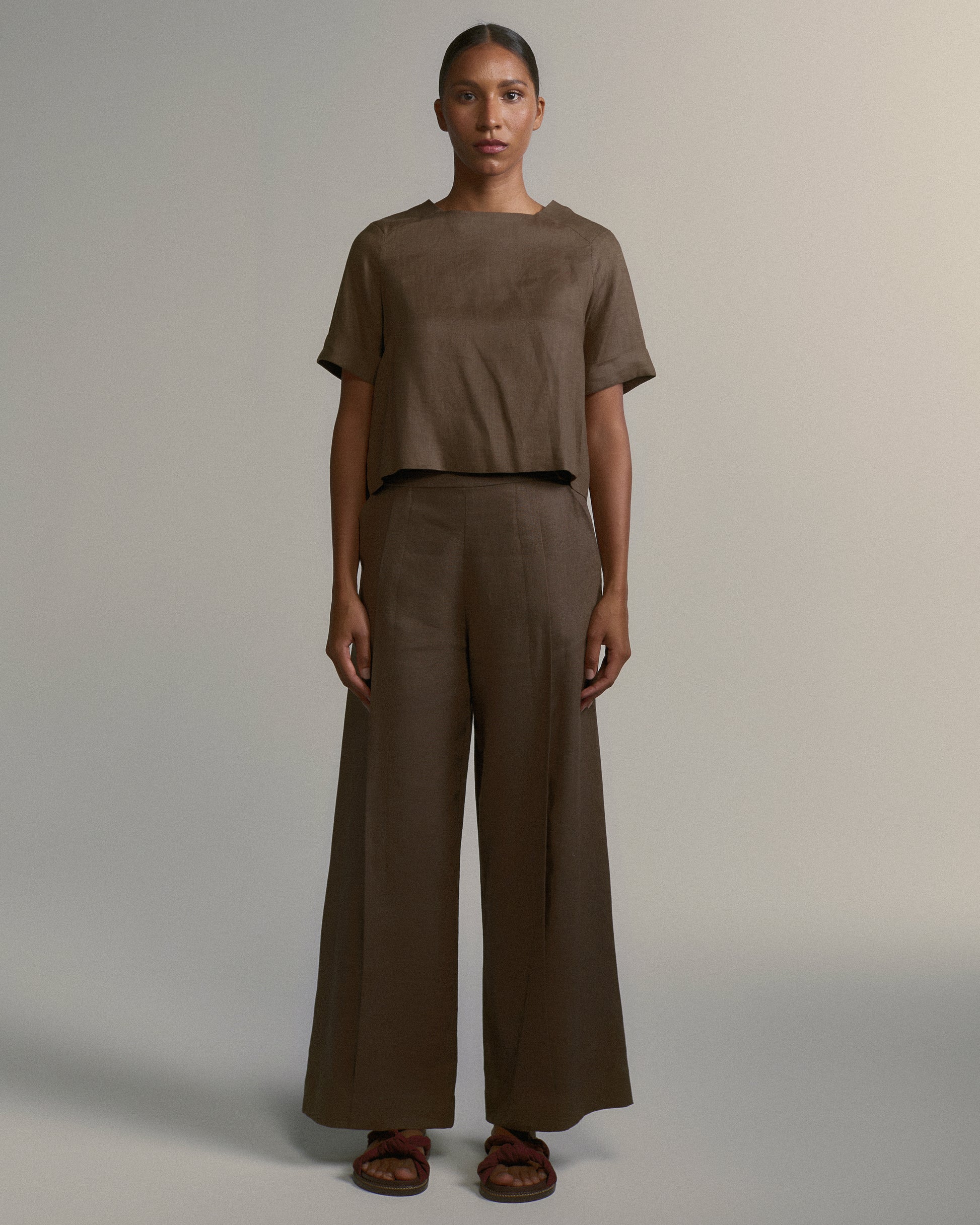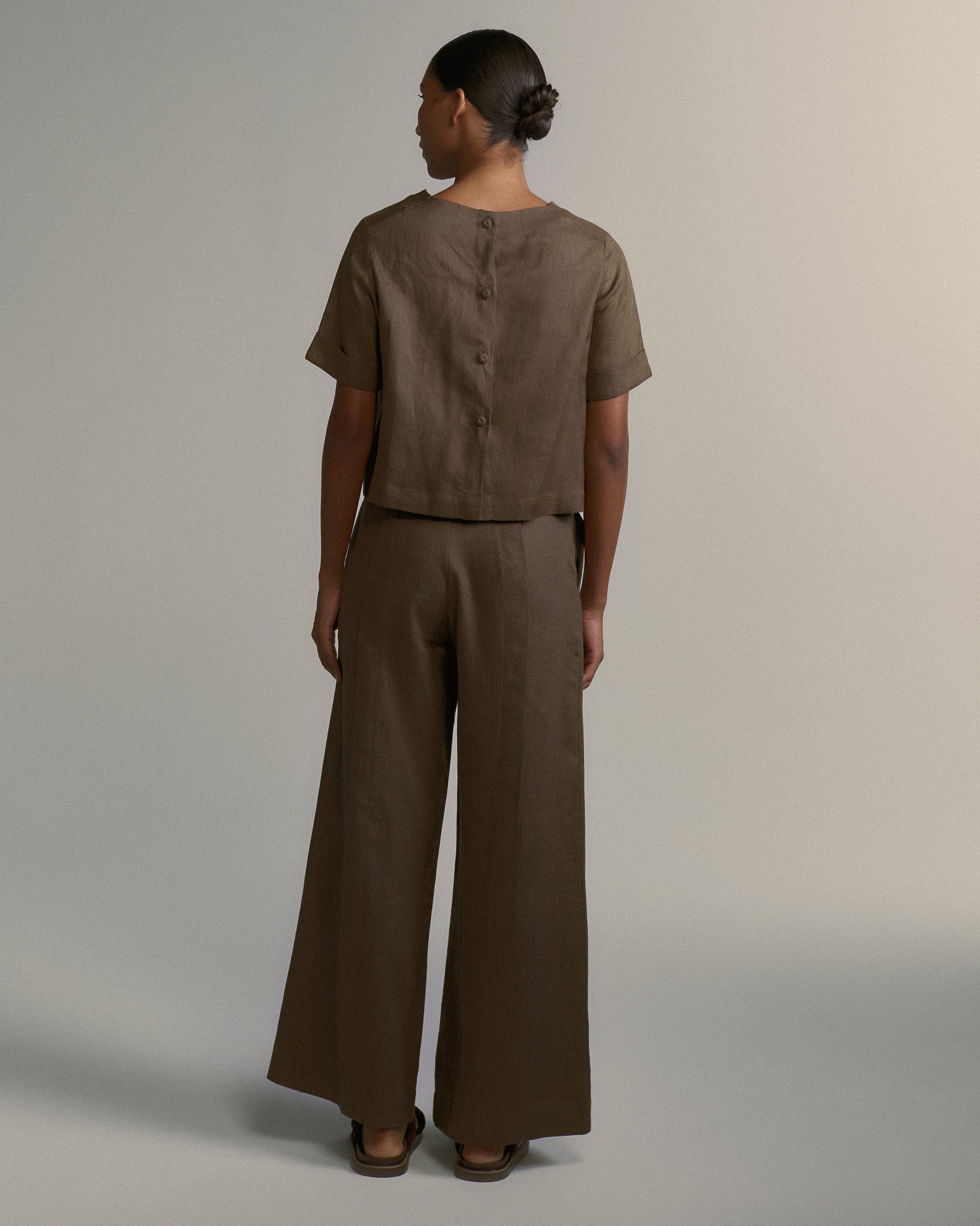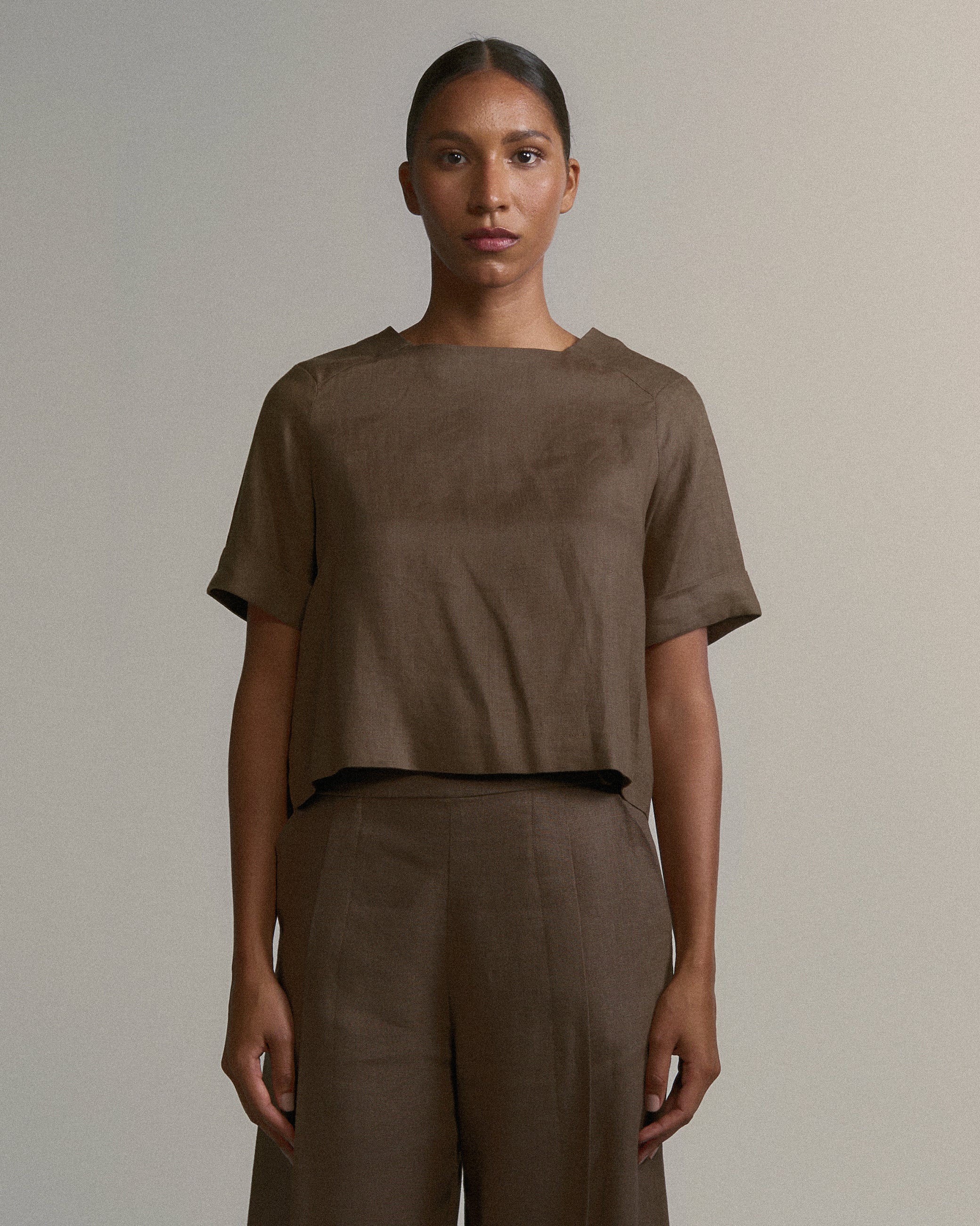 A Blusa Hexágono é feita em linho, com decote fechado e modelagem solta. Possui recorte nos ombros que cria detalhe geométrico na manga e barra italiana. Nas costas, conta com abertura de botões e acabamento interno em revel recoberto.
