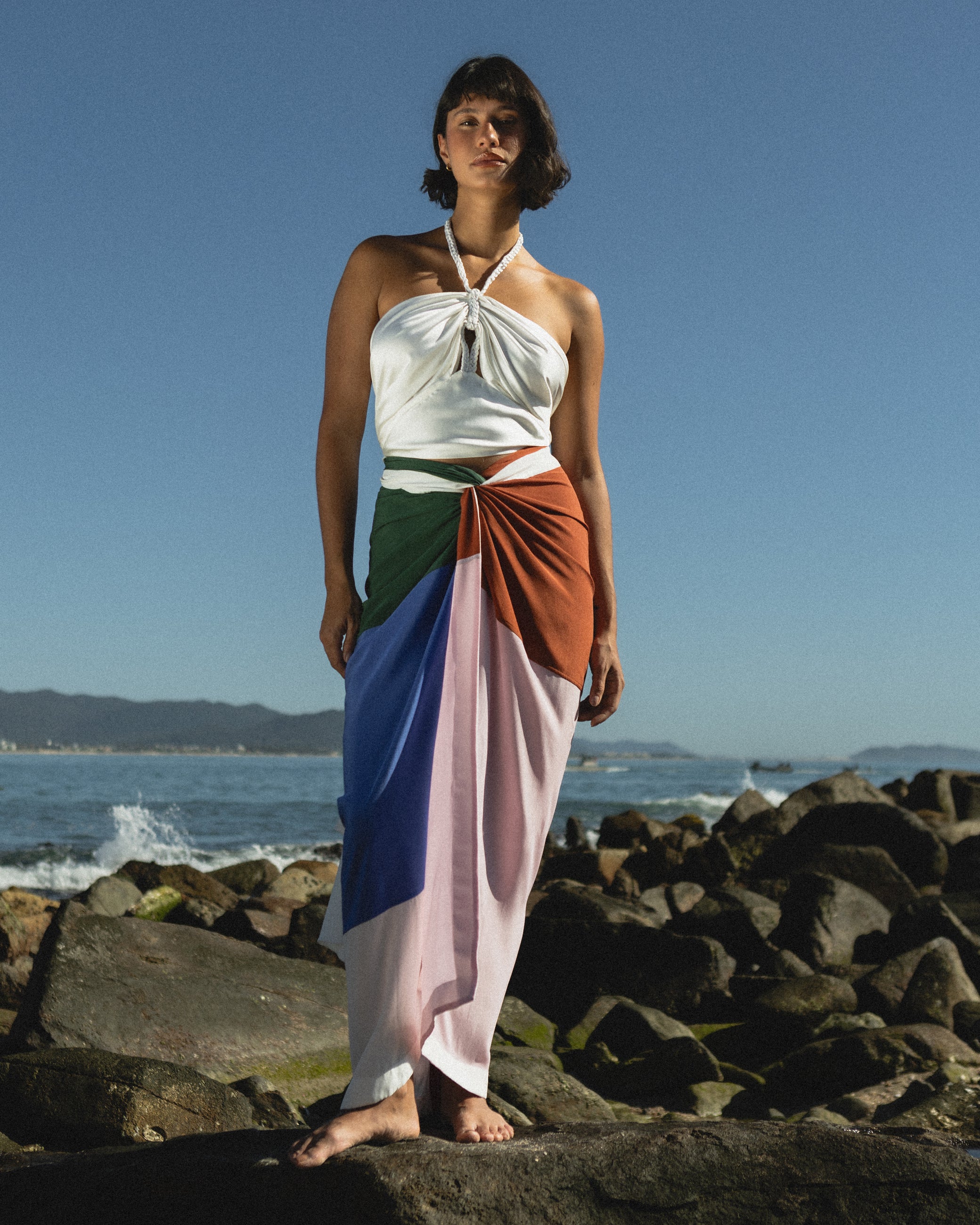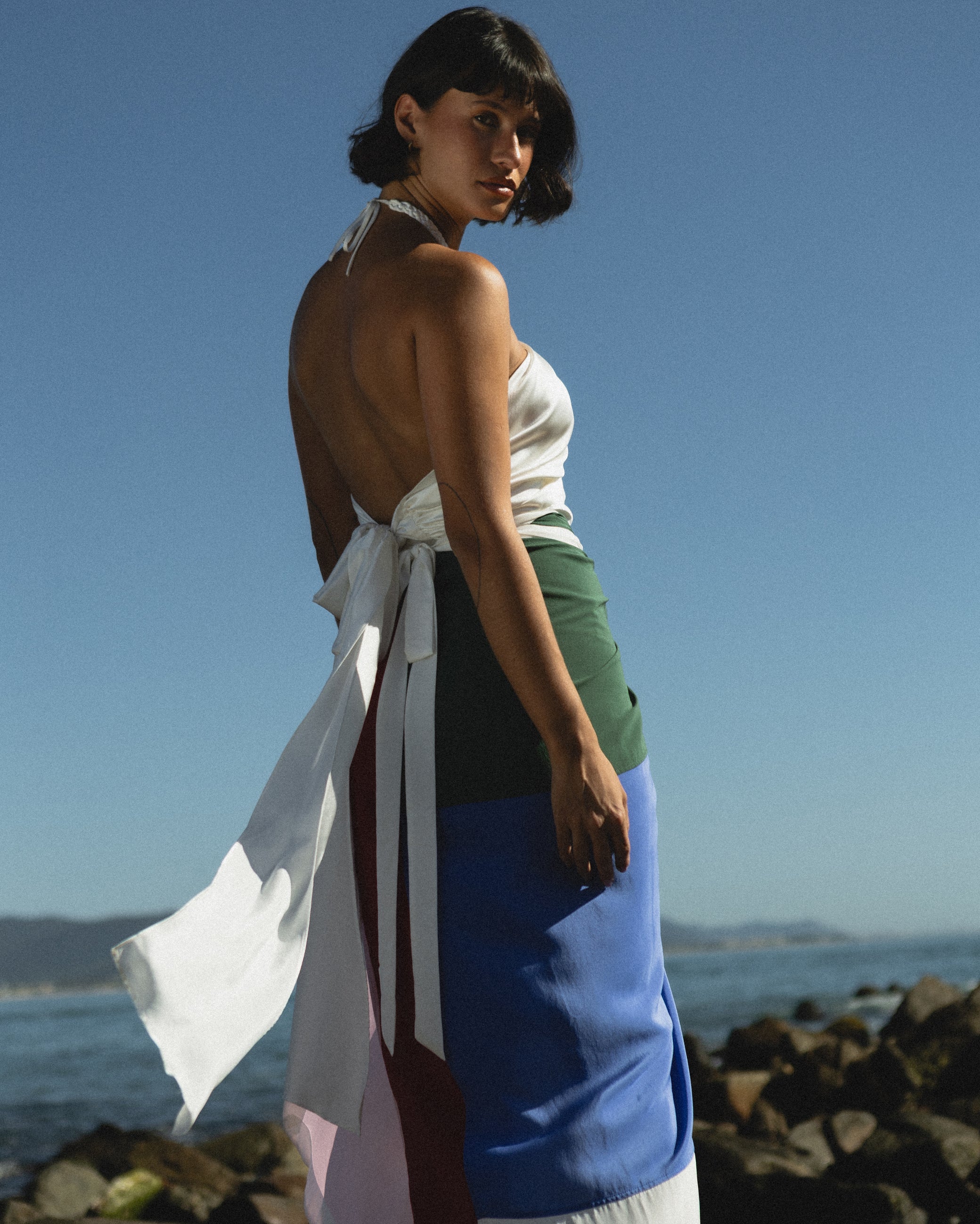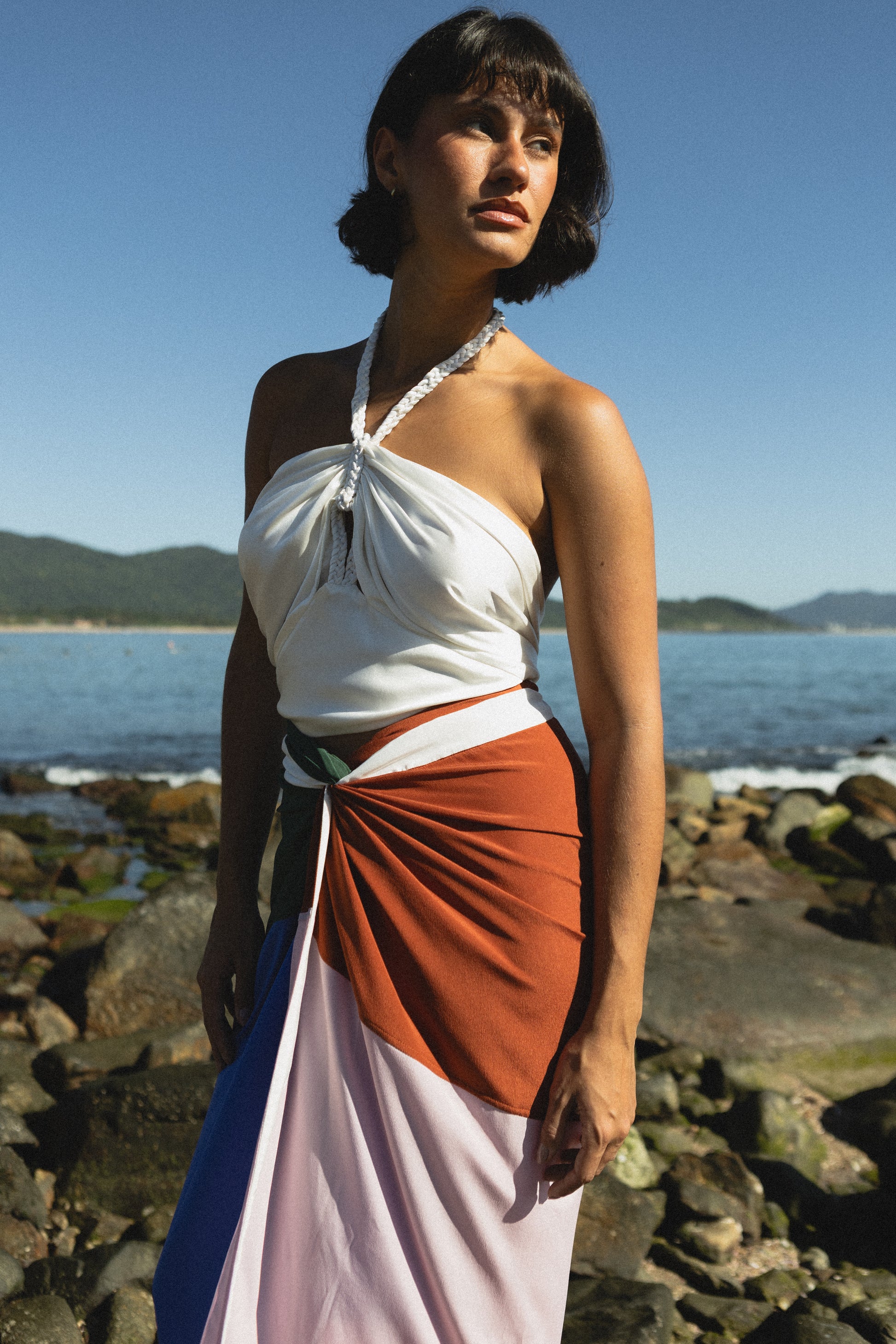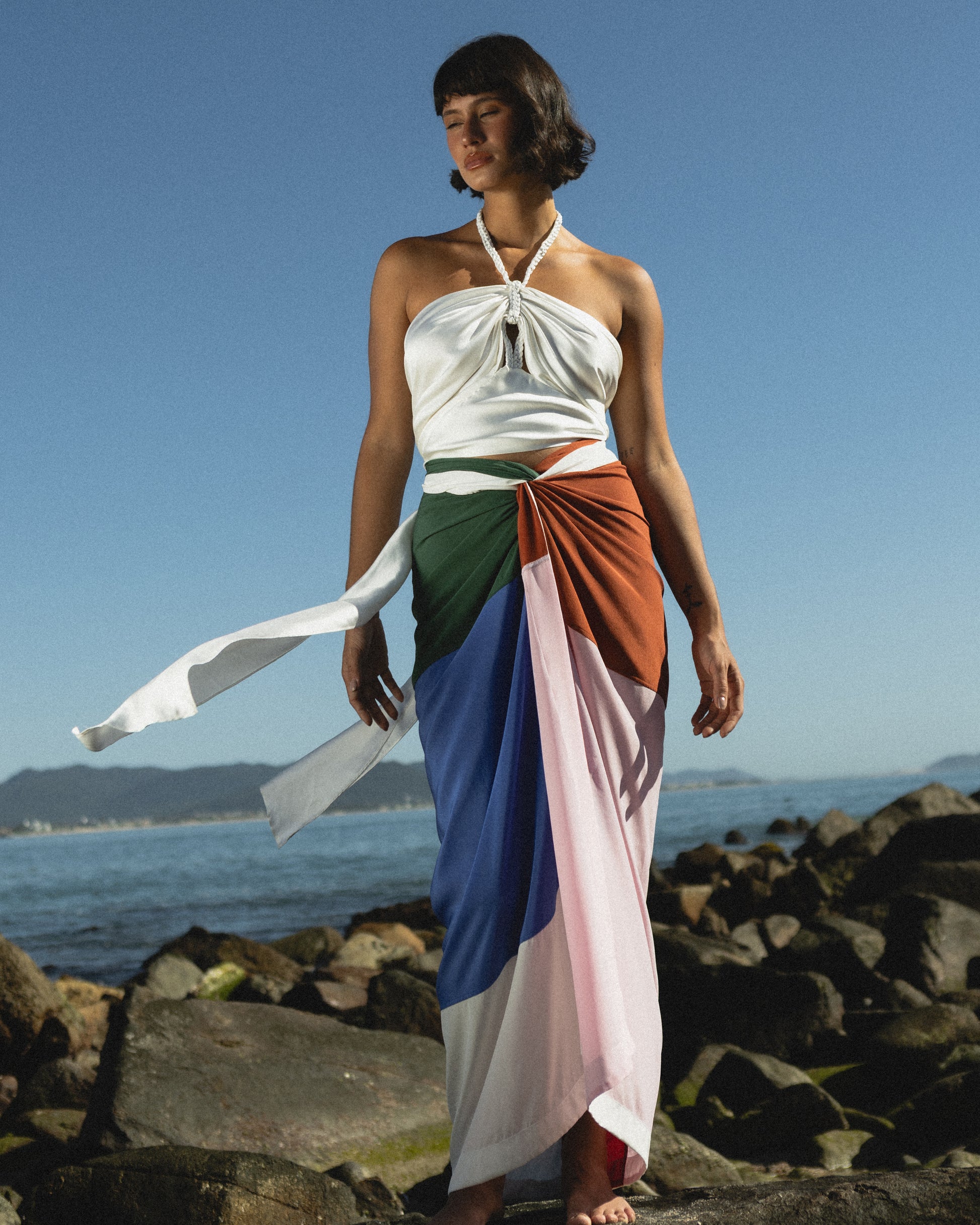 A Blusa Nicinha é confeccionada em cetim de seda pura, com trança manual em rolotê no busto e grande amarração frontal em moulage. Sofisticada e trabalhada, é indicada para festas e ocasiões especiais.