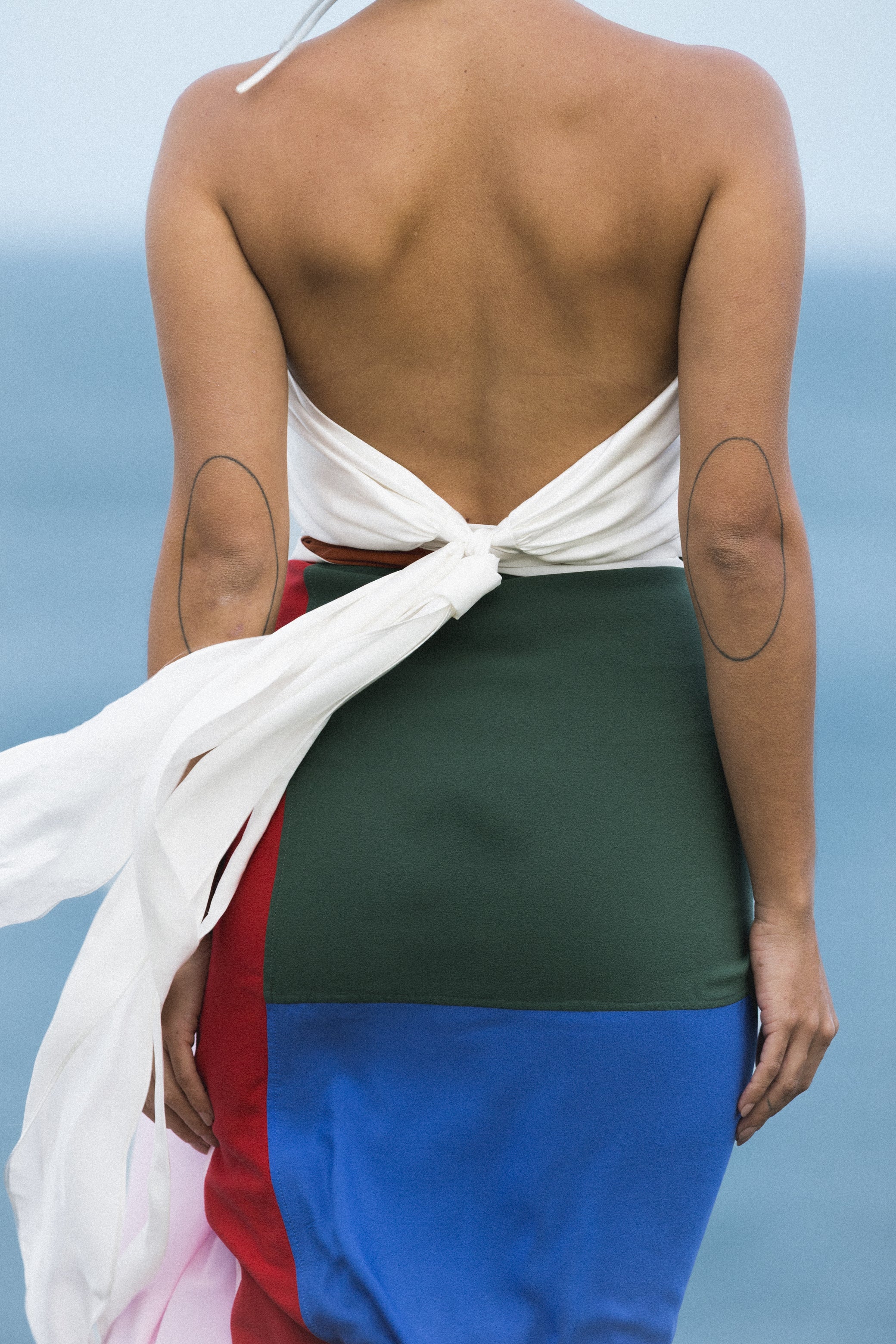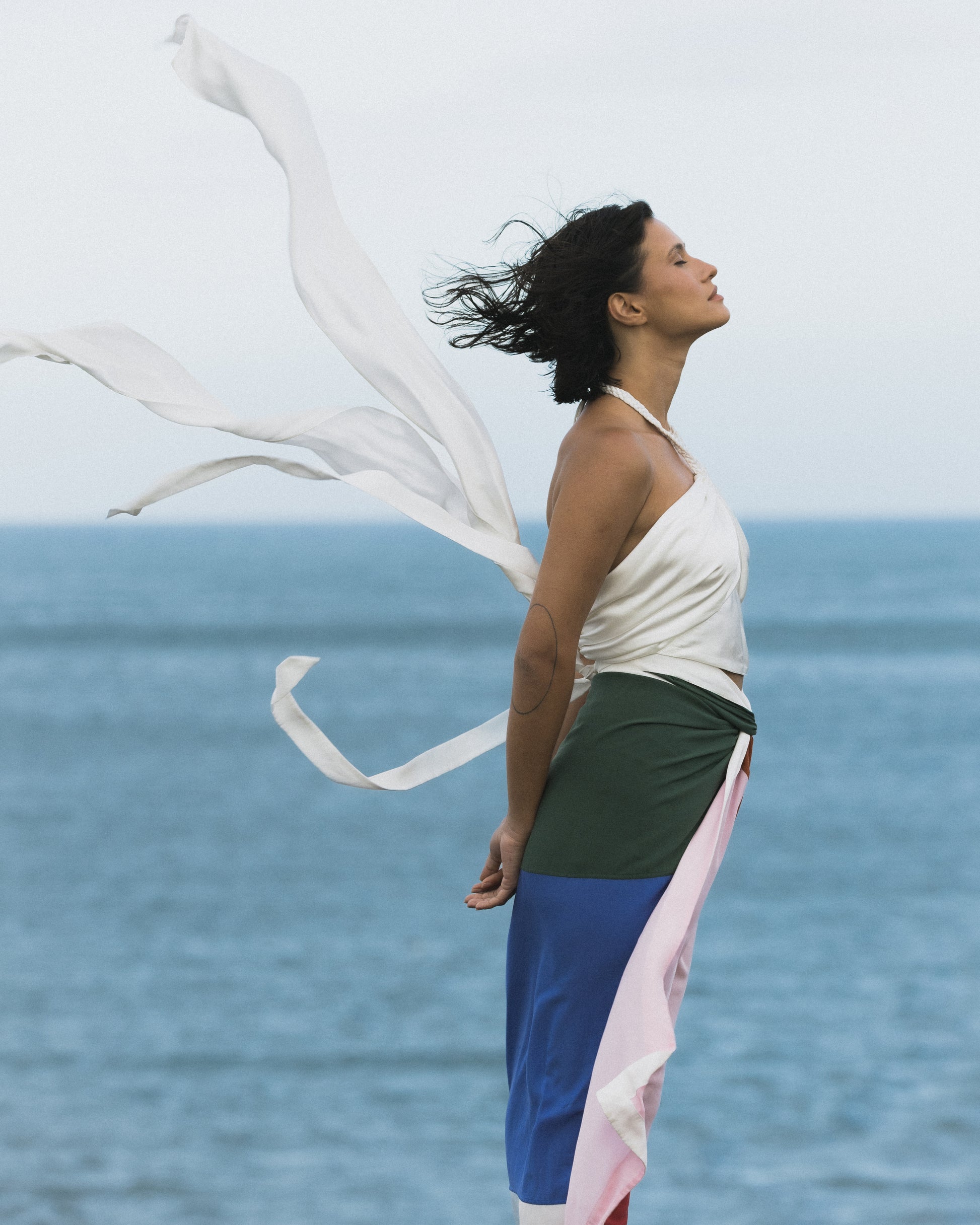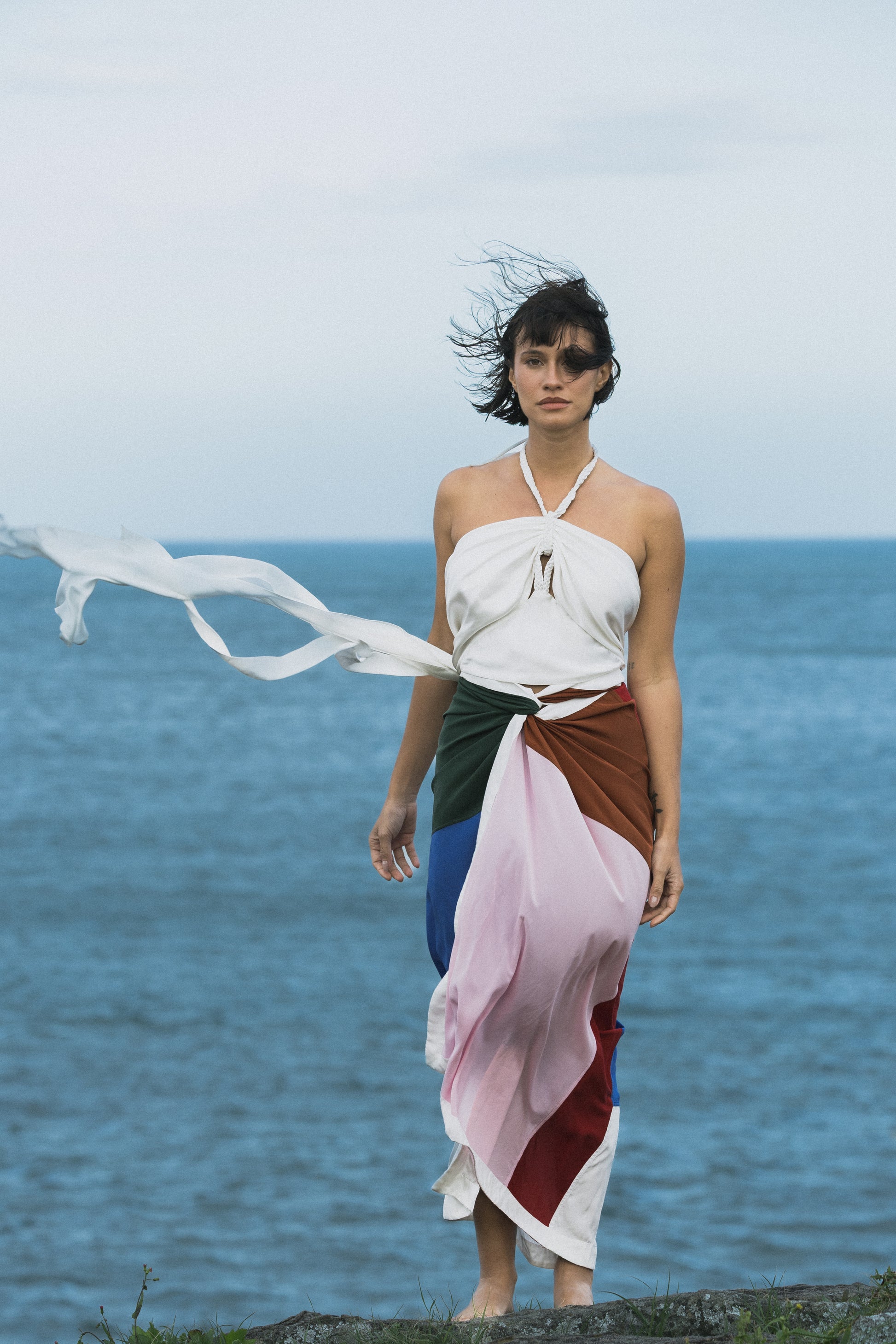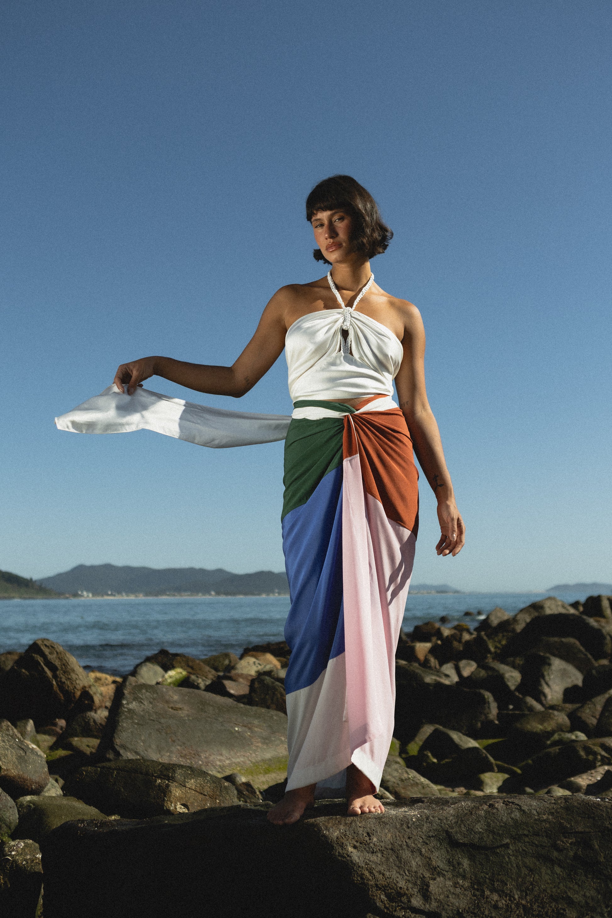 A Blusa Nicinha é confeccionada em cetim de seda pura, com trança manual em rolotê no busto e grande amarração frontal em moulage. Sofisticada e trabalhada, é indicada para festas e ocasiões especiais.