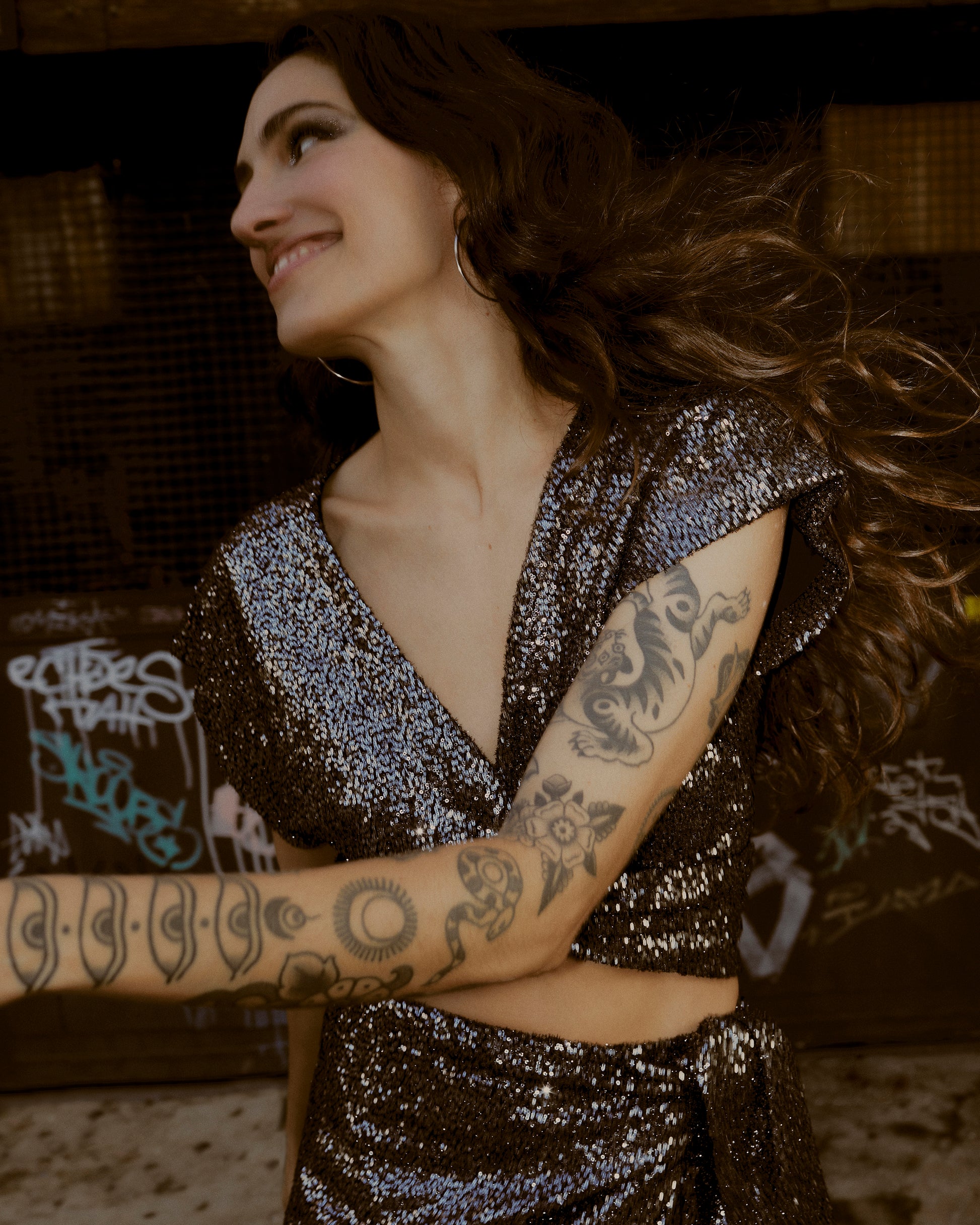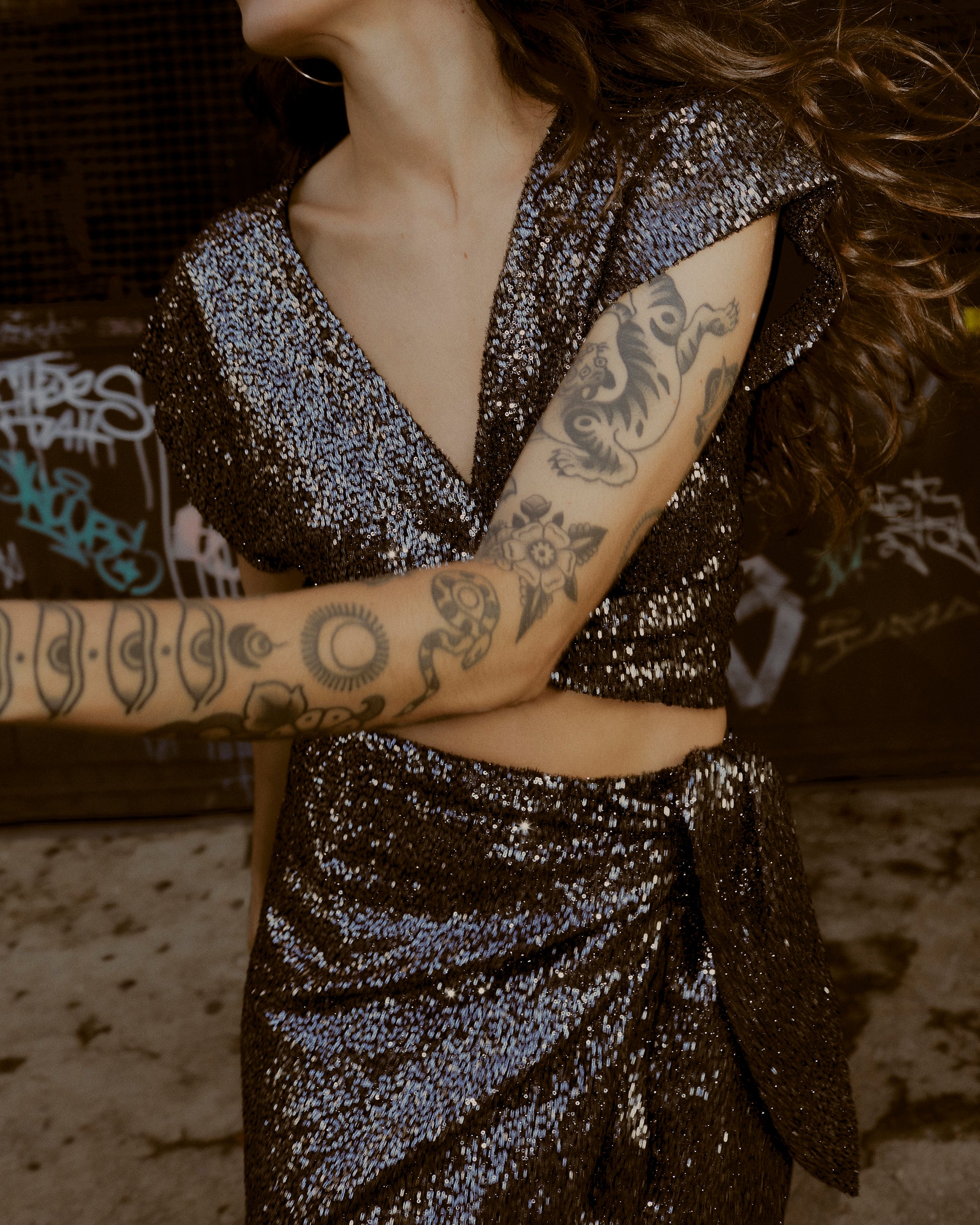 Cropped de amarrar com mangas japonesas curtas, a Blusa Sônia oferece versatilidade em três formas de uso: torção, nó ou envelope. Confeccionada em paetê prata e forrada em viscose, une conforto e brilho