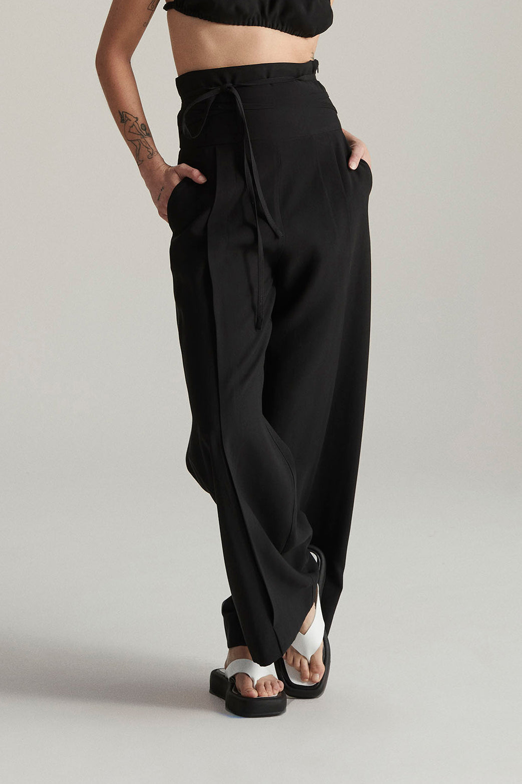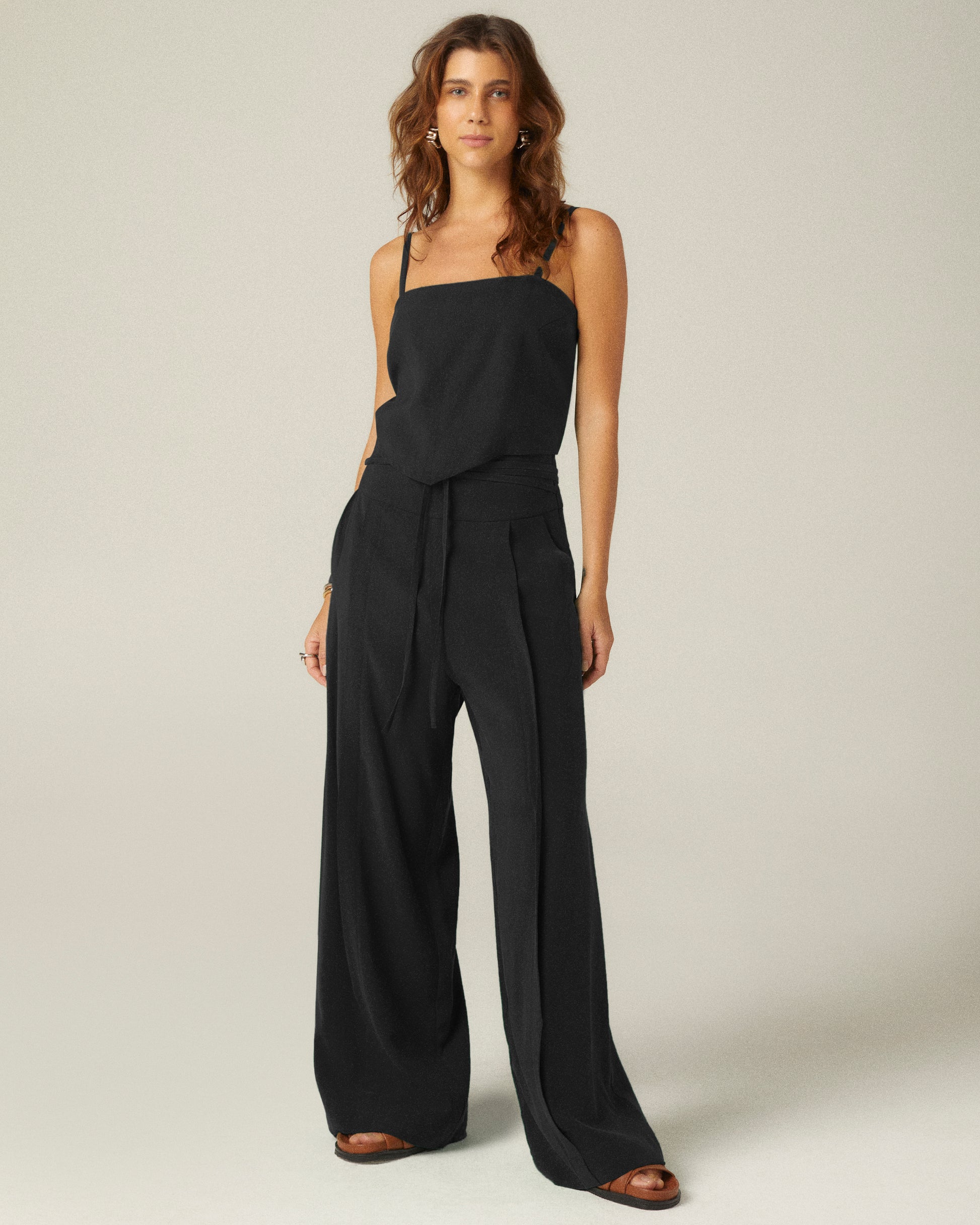 A Calça Alta é uma pantalona de linho com cintura bem alta, cós duplo e entretelado. Possui pregas nas pernas, bolsos laterais e fechamento em zíper invisível. Vem acompanhada de corda dupla para amarração na cintura.