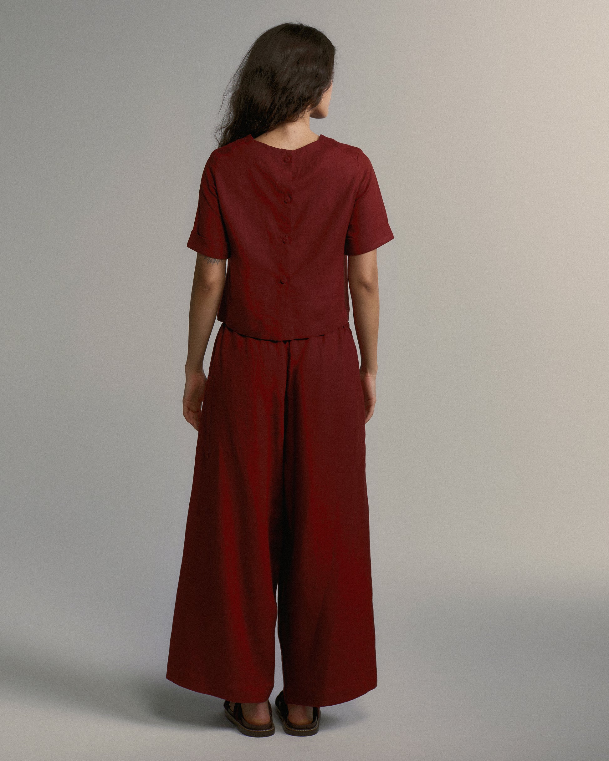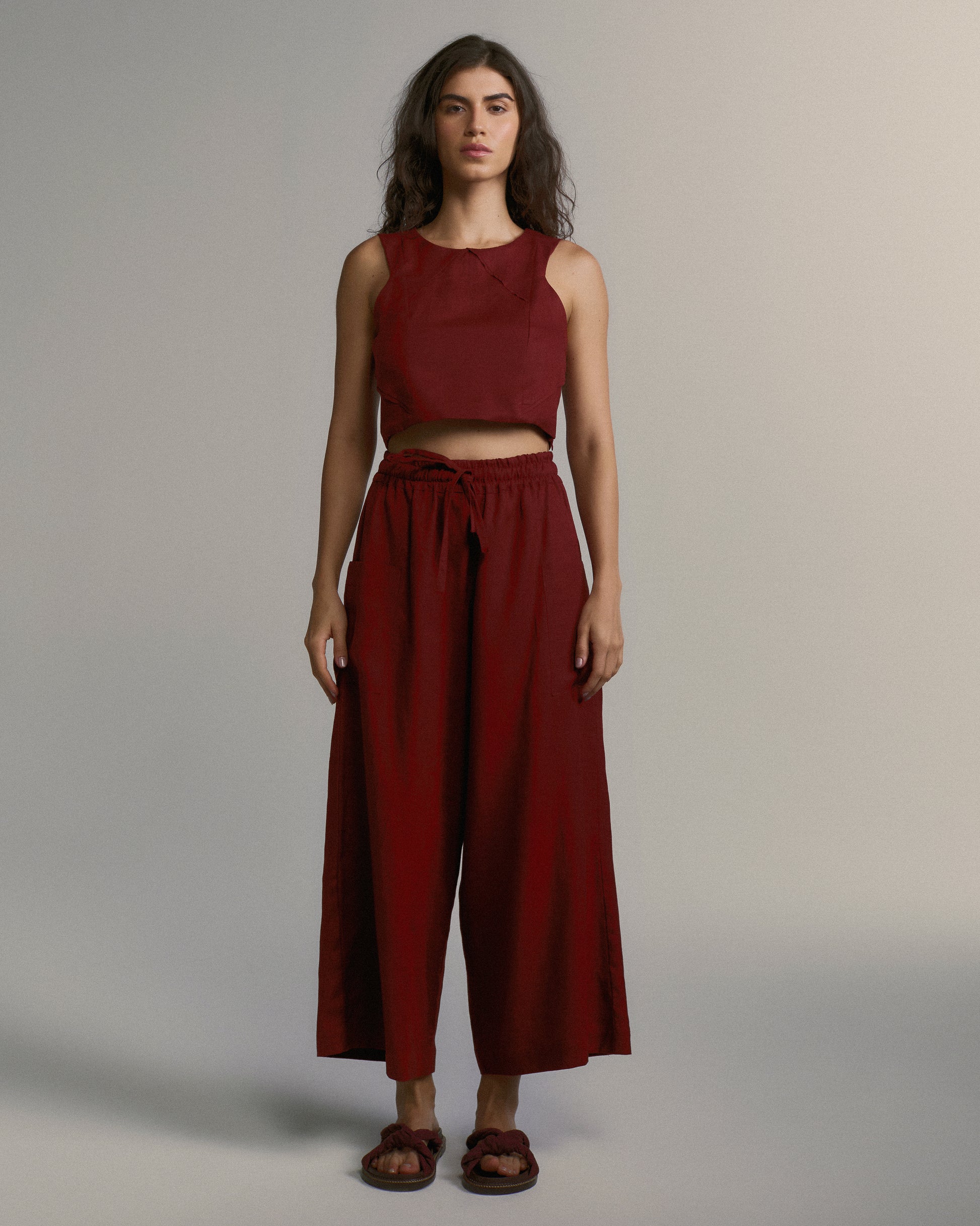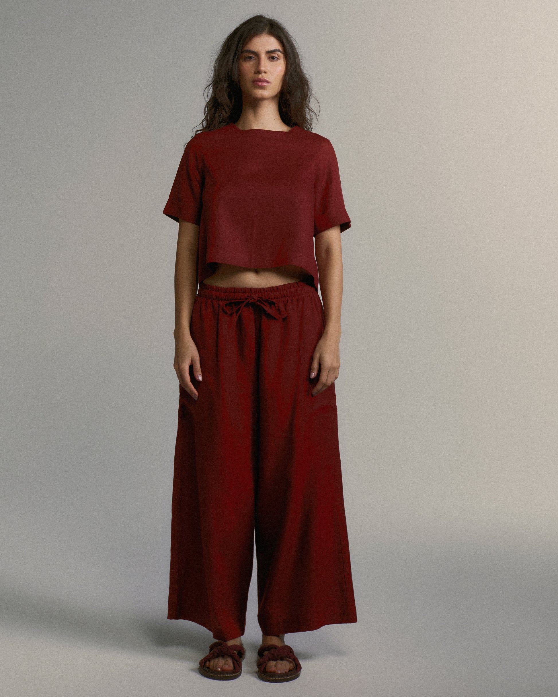 A Calça Álvaro é unissex, larga e confortável, confeccionada em cambraia de linho. Possui elástico e amarração na cintura, bolsos baixos e comprimento no tornozelo.