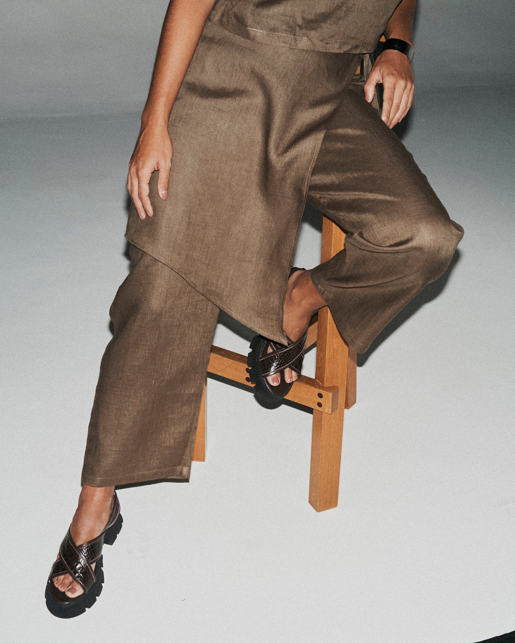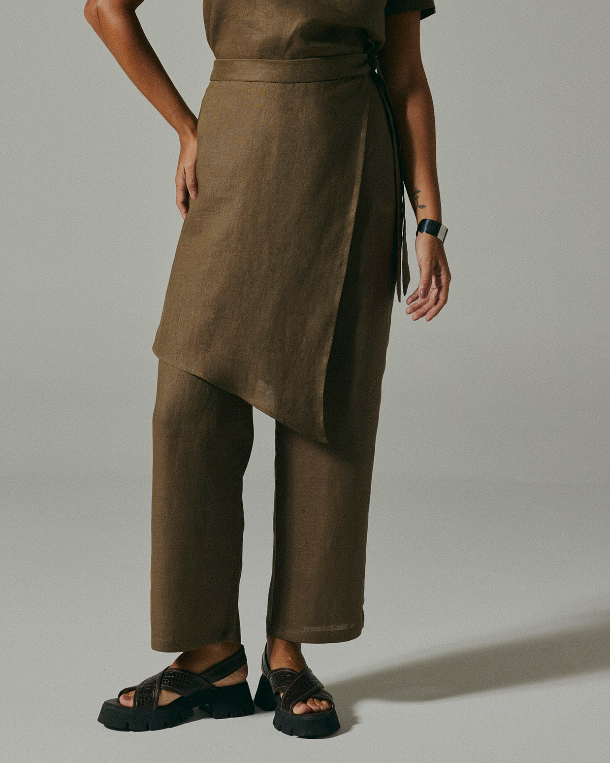 Calça de modelagem solta, com comprimento na altura do tornozelo. Possui sobreposição assimétrica em forma de saia, que desenha uma meia-lua na parte frontal. Acompanha cinto que se sobrepõe ao fechamento em zíper invisível.