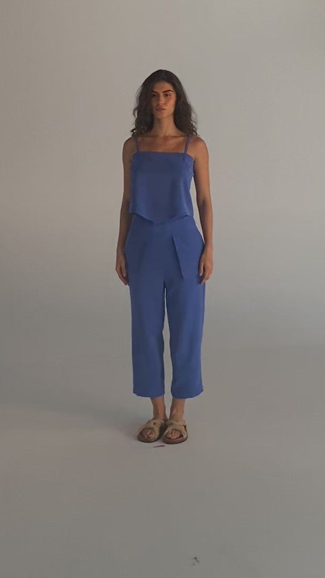 A Calça Mar é um modelo solto, tipo pescador, com cós alto anatômico e comprimento no tornozelo. Possui fechamento traseiro em zíper invisível, bolsos sobrepostos e cordinha de amarração frontal.