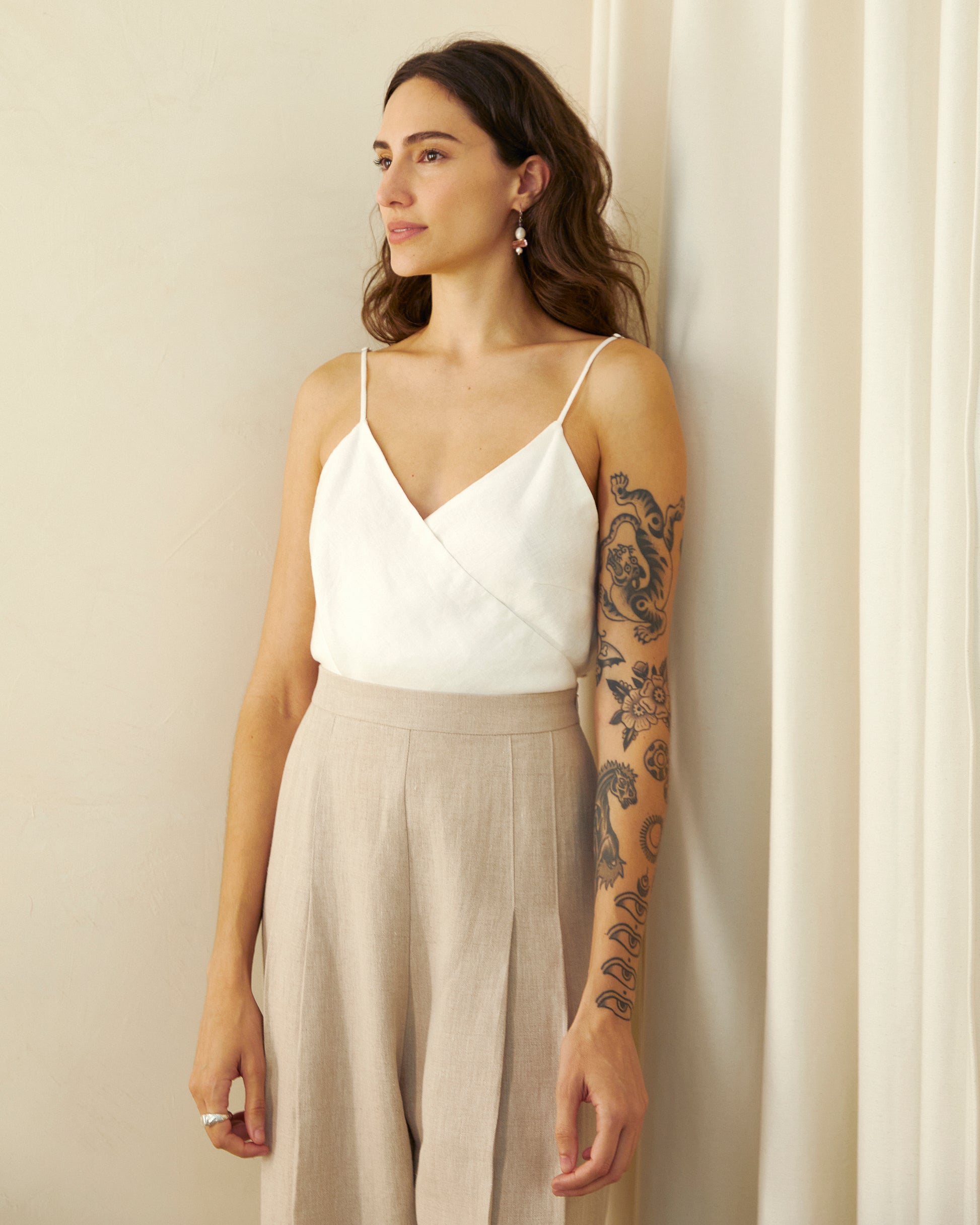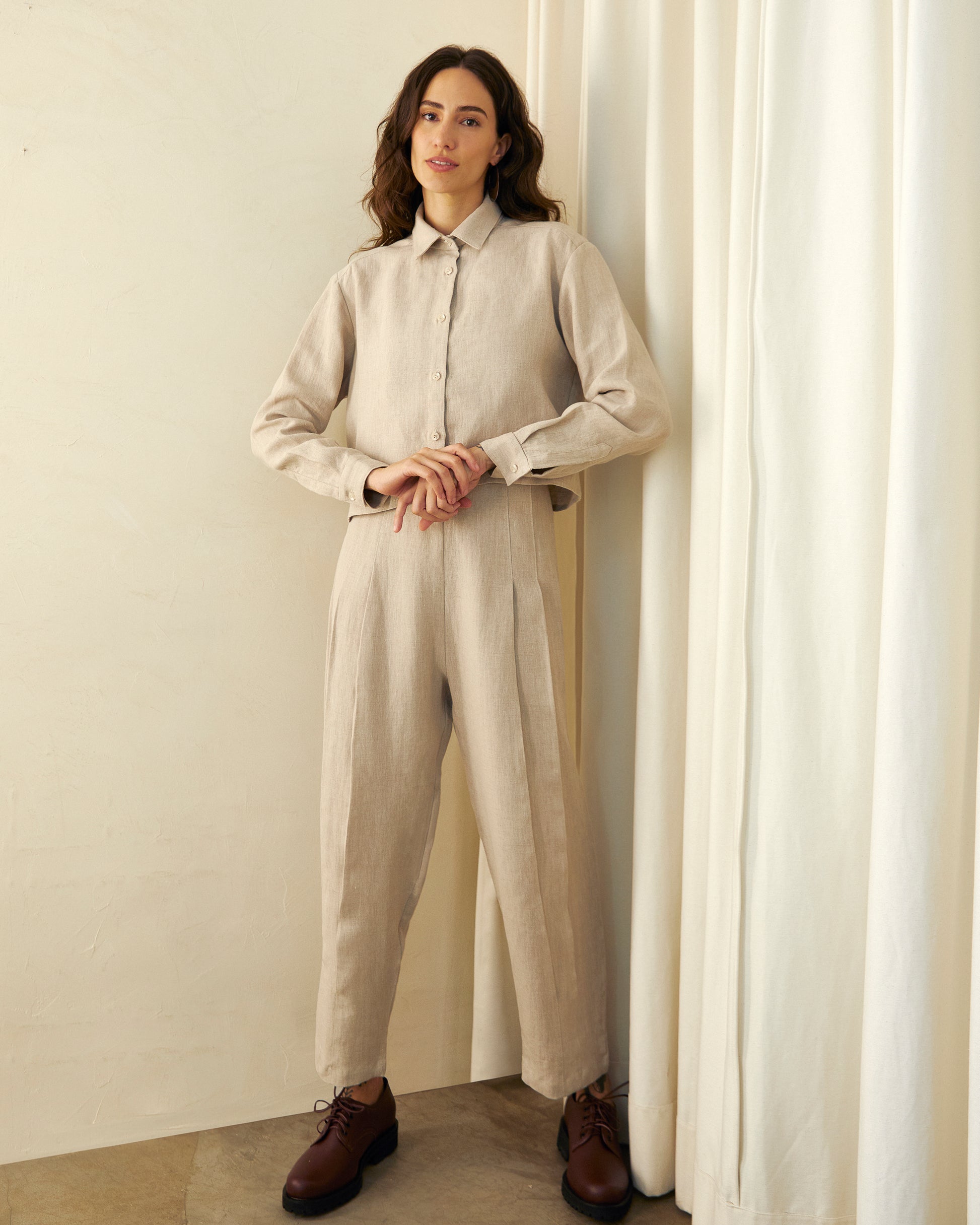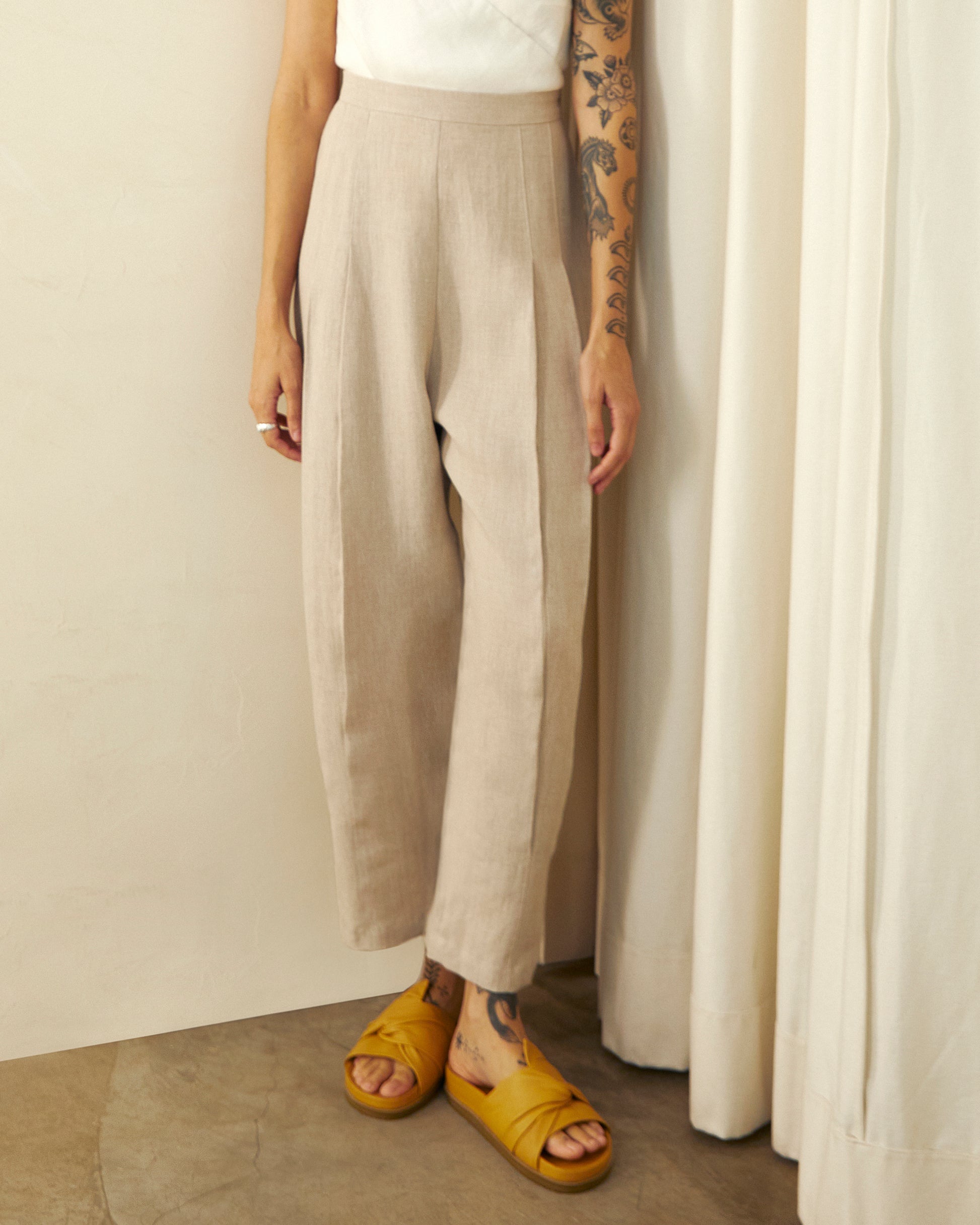 A Calça Maravilha tem cintura alta e cós fino. De modelagem levemente abaulada, apresenta pregas rebatidas na frente que criam detalhe sutil. Possui fechamento lateral em zíper invisível e é confeccionada em linho puro. Peça perfeita para festas e ocasiões.