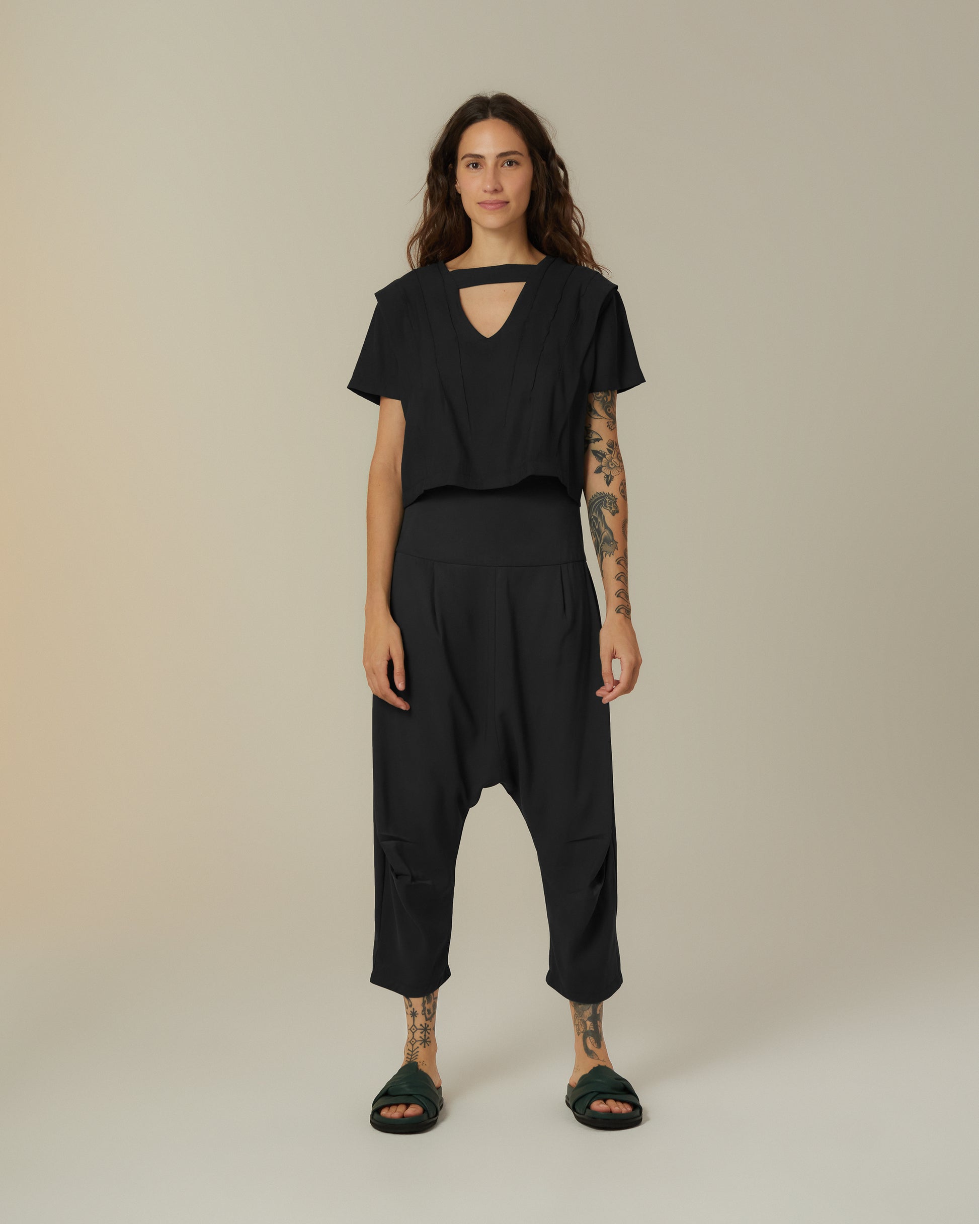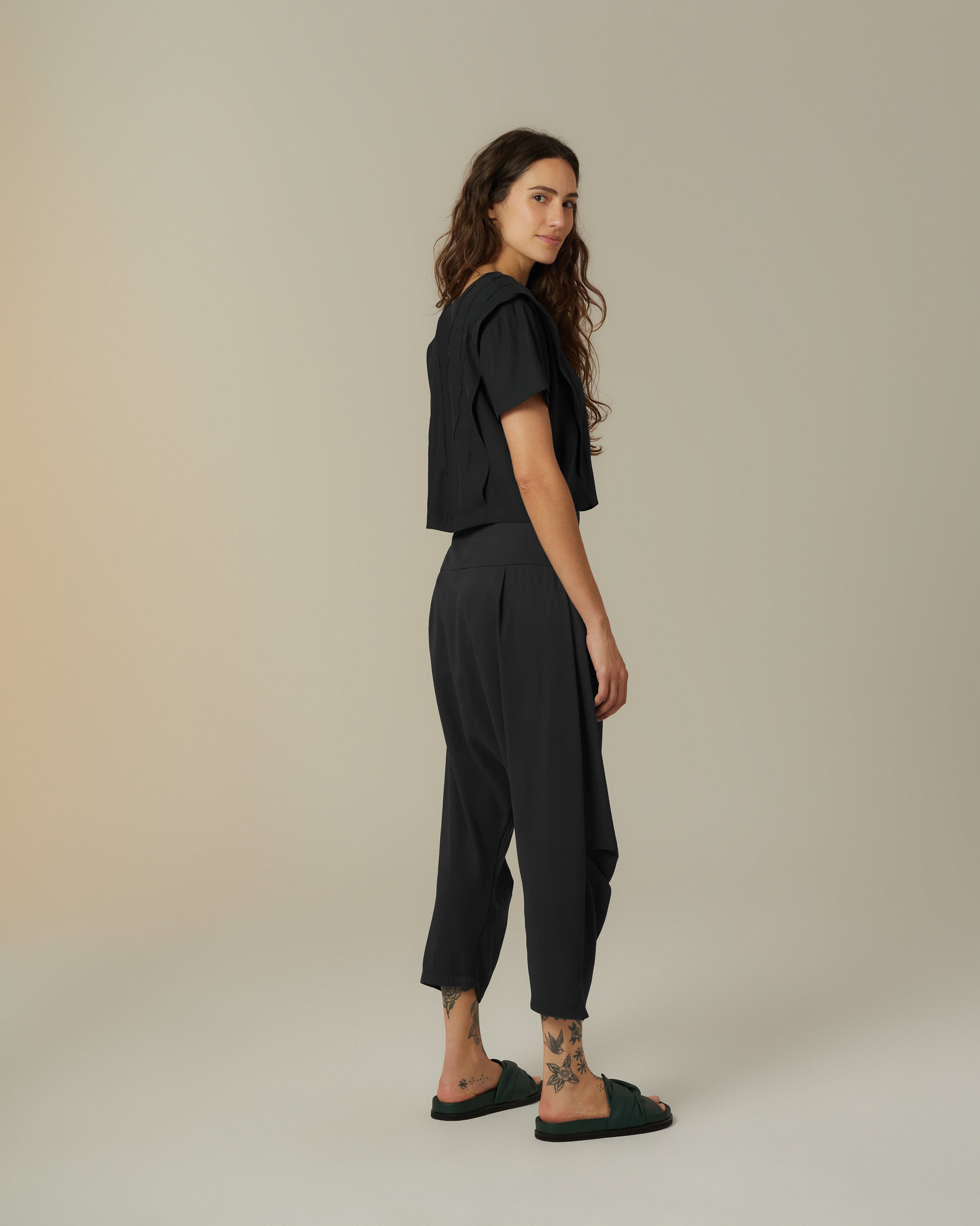 A Calça Saruel tem cintura alta, cós largo e pregas nos joelhos para facilitar o movimento. O fechamento é lateral, em zíper invisível. Combina bem com blusas cropped, formando conjuntos.