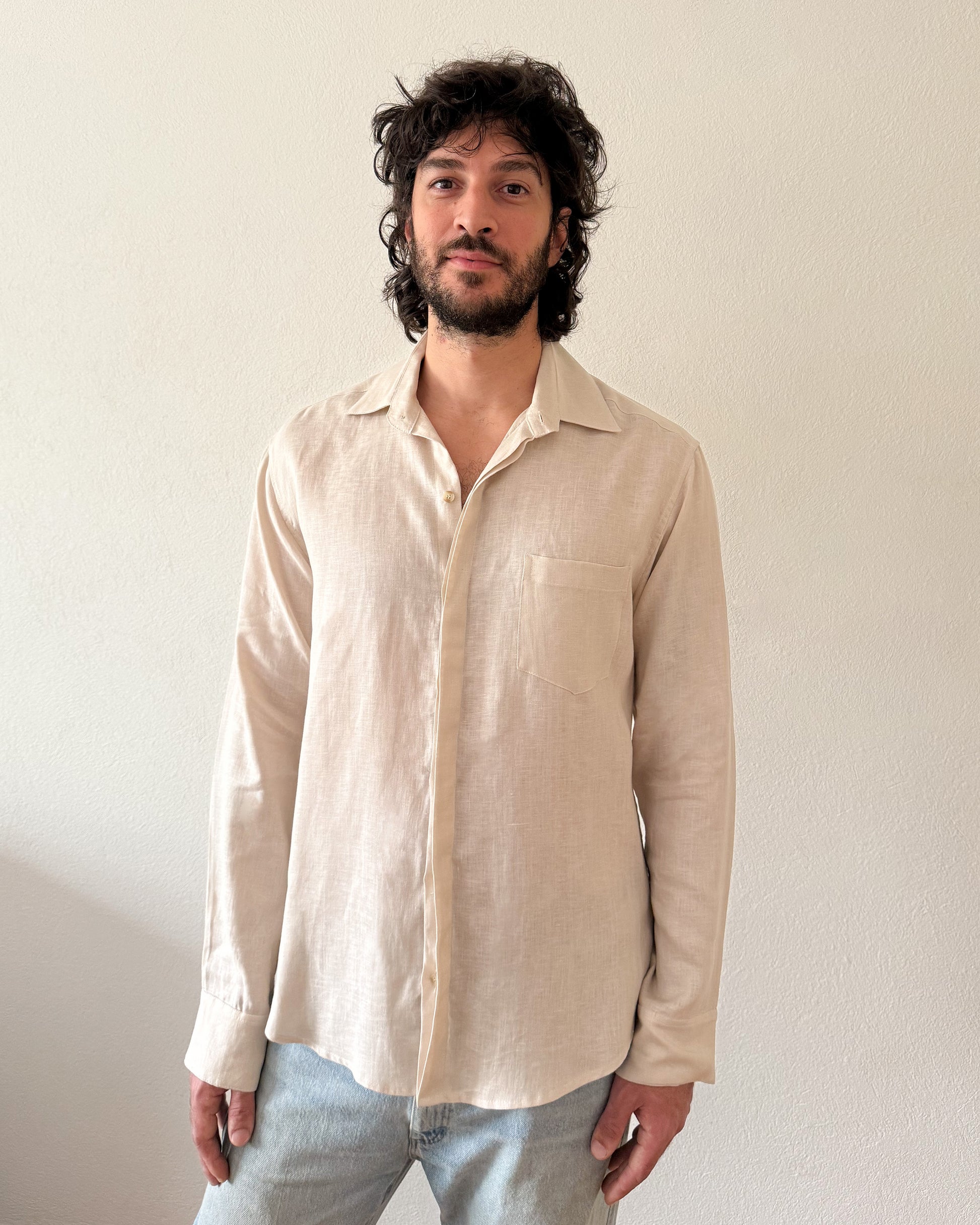 A Camisa Gabriel é uma peça masculina de linho, reta e solta. Possui gola tradicional com carcela, mangas longas e bolso frontal, com botões ecológicos. Atemporal e versátil, é uma peça essencial.