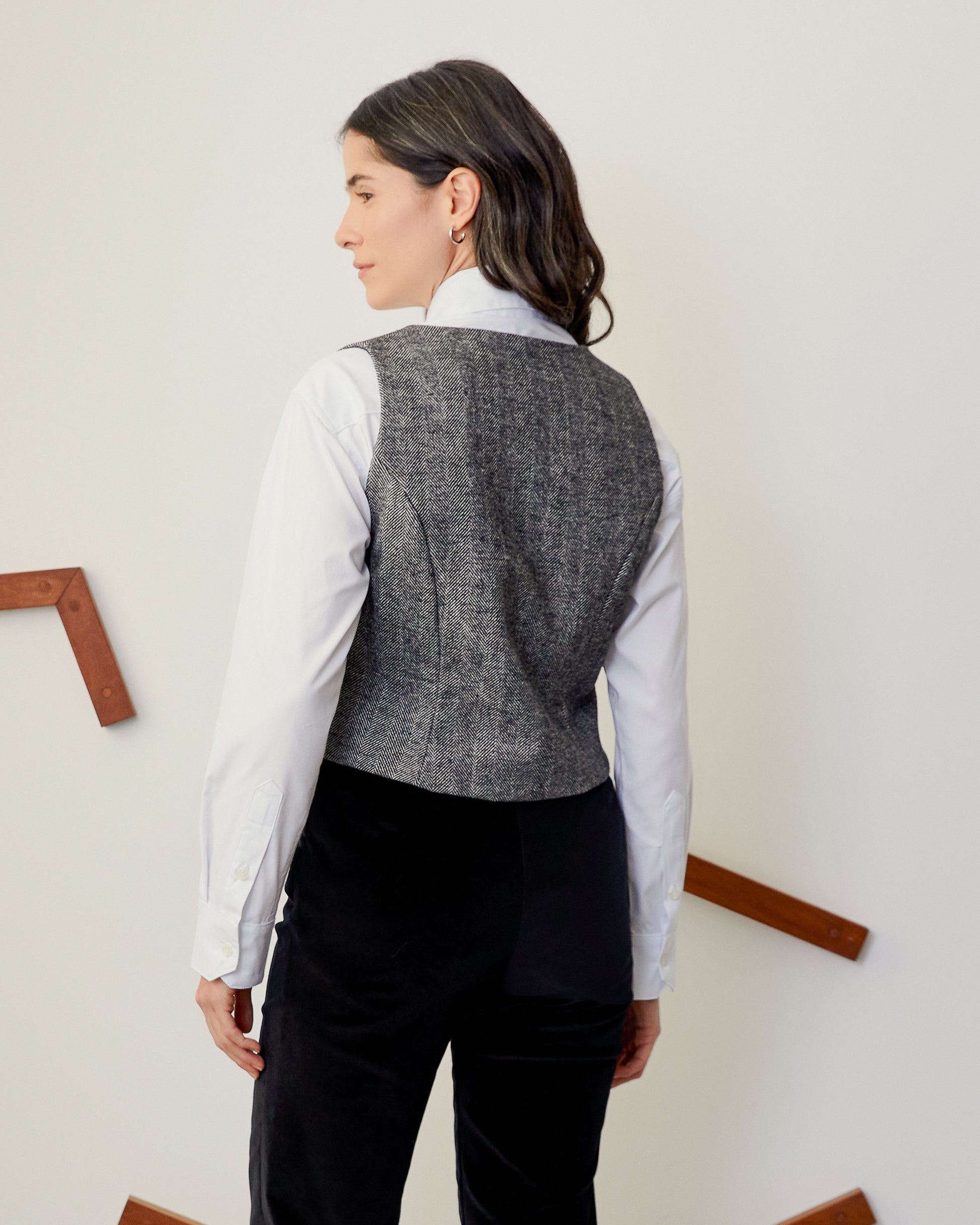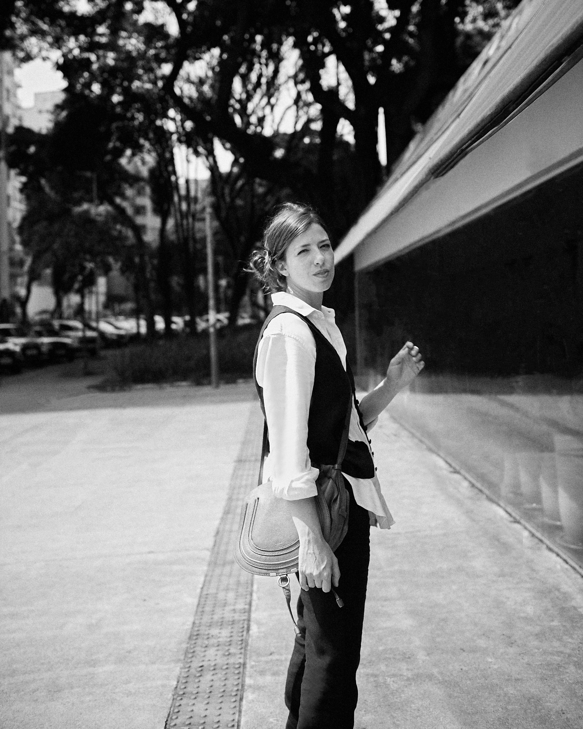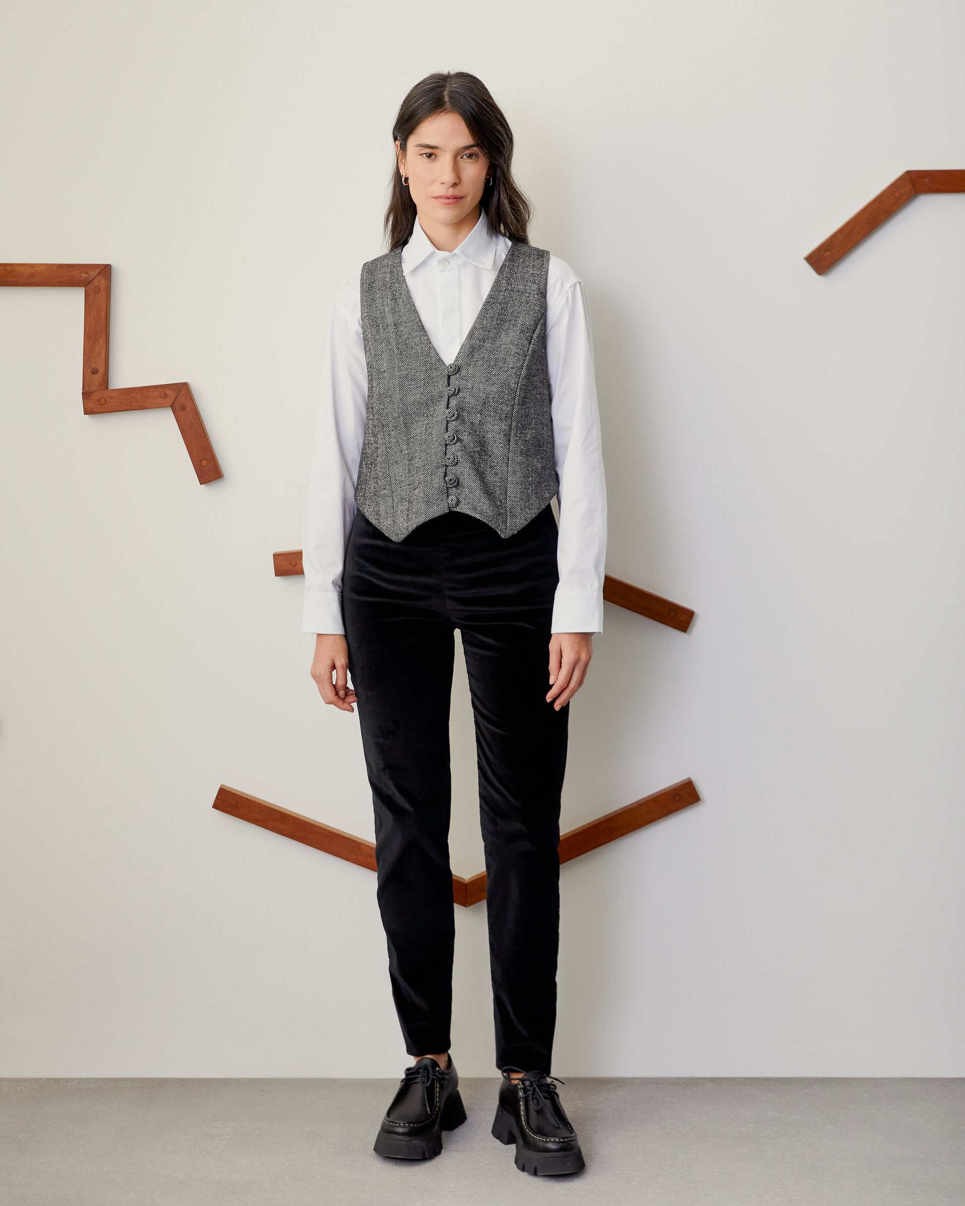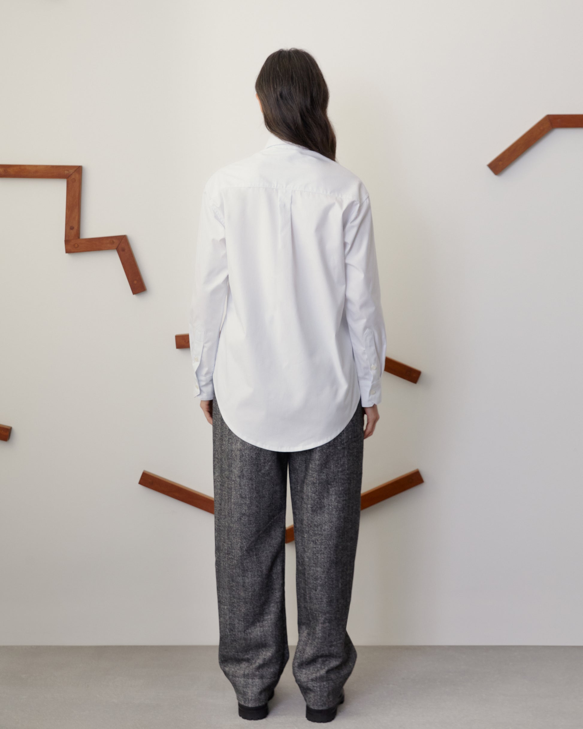 Patti é uma camisa clássica de punho, gola carcela, abaulada na parte do quadril. Apresenta um corte na lateral, que permite que se possa amarrá-la, também. É uma peça que possui características muito próprias da marca, ligadas ao fato de equilibrar os elementos feminino e masculino, o curto e o comprido, o fato de ser solta mas, ao mesmo tempo, delicada. Seus botões são ecológicos.