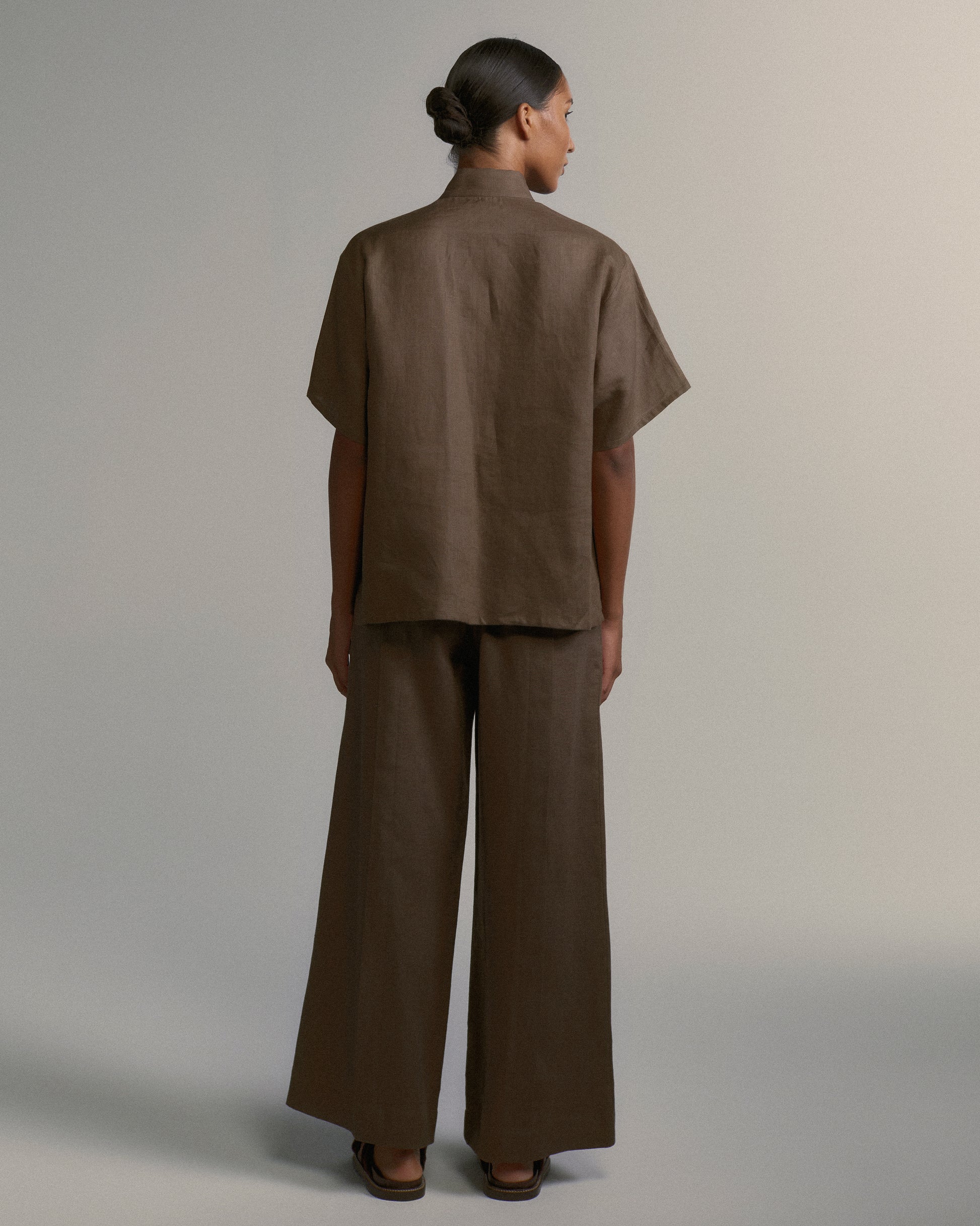 A Camisa Oriente é uma peça feminina de inspiração oriental. De manga curta e gola Mao Tse Tung, traz mangas de sino e fechamento por rolotê do próprio linho. Com fendas laterais, pode ser usada fechada, no estilo túnica, ou aberta, como um casaco leve.