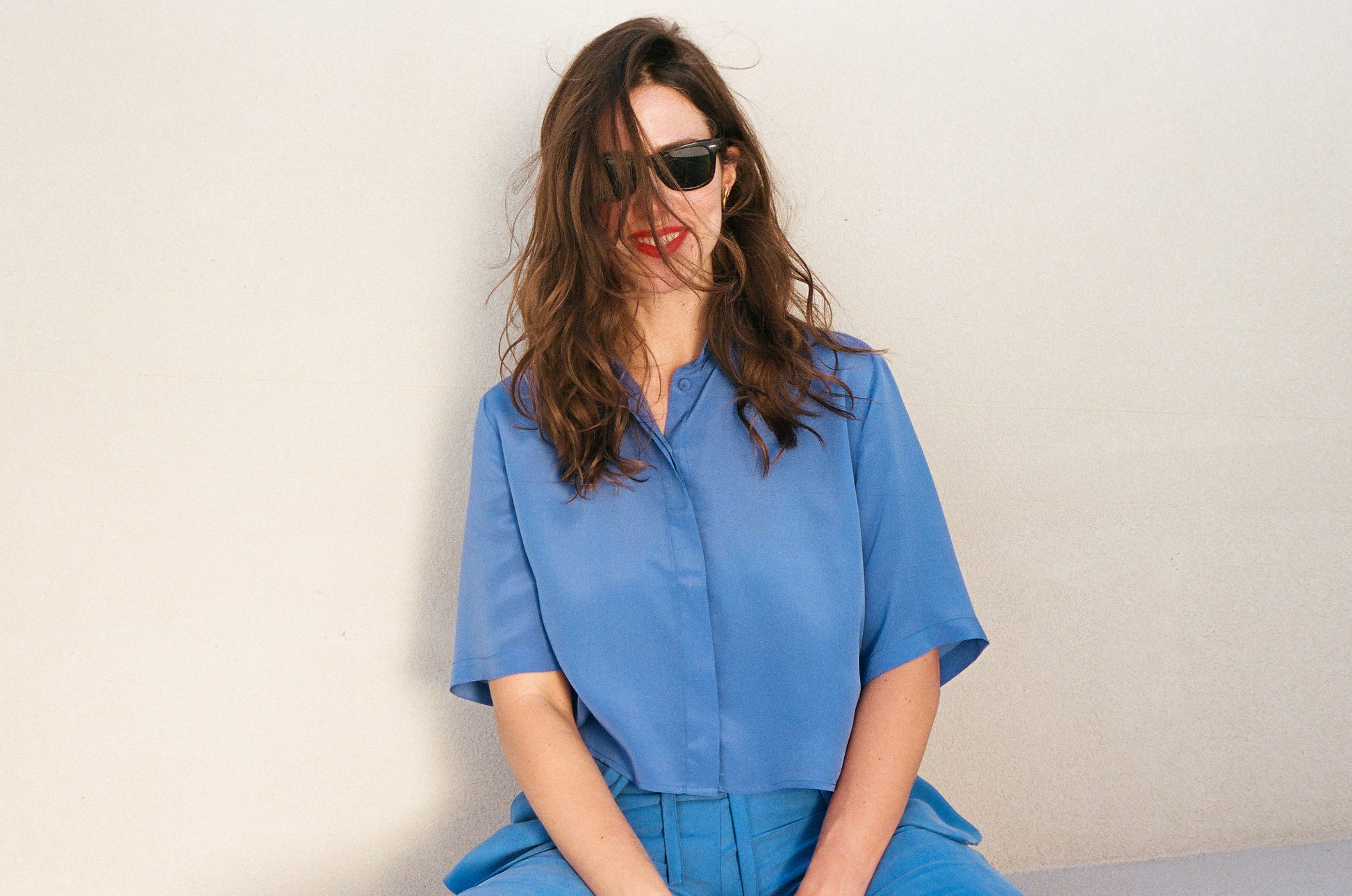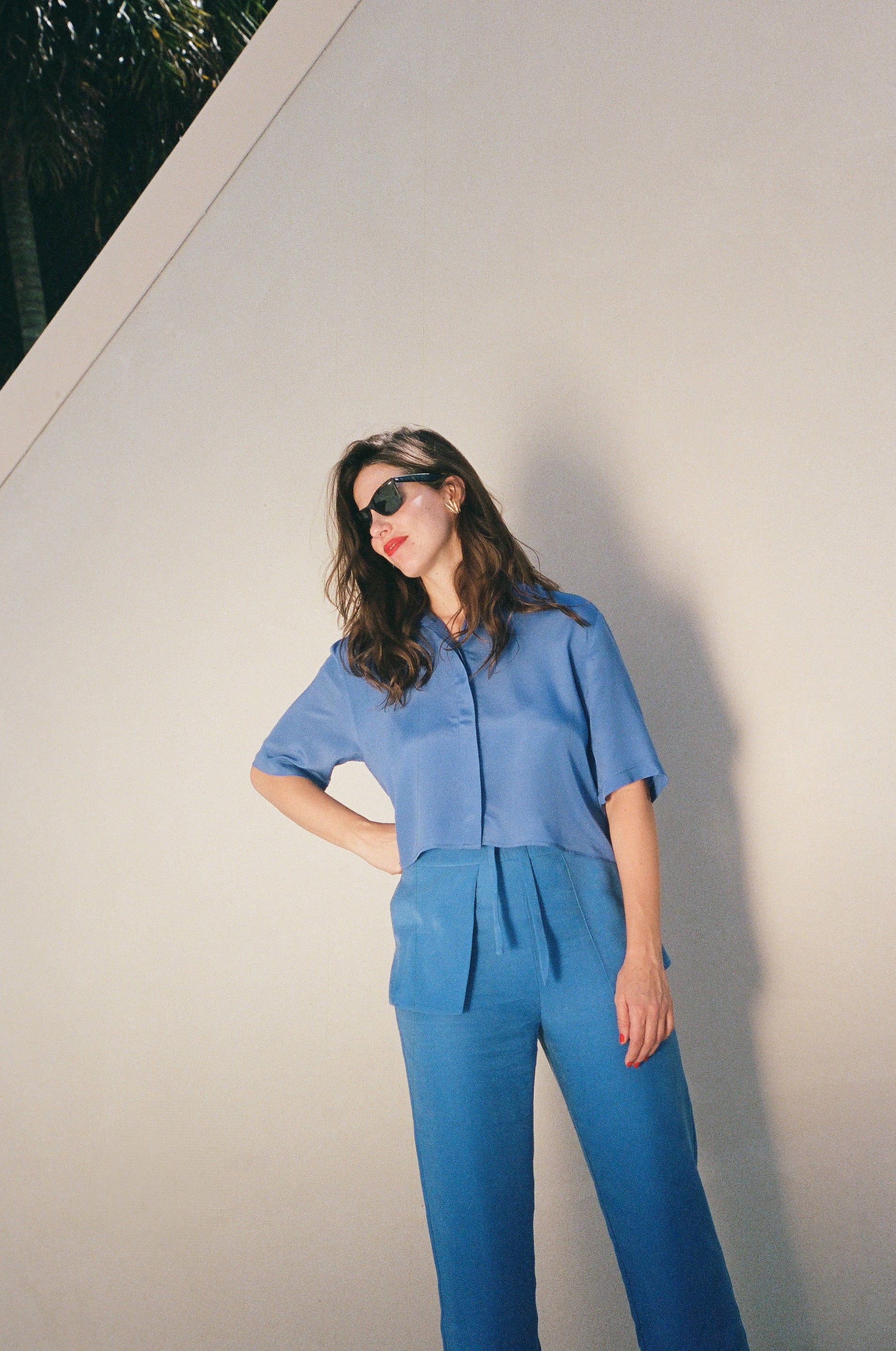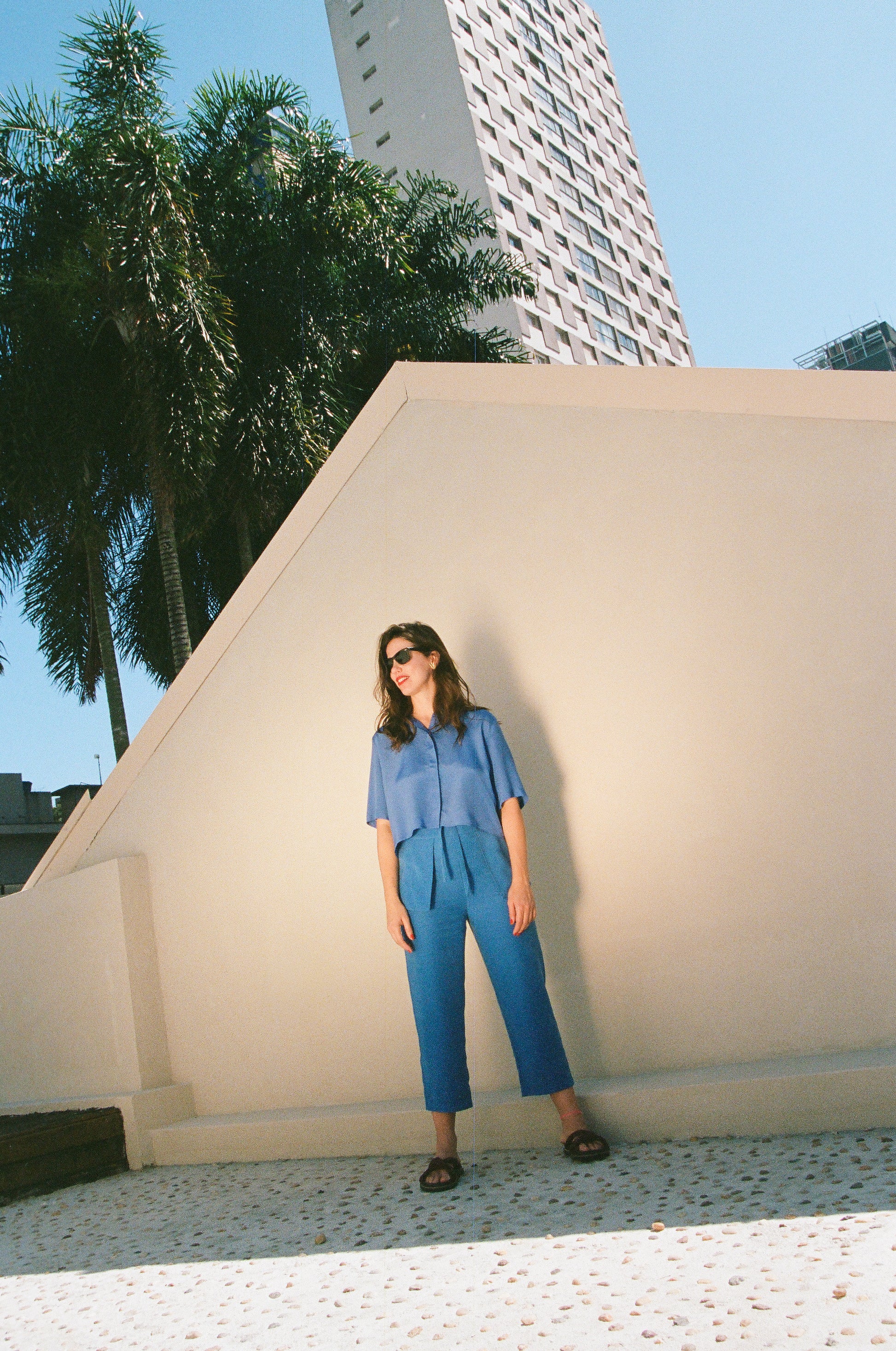 Inspirada nas camisas retas e quadradas de seda dos anos 80 — e batizada em homenagem à fotógrafa baiana Maria Sampaio, prima da estilista Iara — a Camisa Sampaio é uma peça simples, curta, com linhas puras e modelagem reta.