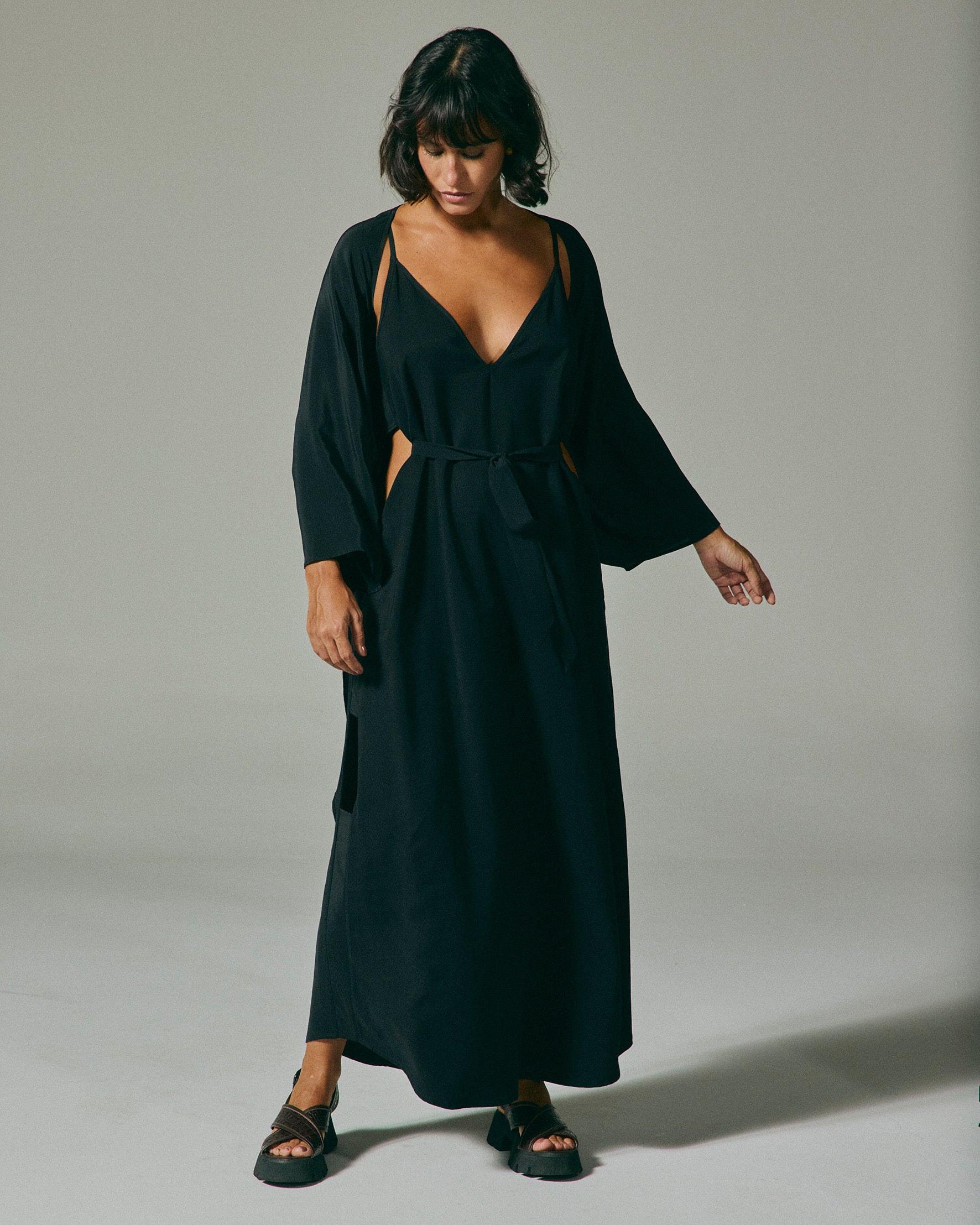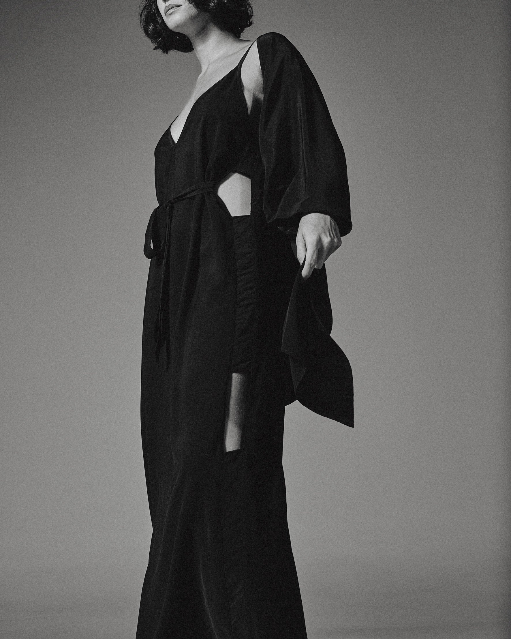 O Casulo é uma sobreposição em seda pura, semelhante a um quimono sem fechamento. Possui mangas reguláveis em rolotê, que podem ser franzidas. Complementa vestidos e macacões, compondo conjuntos sofisticados.