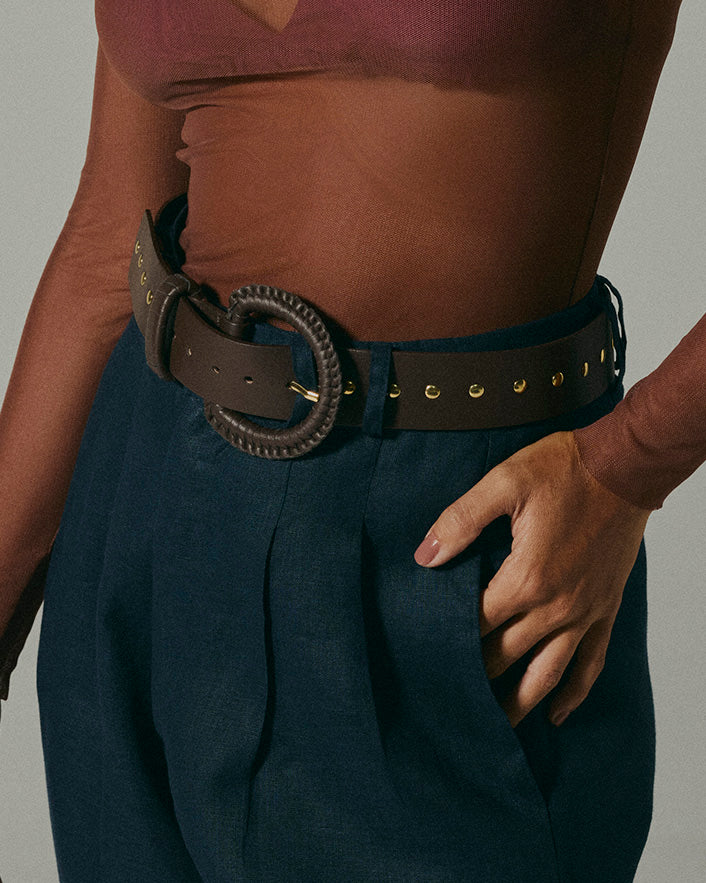 Cinto largo de couro, com 4 cm de altura. Possui fivela grande em macramé de couro, bordada sobre base de metal. As aplicações de tachas fazem citação ao universo punk, criando um contraste entre o trabalho manual e a estética urbana.