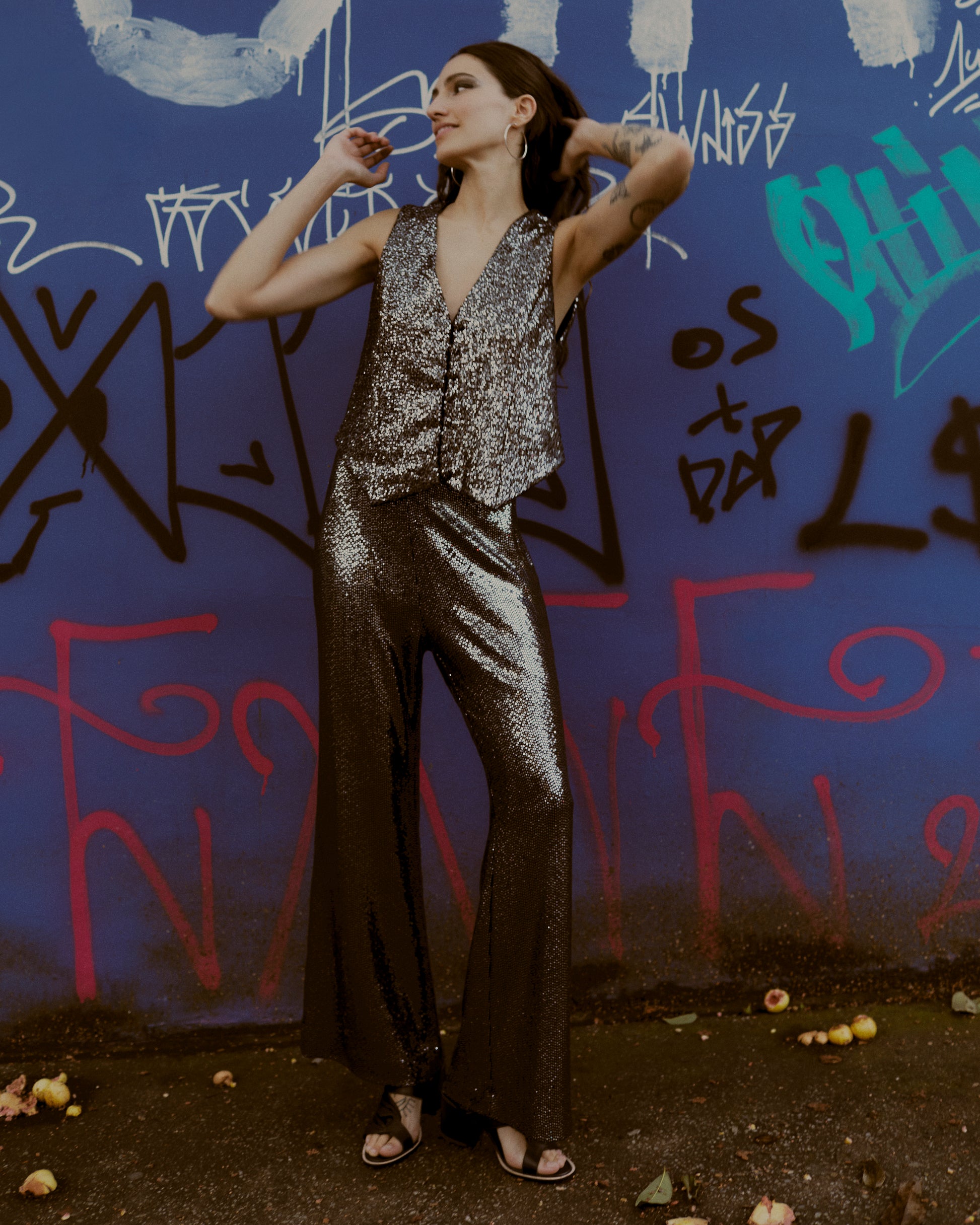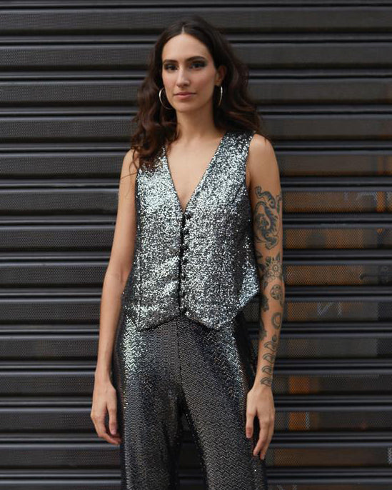 Inspirado no Colete Pethit, o Colete Cauby é confeccionado em paetê e forrado em viscose, garantindo conforto e brilho na medida certa. Versátil, pode ser usado aberto, fechado ou até como blusa regata, ampliando as possibilidades de uso.