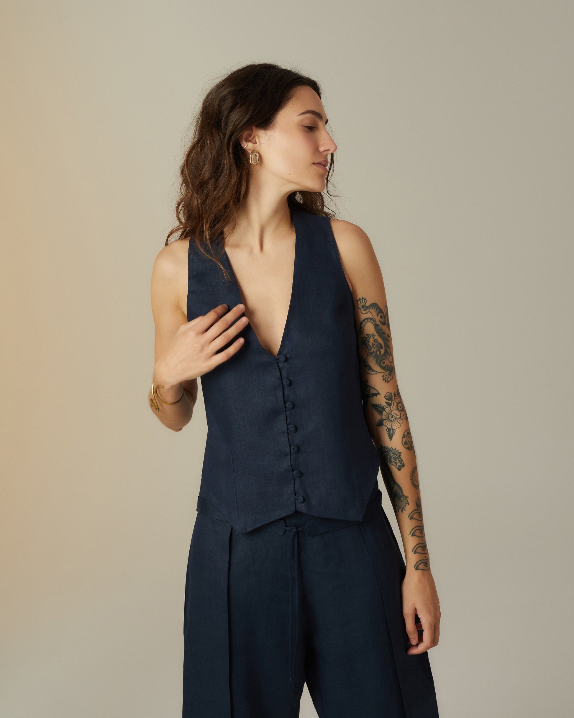 O colete Pethit é um colete de linho puro, duplo, forrado no próprio tecido, de modelagem clássica. Pode ser usado na sua função original, aberto ou fechado, ou, também, como uma blusa regata.