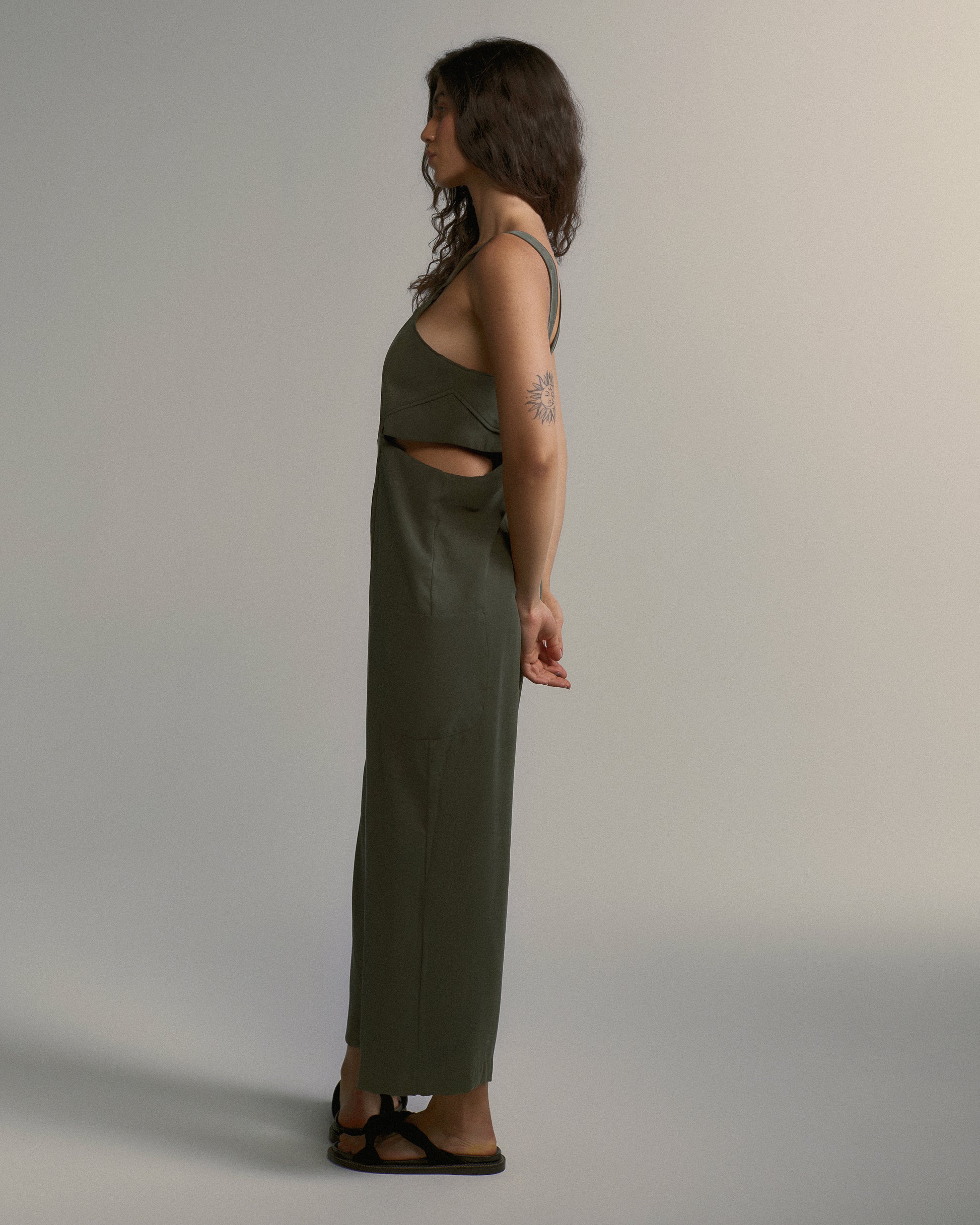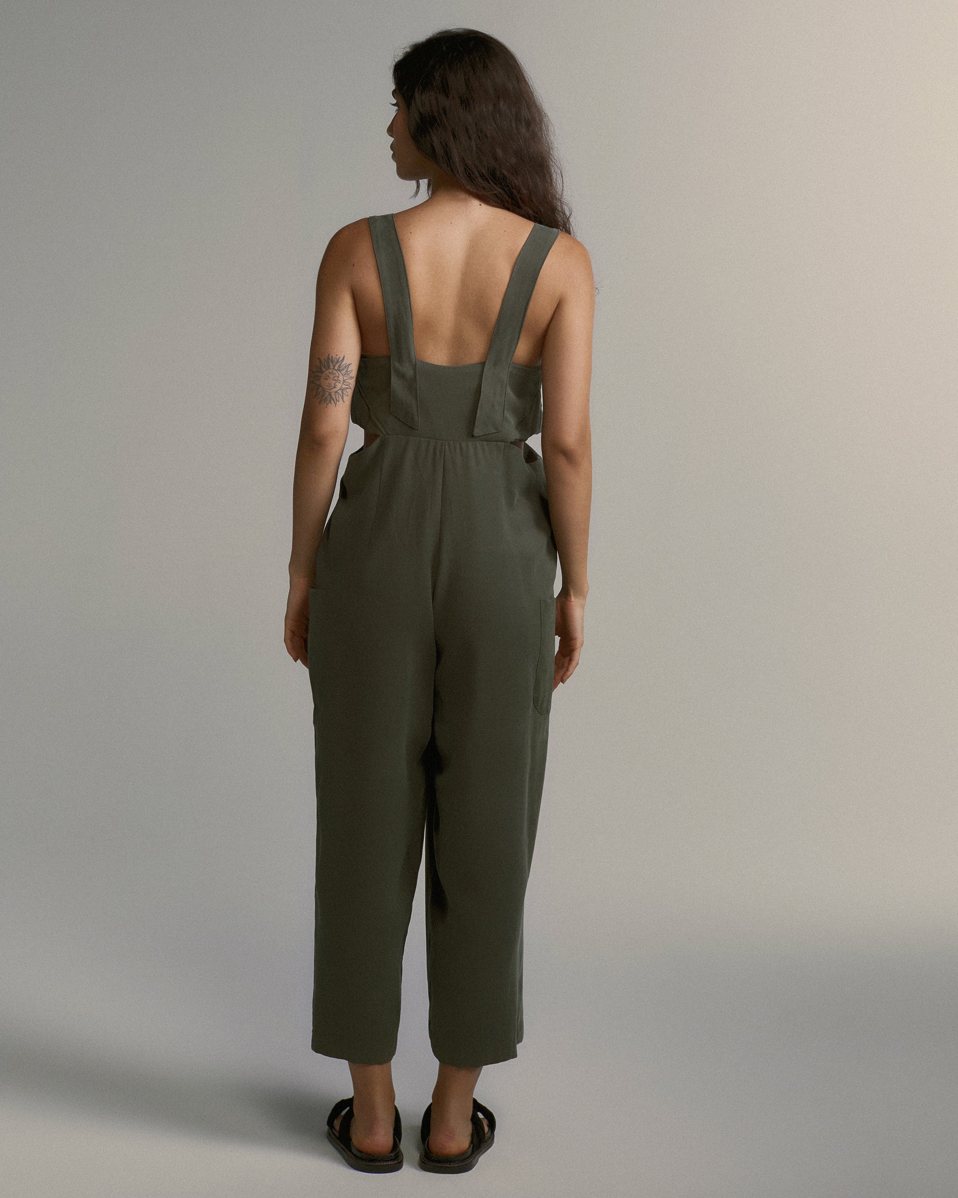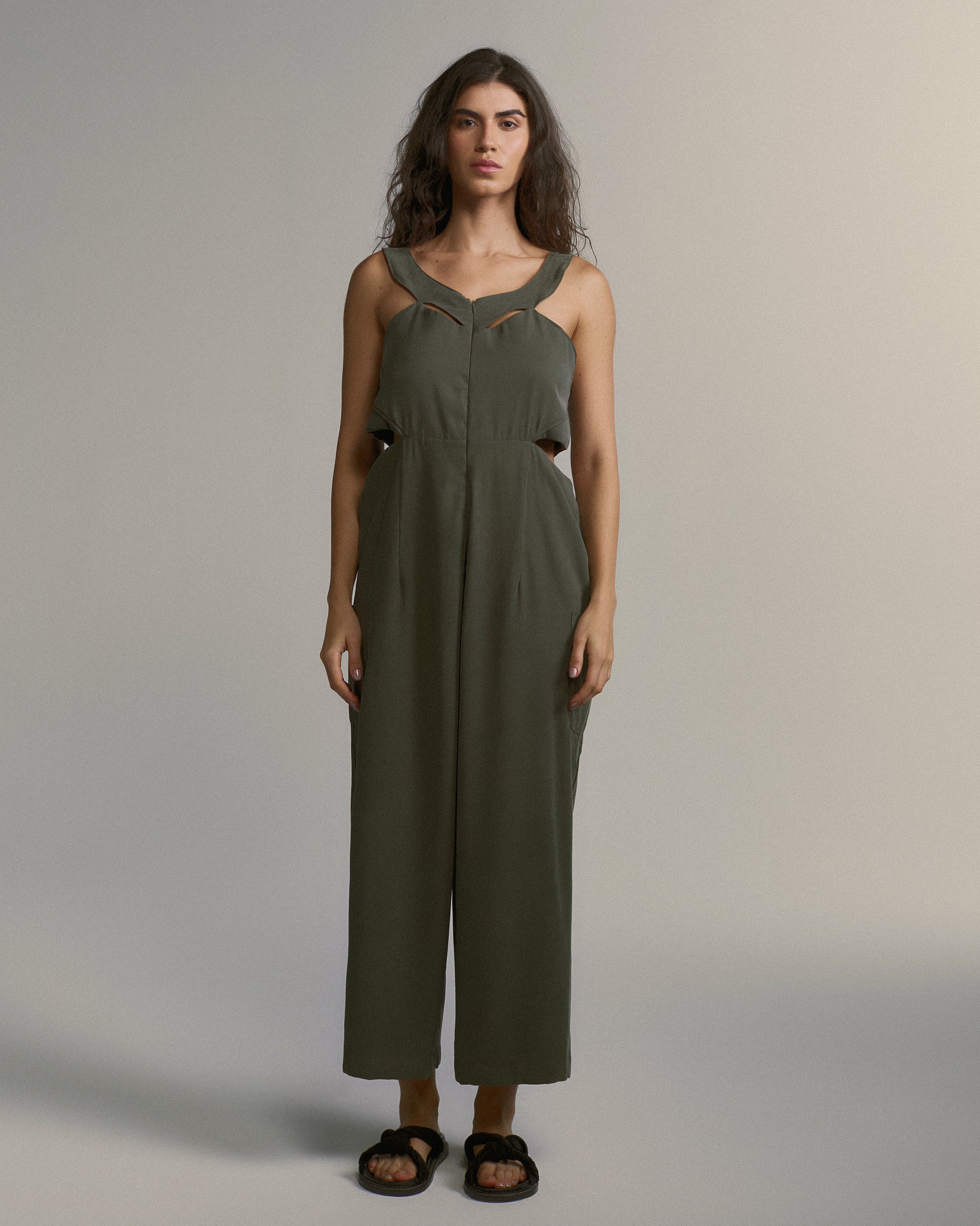 O Macacão Facul é longo e soltinho, com gola arredondada e fechamento frontal em zíper. Apresenta recortes com vazados no busto e cintura, alças reguláveis e bolsos laterais. Pode ser usado de diferentes formas e também em sobreposição a blusas.