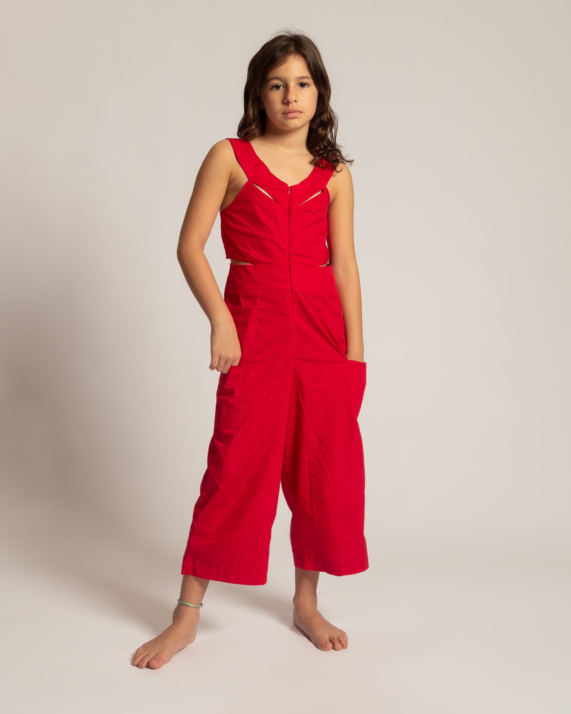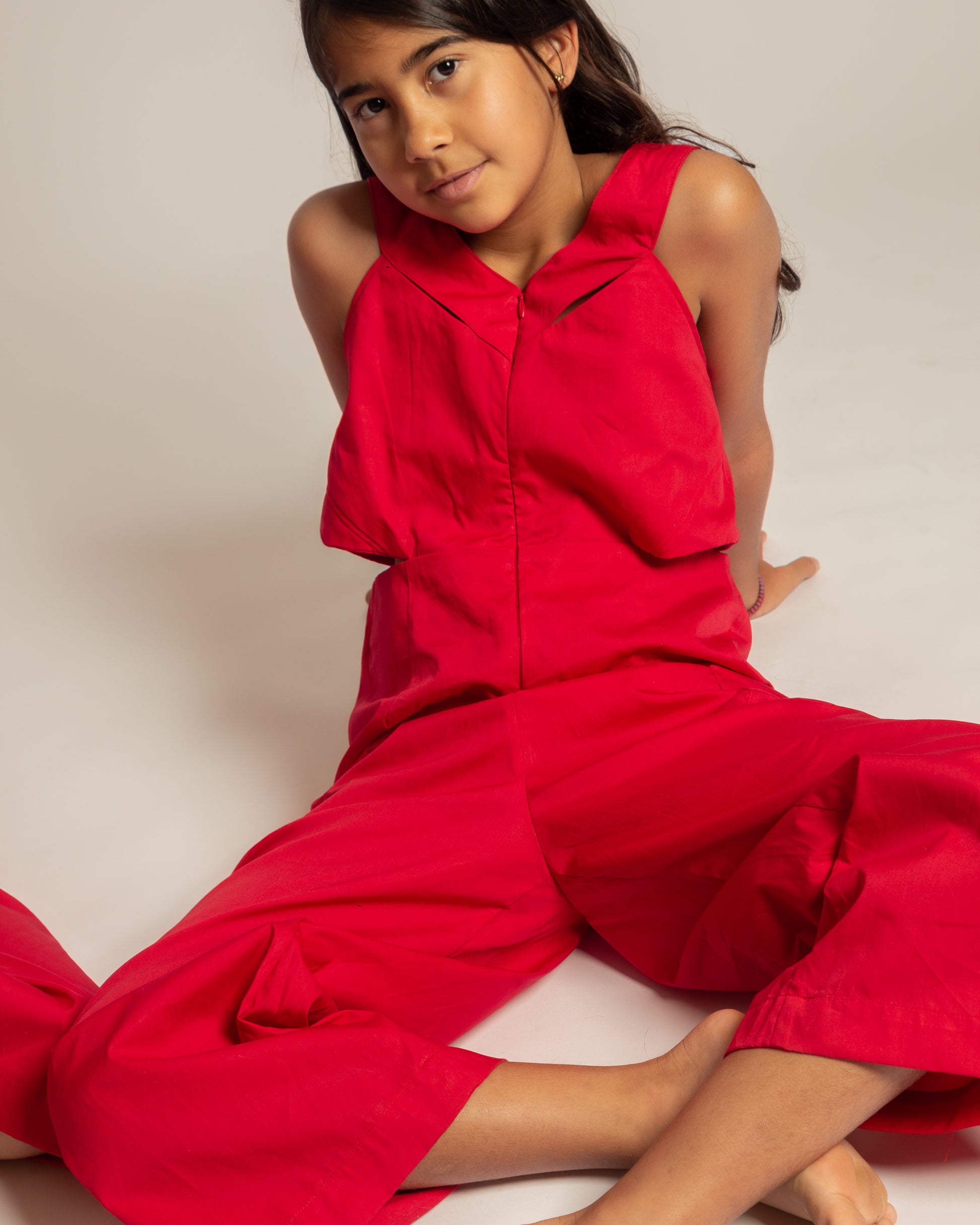 Confeccionado em tricoline 100% algodão, possui fechamento frontal com zíper invisível e alças reguláveis nas costas, permitindo ajustes que acompanham o crescimento da criança.