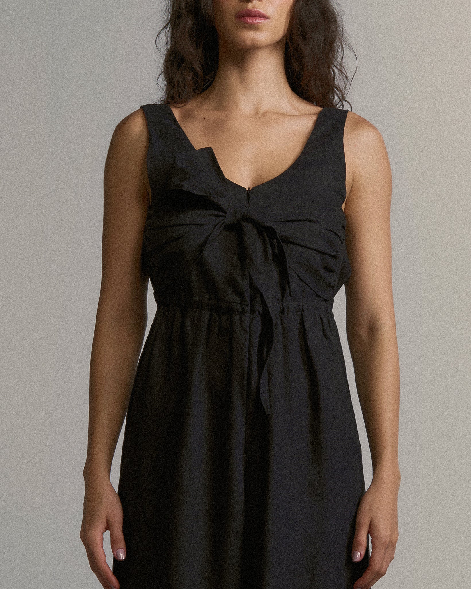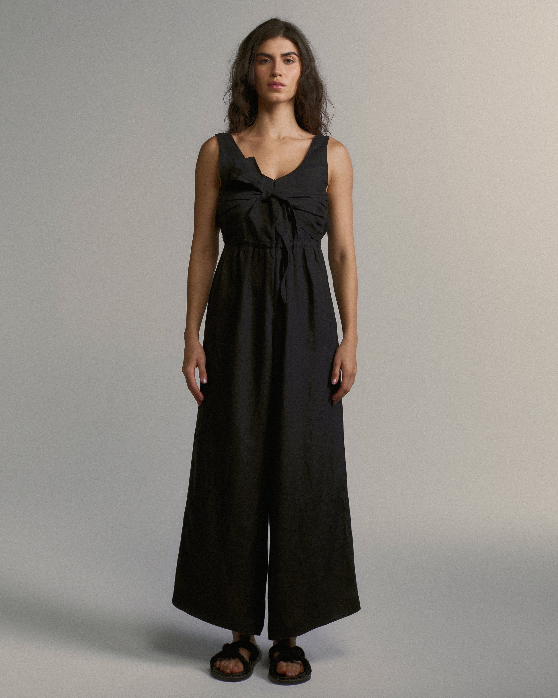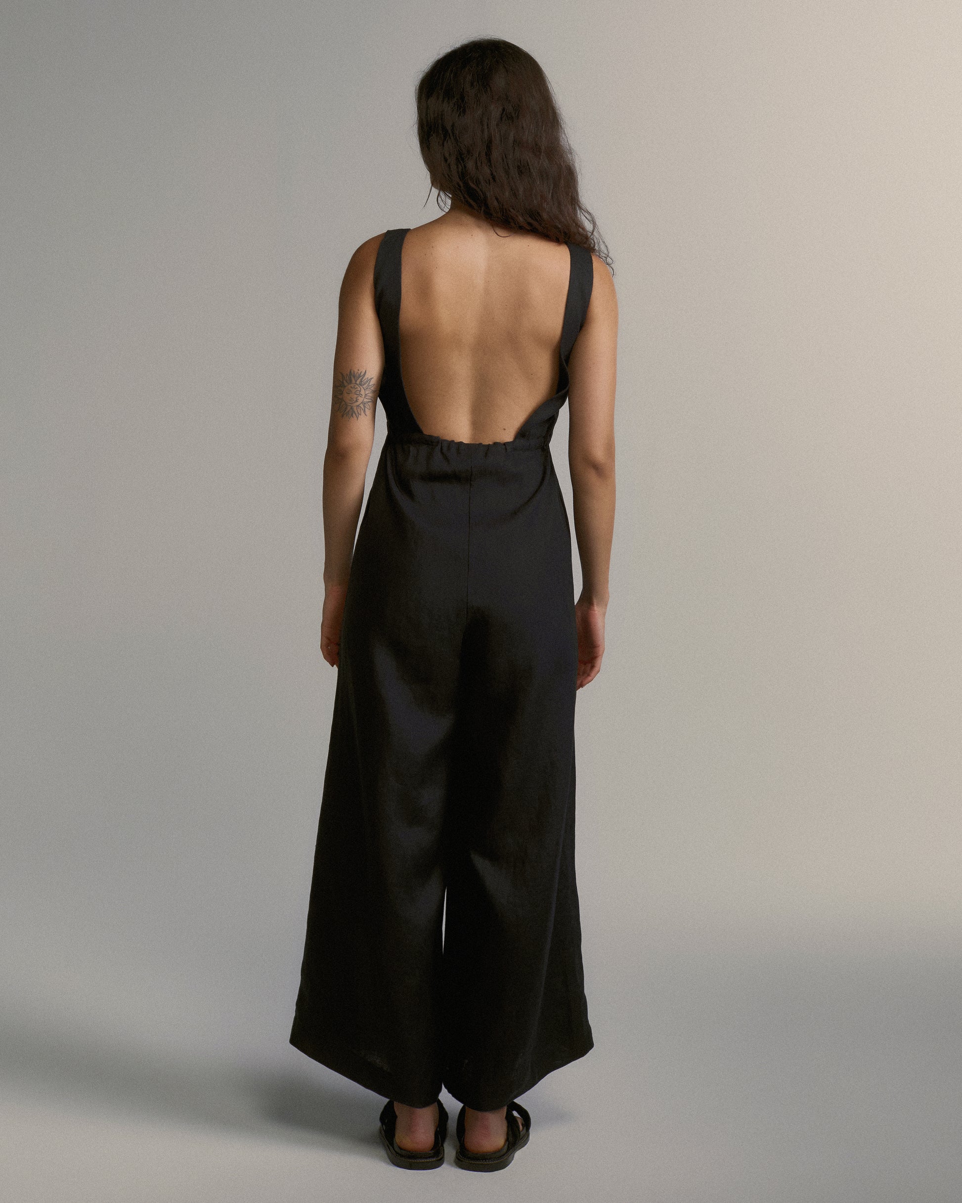 O Macacão Violeta é confeccionado em linho. Peça que une sofisticação e conforto. Sua base é uma regata dupla, com fechamento frontal em zíper invisível. A calça larga em linha A apresenta leve assimetria na barra, uma marca registrada da coleção. Solto e elegante, possui faixa lateral que pode ser amarrada à frente ou nas costas, criando diferentes possibilidades de uso. Um pequeno vazado lateral revela a pele de forma sutil.