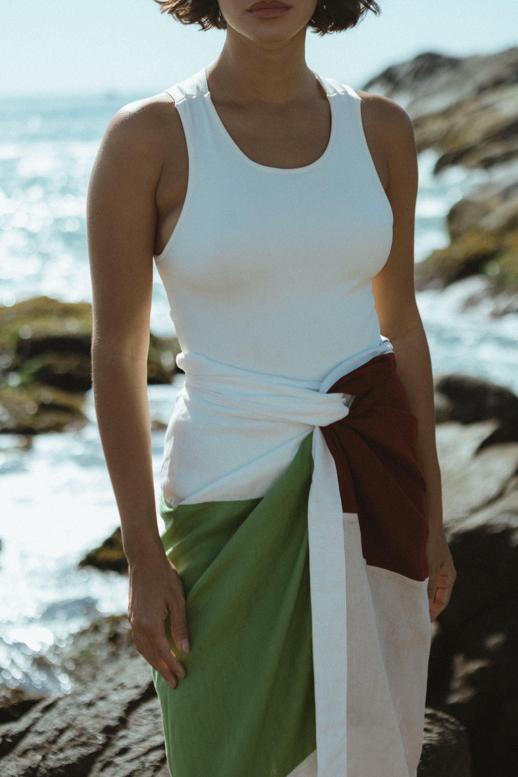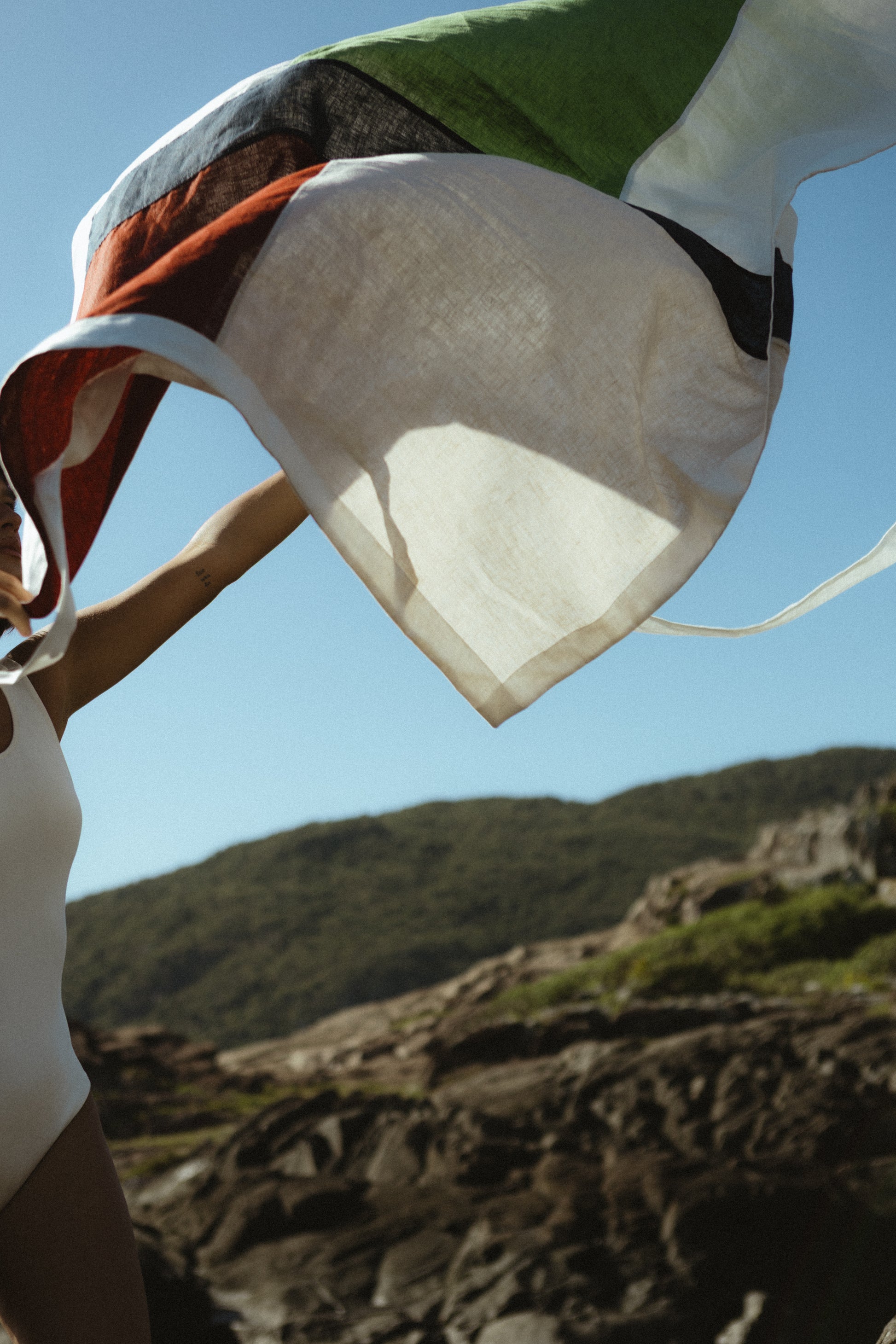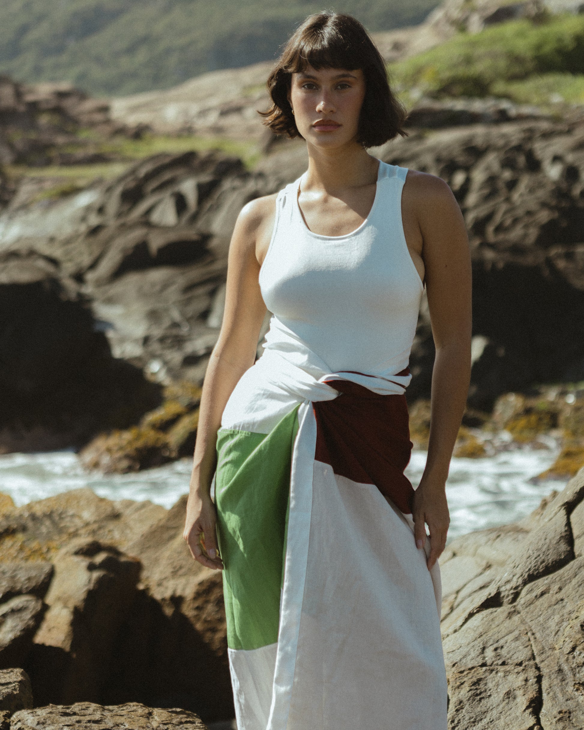 Paneau confeccionado em linho, nas medidas 1,40 x 1,08, apresenta as cores vinho, areia, preto, off white e verde pistache. De ritmo e movimento próprios, pode ser usado de diversas formas — como saia, vestido, canga ou saída de praia.