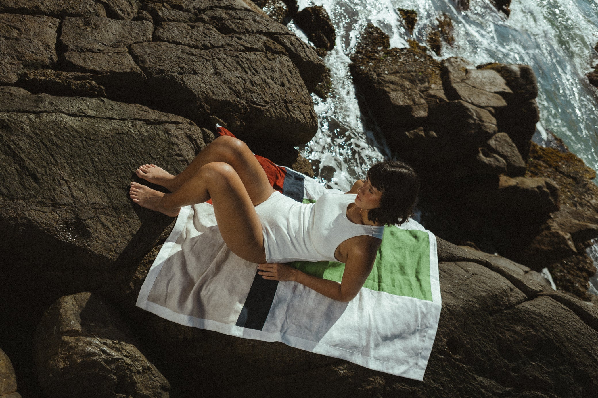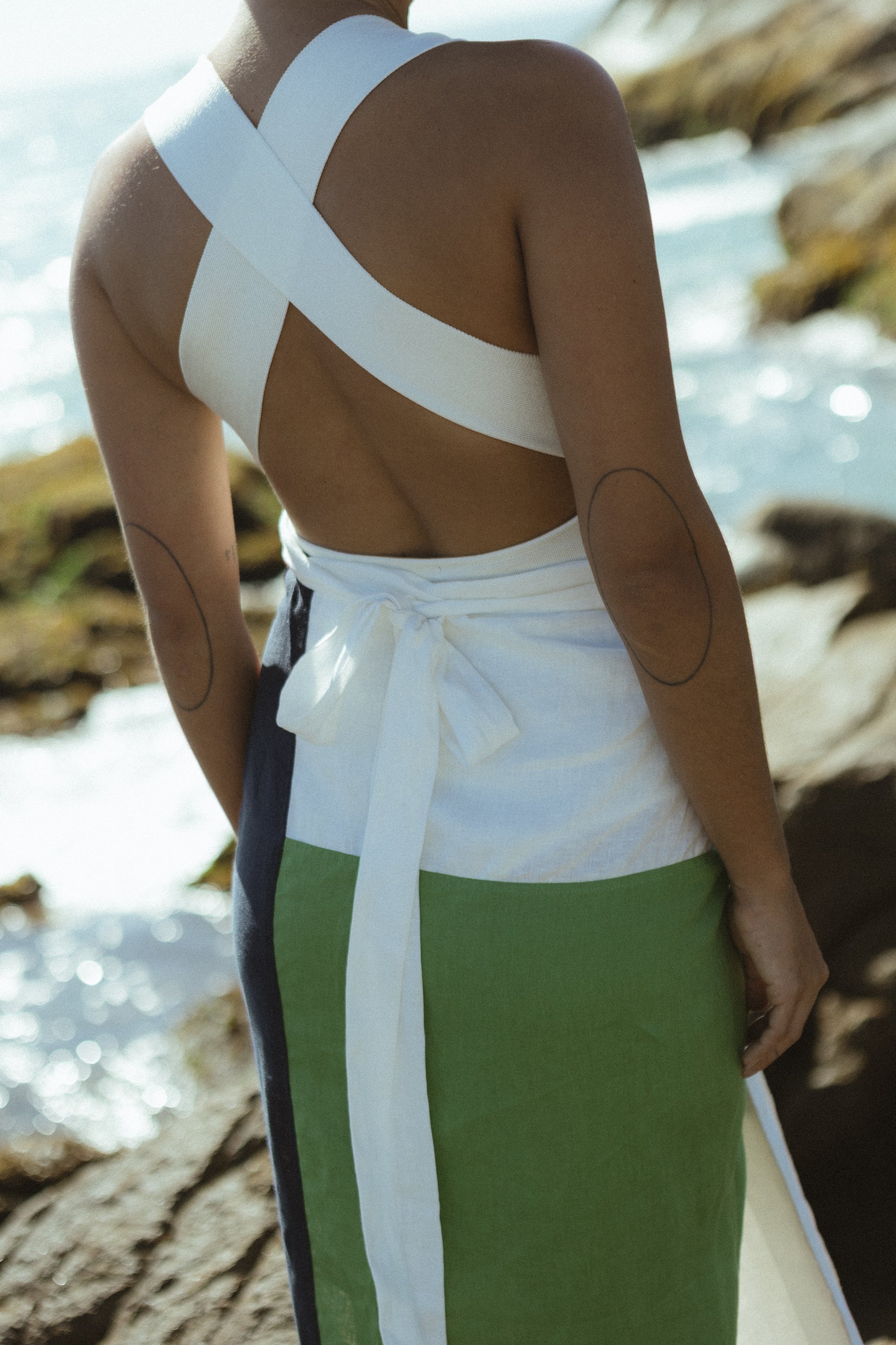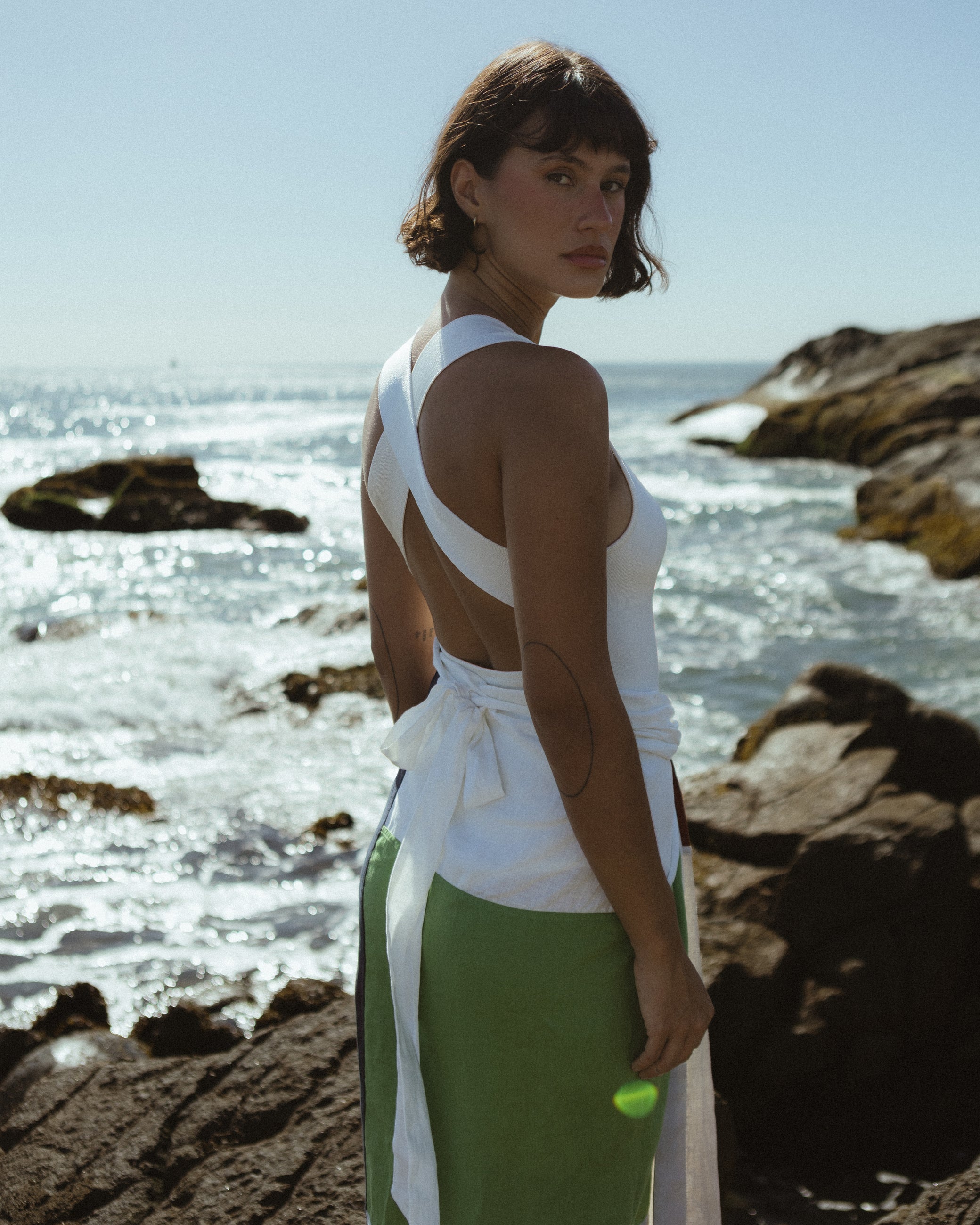 Paneau confeccionado em linho, nas medidas 1,40 x 1,08, apresenta as cores vinho, areia, preto, off white e verde pistache. De ritmo e movimento próprios, pode ser usado de diversas formas — como saia, vestido, canga ou saída de praia.