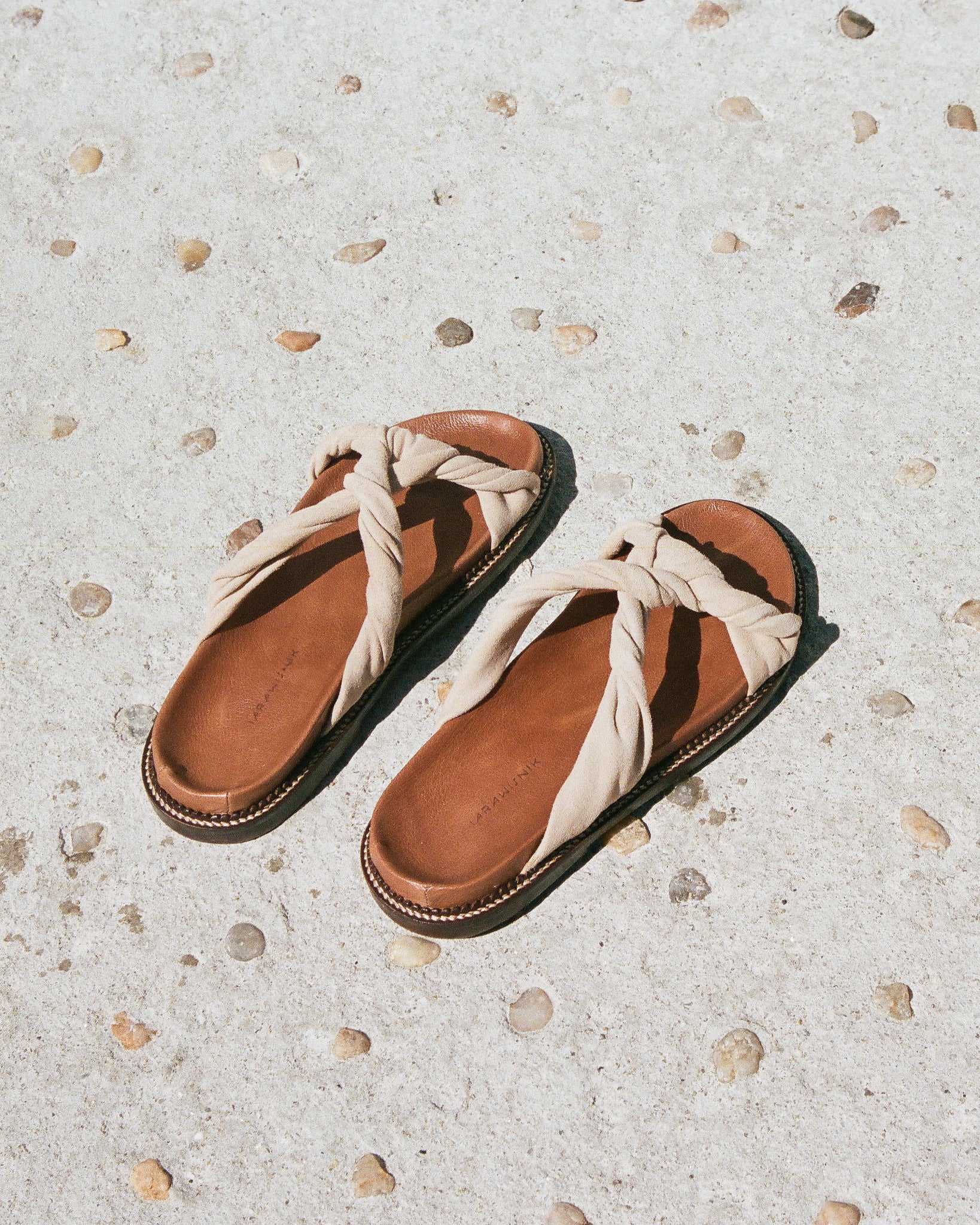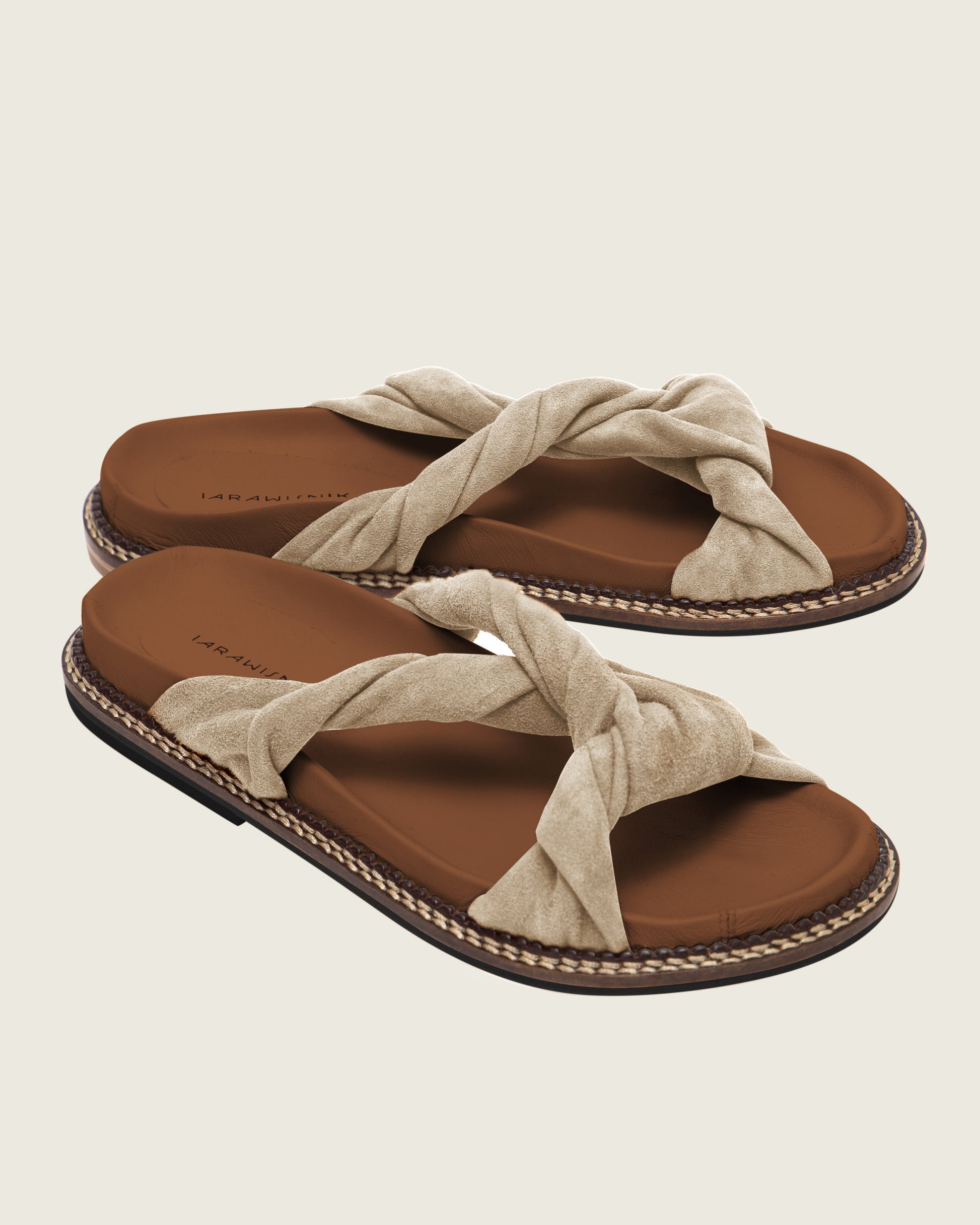 A Papete Nó Ártemis é inspirada nas sandálias gregas. Possui palmilha anatômica de cortiça forrada em couro café e cabedal em camurça retorcida. Confortável e versátil, pode compor looks de verão.