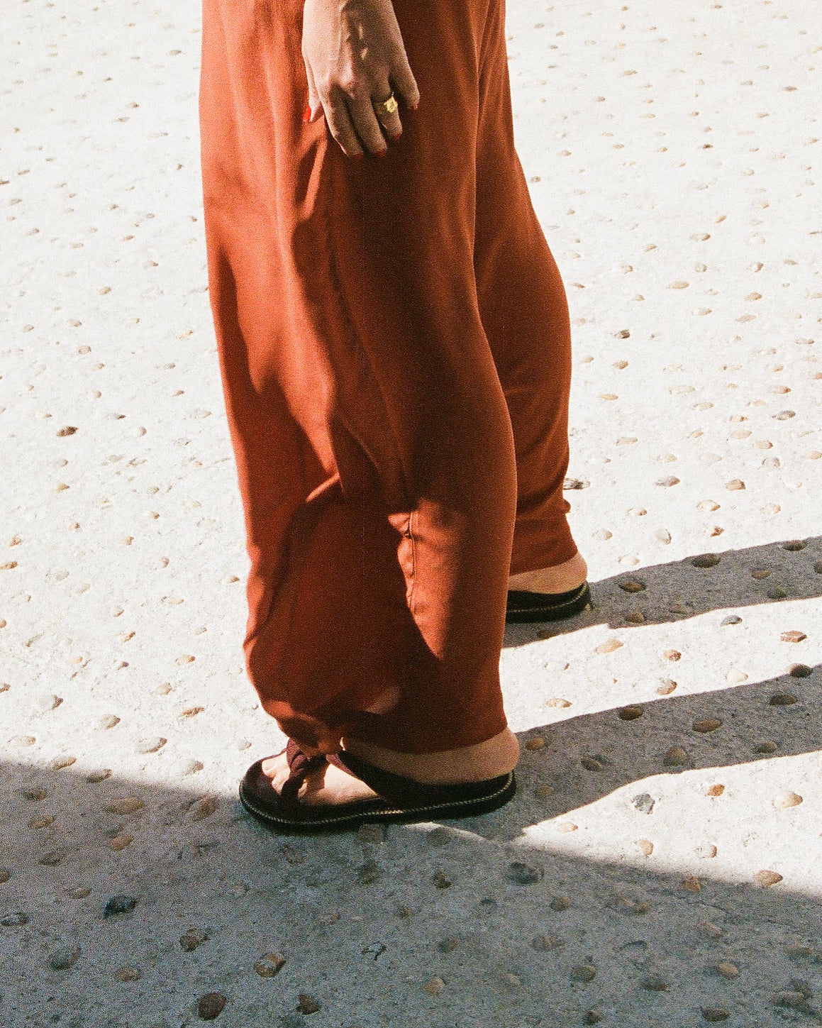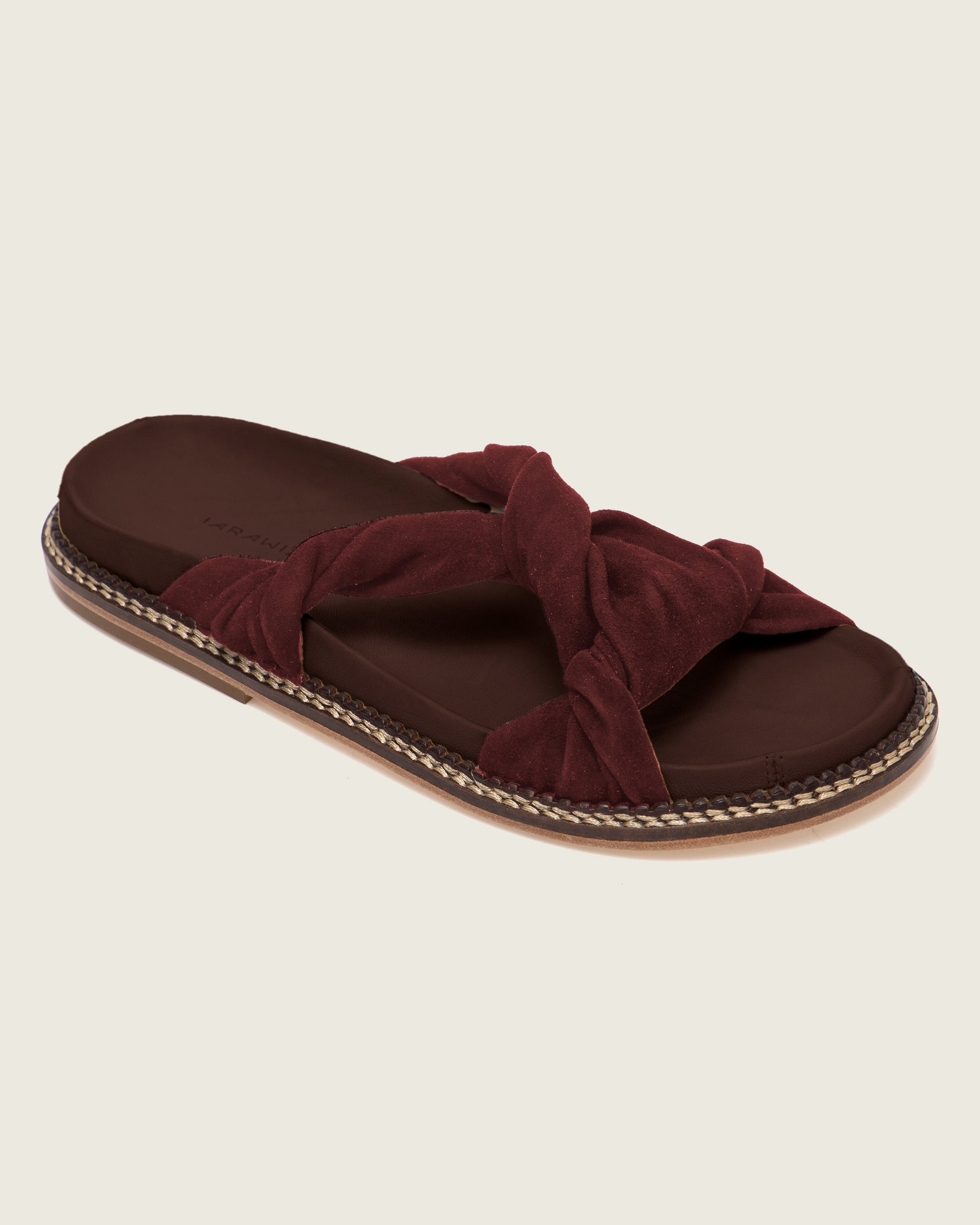 A Papete Nó Artêmis é inspirada nas sandálias gregas. Possui palmilha anatômica de cortiça forrada em couro café e cabedal em camurça retorcida. Confortável e versátil, pode compor looks de verão.