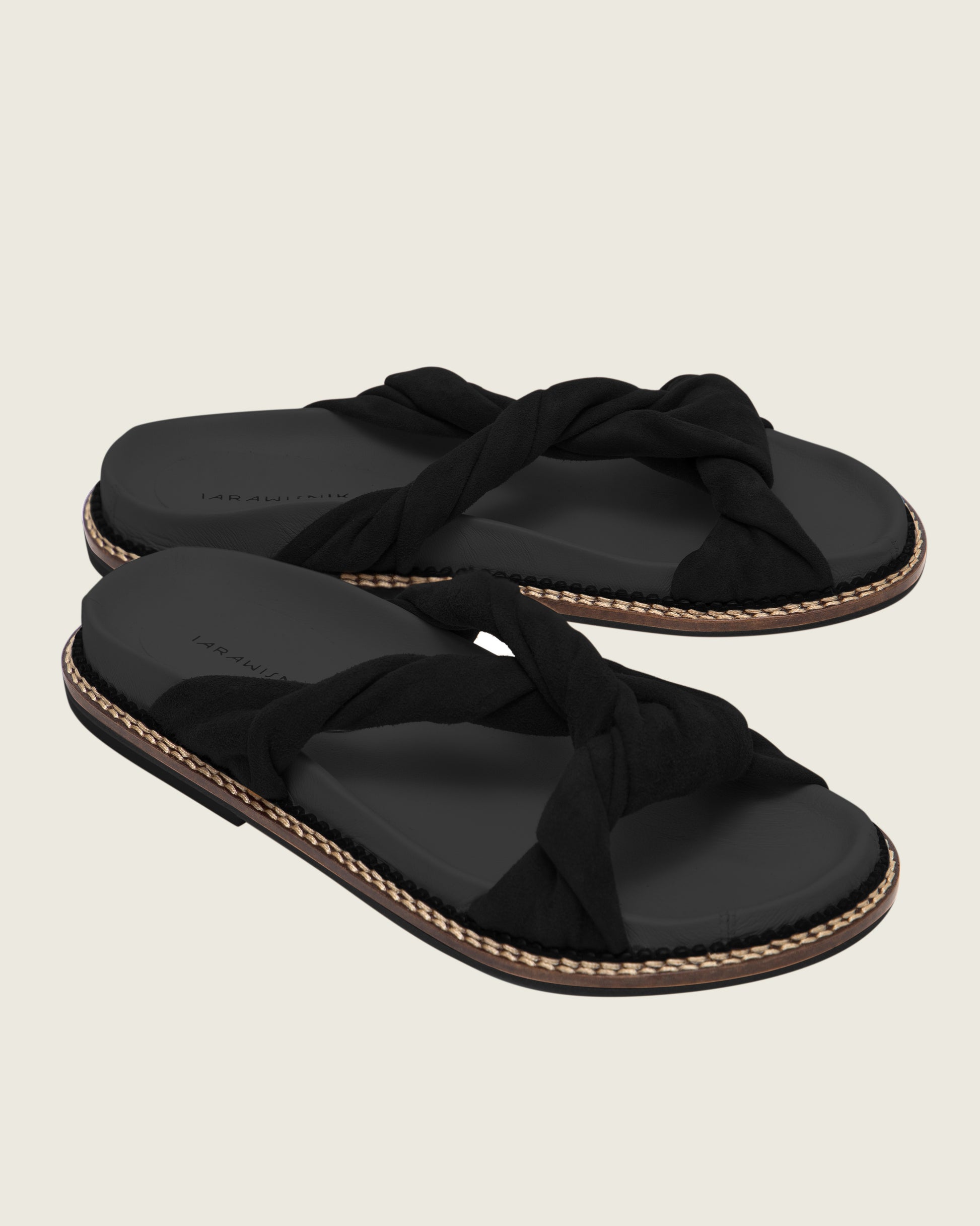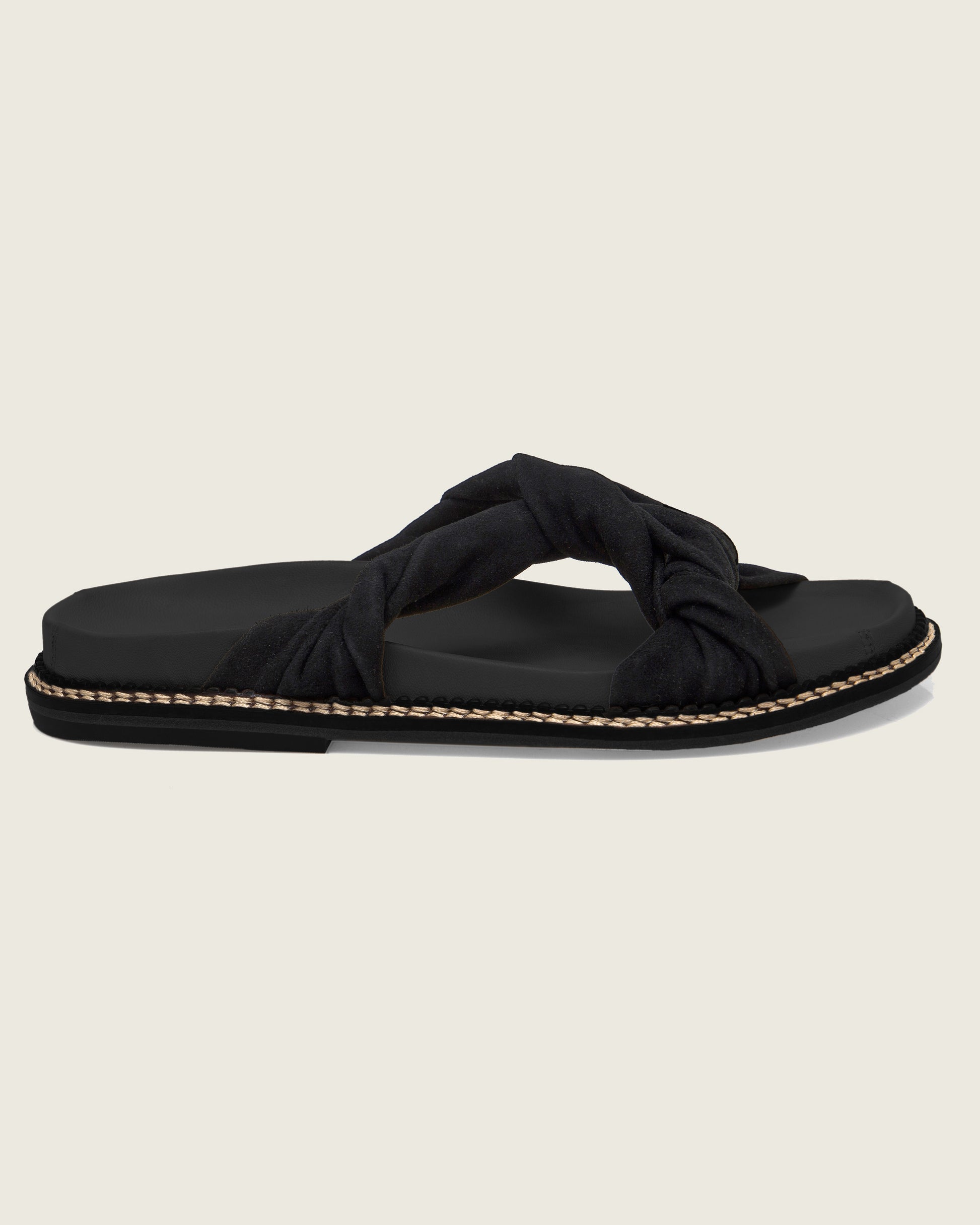 A Papete Nó Artêmis é inspirada nas sandálias gregas. Possui palmilha anatômica de cortiça forrada em couro café e cabedal em camurça retorcida. Confortável e versátil, pode compor looks de verão.