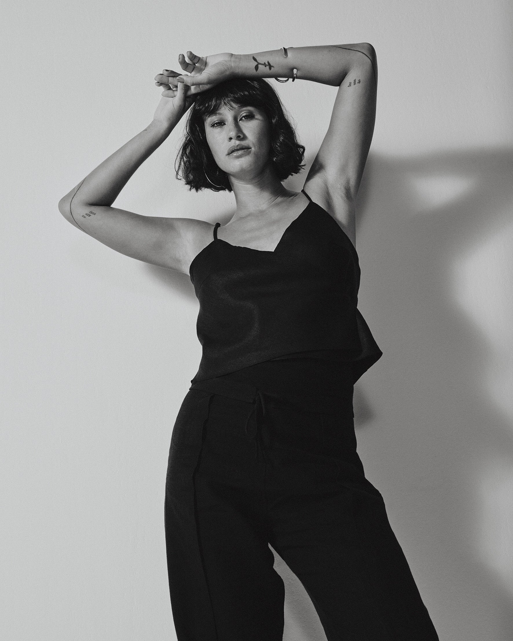 A Regata Transpasse é feita em cambraia de linho puro. De modelagem dupla e transpassada, possui alças finas e tiras reguláveis no próprio tecido. Leve e delicada, adapta-se ao corpo com naturalidade.