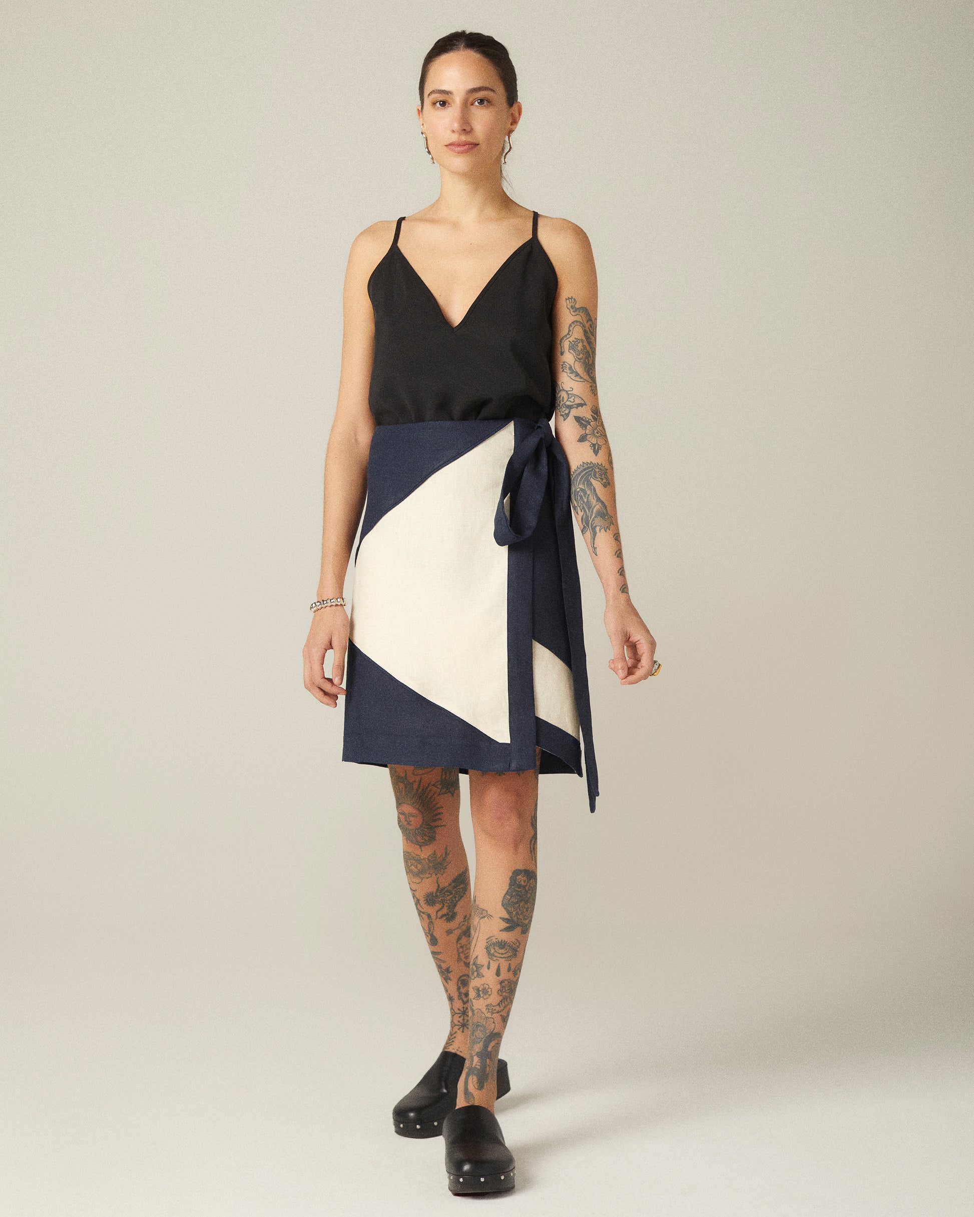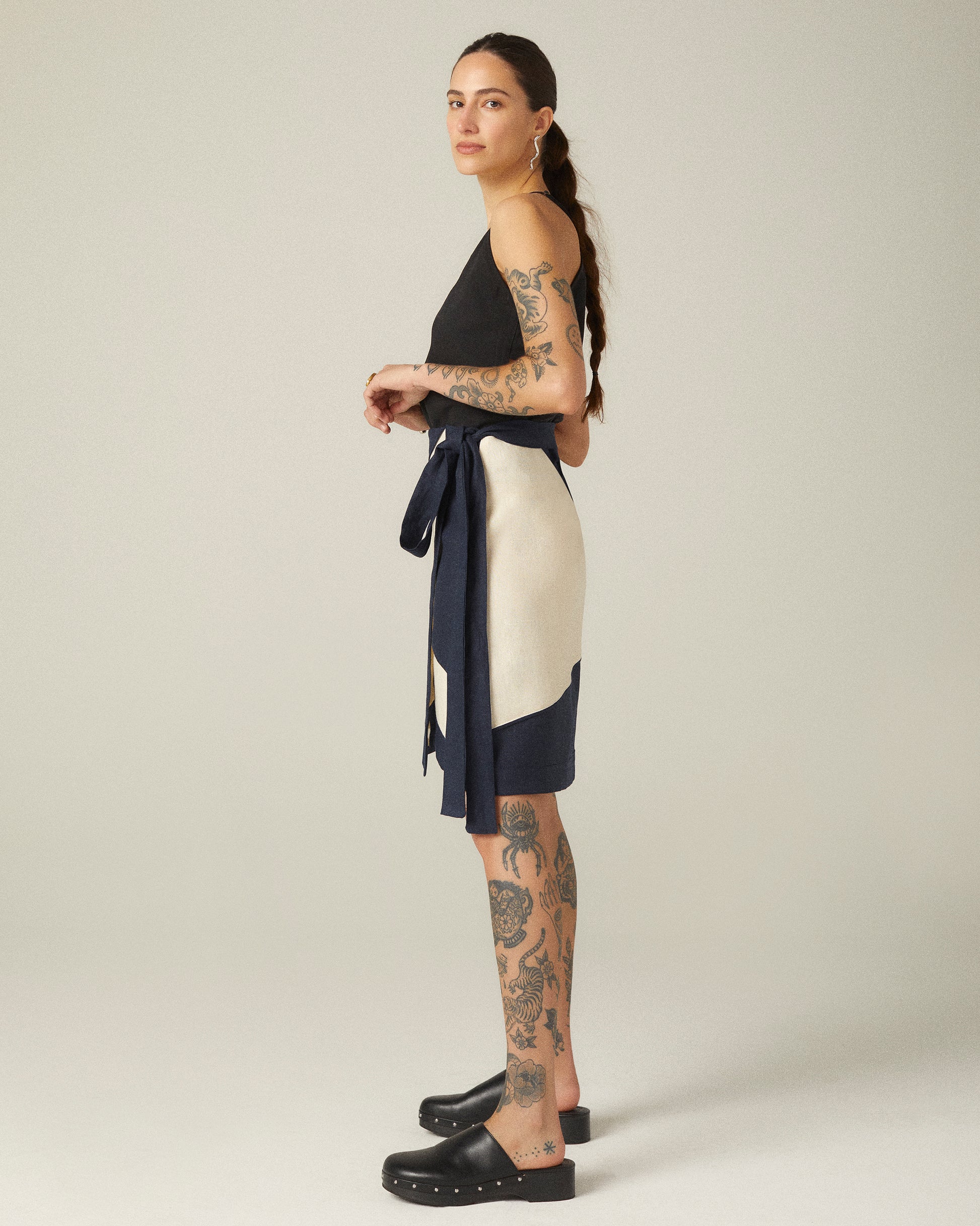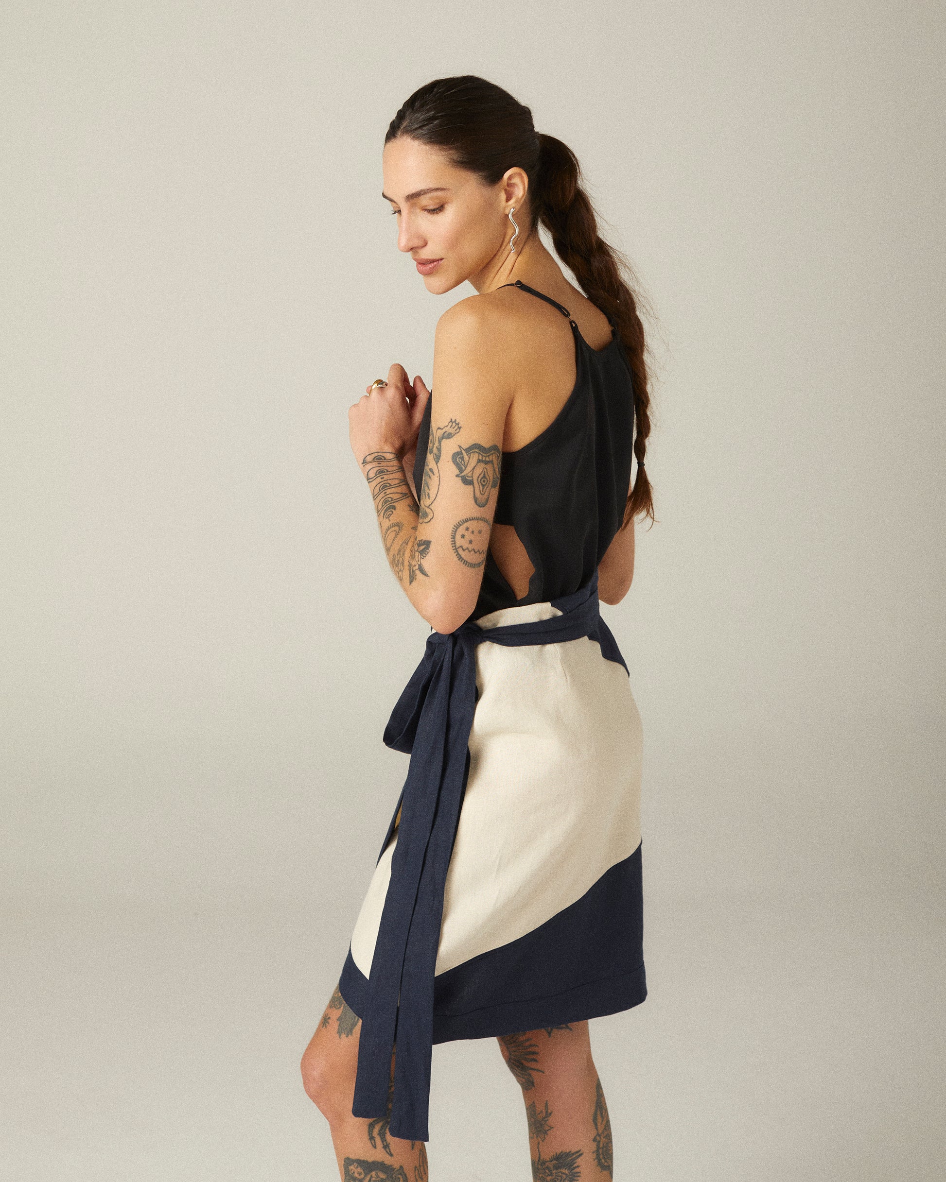 A Saia Envelope Curta é confeccionada em linho. De modelagem transpassada e barra assimétrica, possui faixa regulável para ajuste. O desenho geométrico em duas cores é característico da marca.