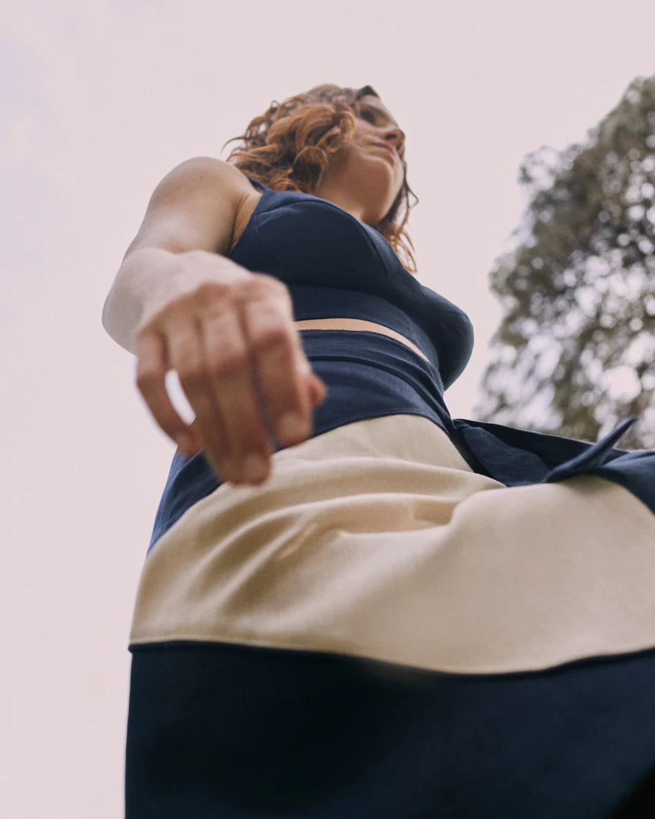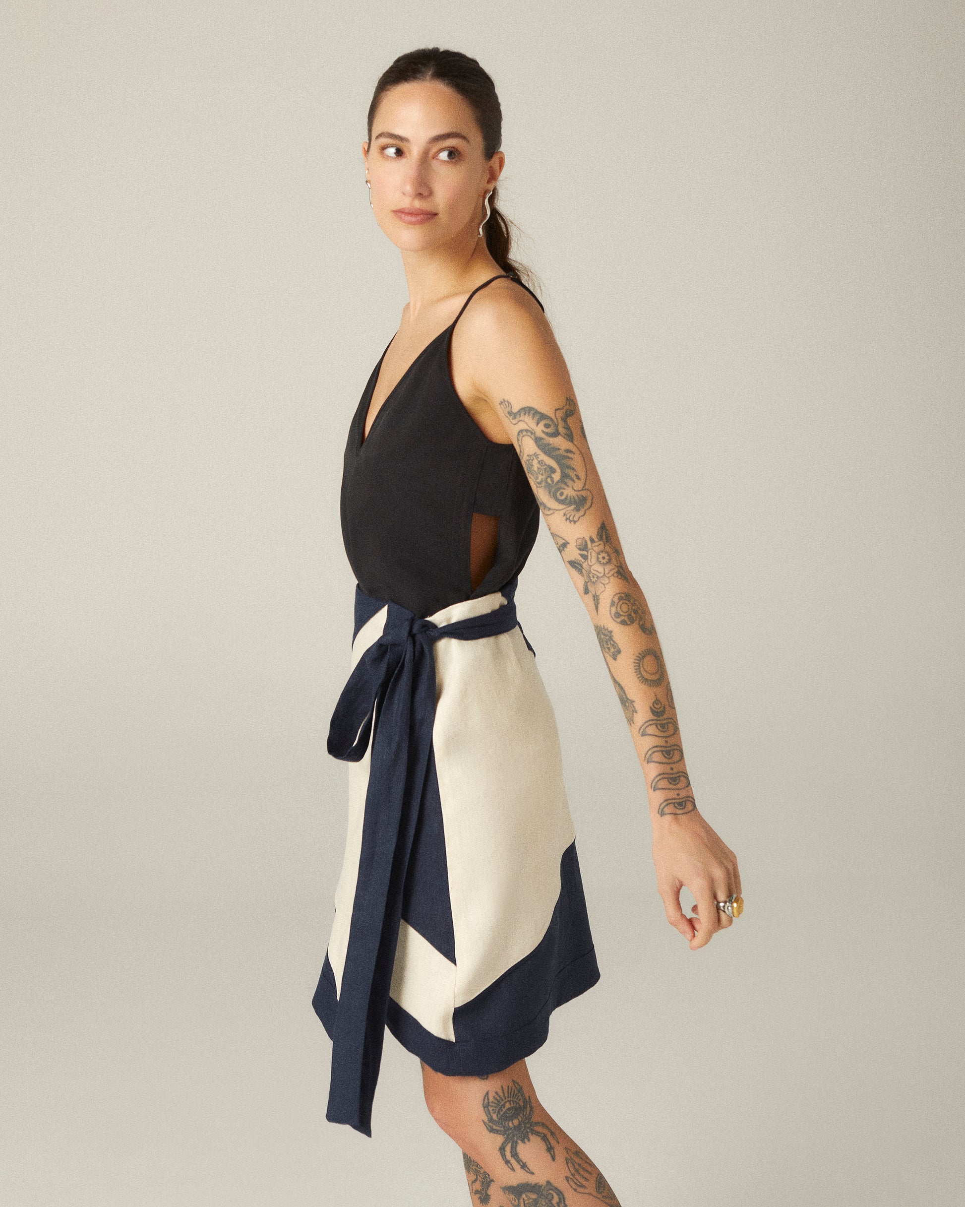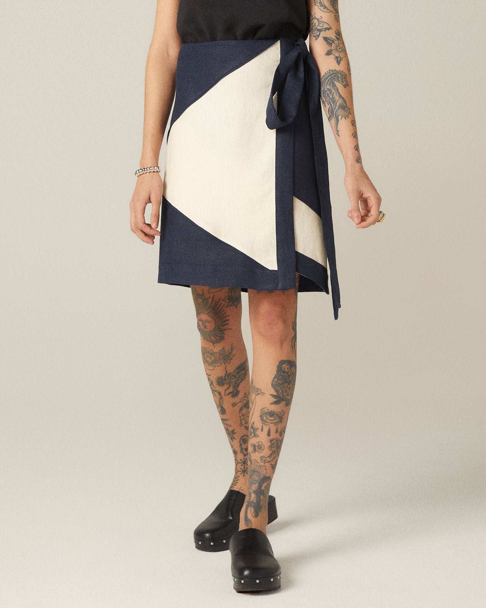 A Saia Envelope Curta é confeccionada em linho. De modelagem transpassada e barra assimétrica, possui faixa regulável para ajuste. O desenho geométrico em duas cores é característico da marca.