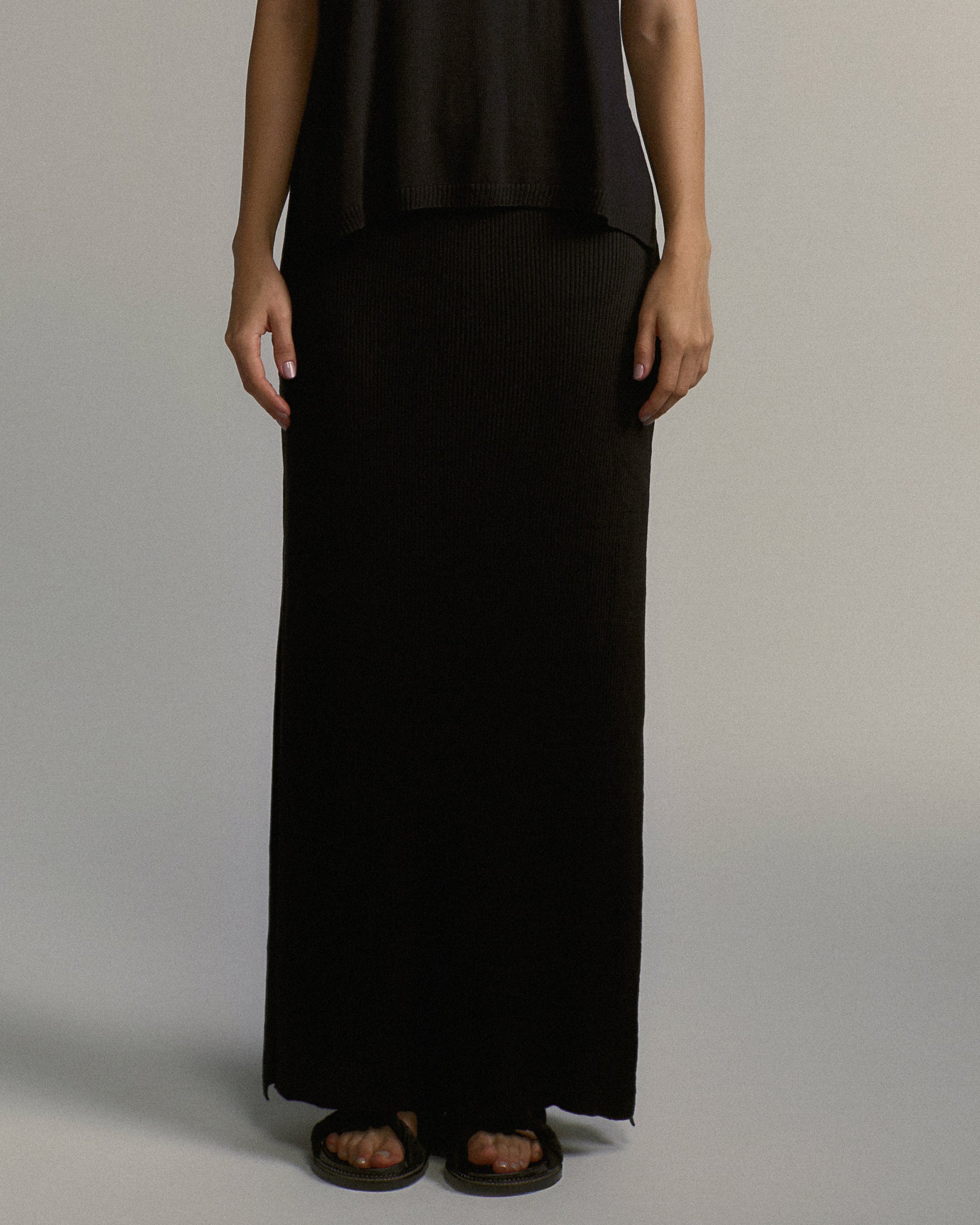 A Saia Isolda é uma peça de cintura alta e modelagem lápis, longa e elegante. Feita em viscose canelada (rib), é levemente solta e acompanha duas fendas laterais, proporcionando frescor e movimento. Possui cós de elástico e forro interno, garantindo conforto e adaptabilidade. Nas cores preto e off, combina com toda a coleção, em especial com as peças da linha tricô.