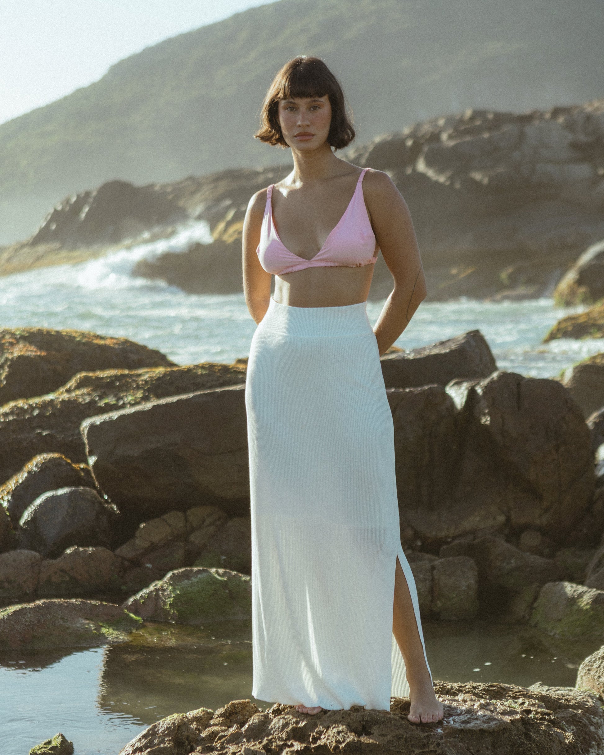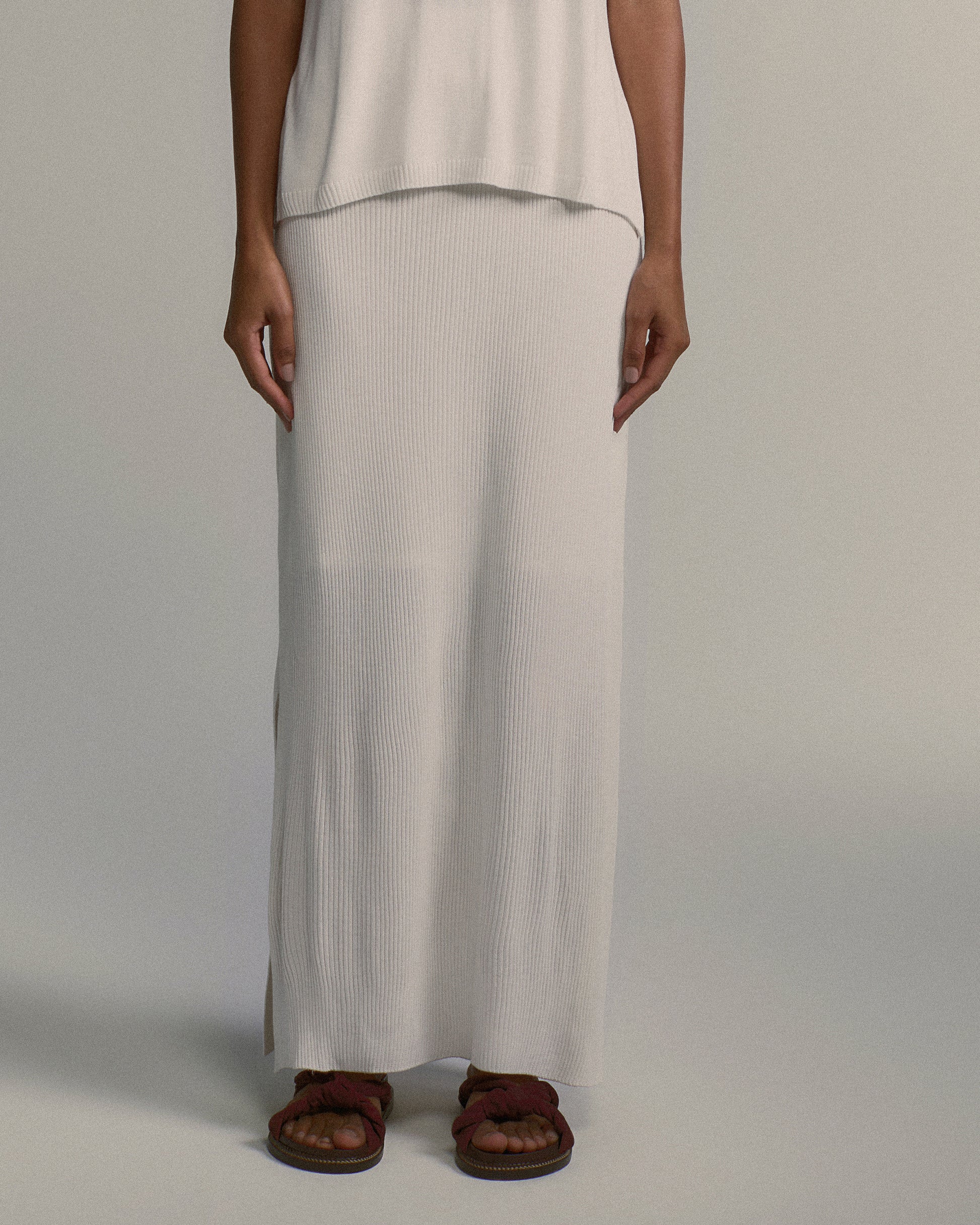 A Saia Isolda é uma peça de cintura alta e modelagem lápis, longa e elegante. Feita em viscose canelada (rib), é levemente solta e acompanha duas fendas laterais, proporcionando frescor e movimento. Possui cós de elástico e forro interno, garantindo conforto e adaptabilidade. Nas cores preto e off, combina com toda a coleção, em especial com as peças da linha tricô.