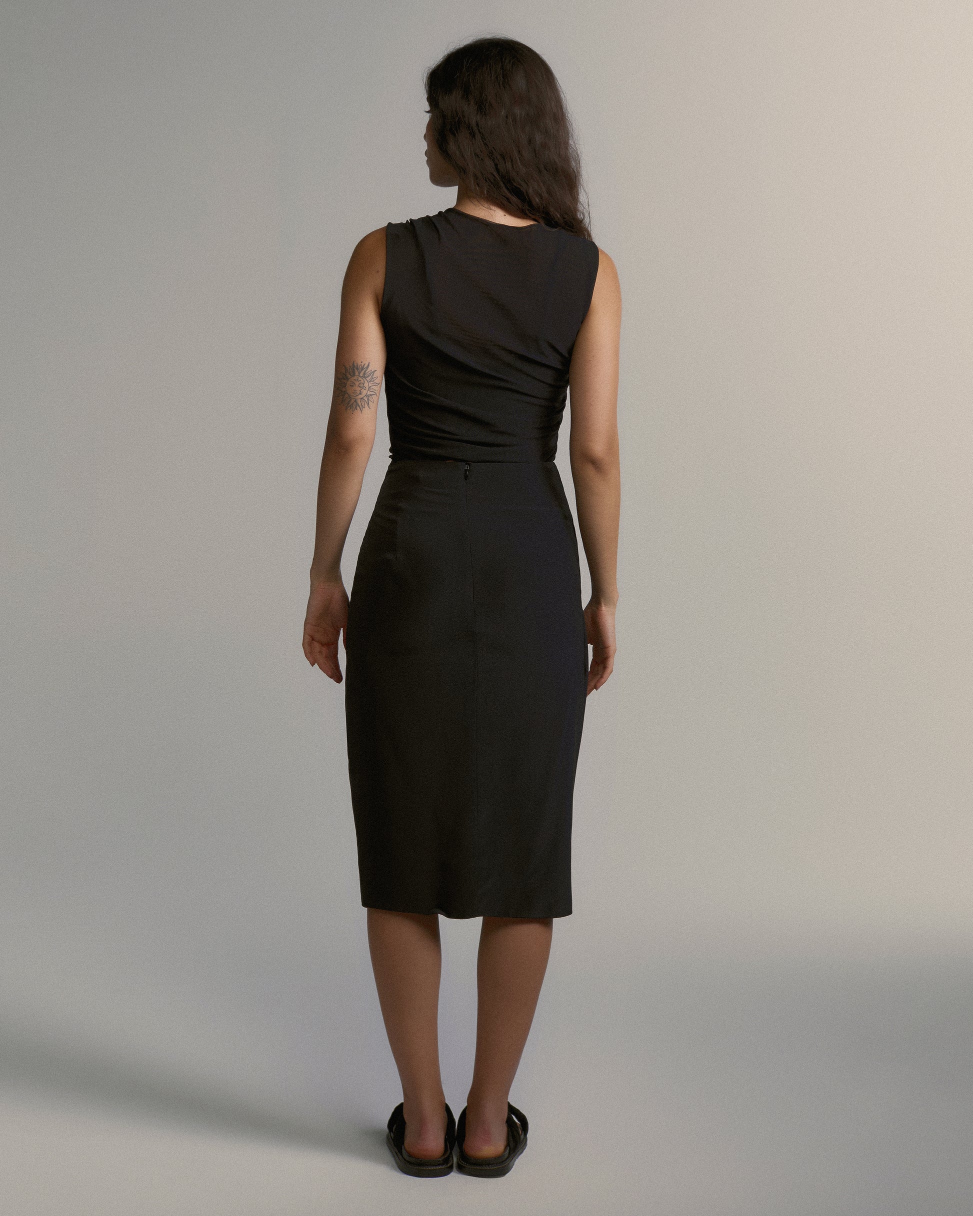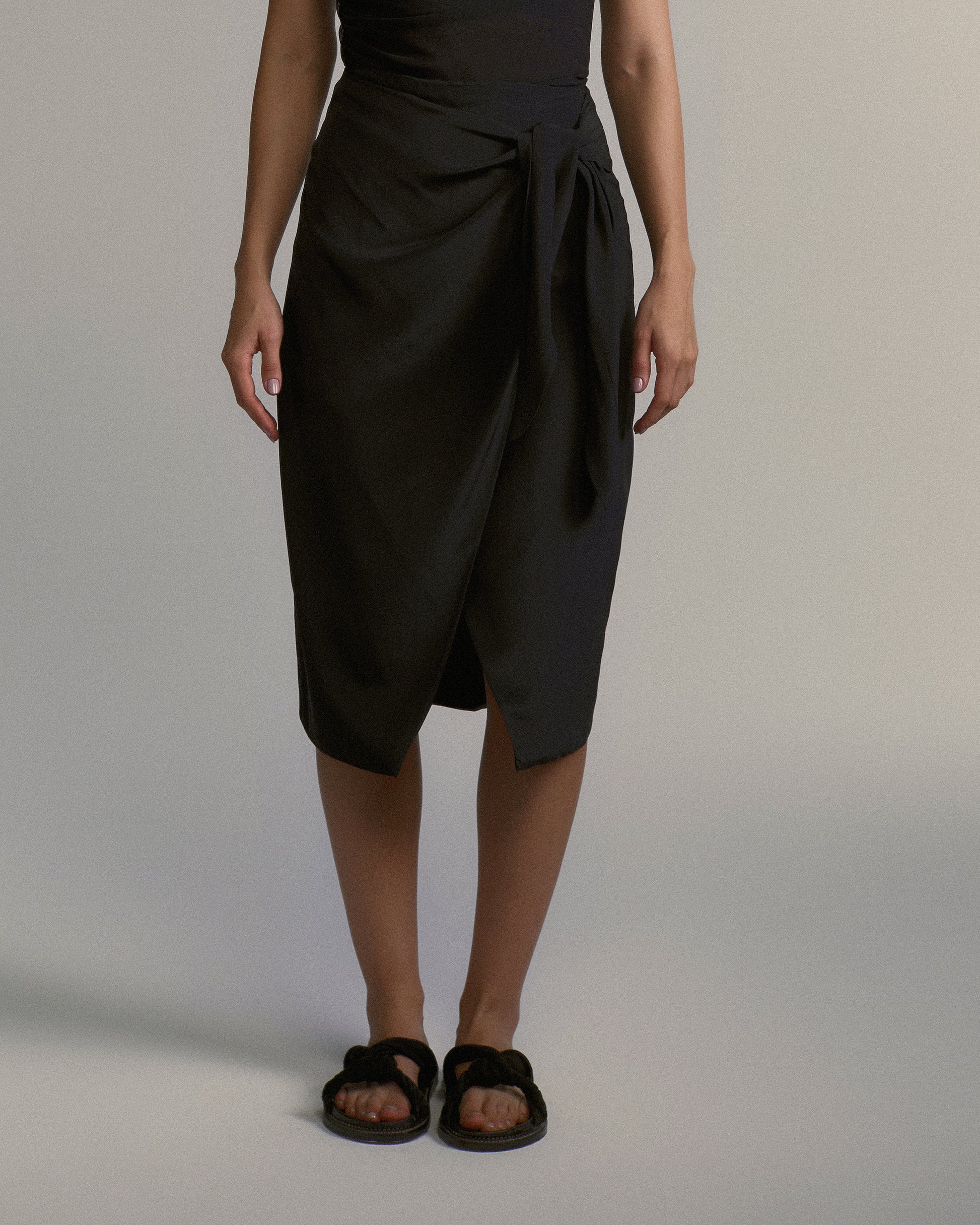 A Saia Pareô é de seda pura, com modelagem envelopada e amarração lateral. Possui fenda ajustável e fechamento traseiro em zíper invisível. Faz parte da linha festa e compõe bem com blusas da coleção.