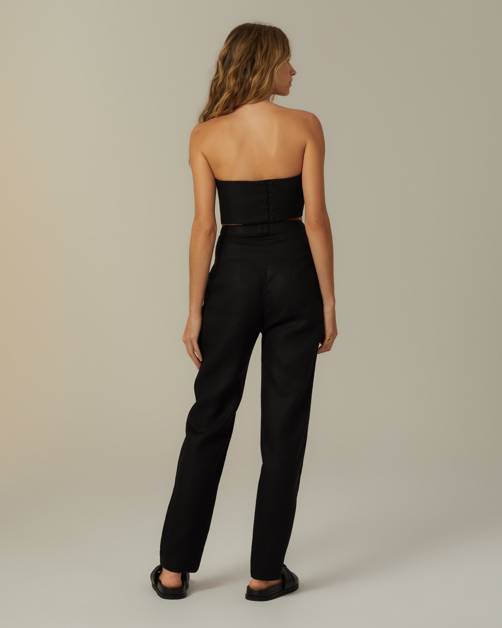 O Top Eros é um cropped tomara que caia estruturado em alfaiataria dupla. Possui entretela, barbatanas e forro no próprio tecido. Nas costas, apresenta duas fileiras de botões reguláveis; na frente, dobra triangular no decote.