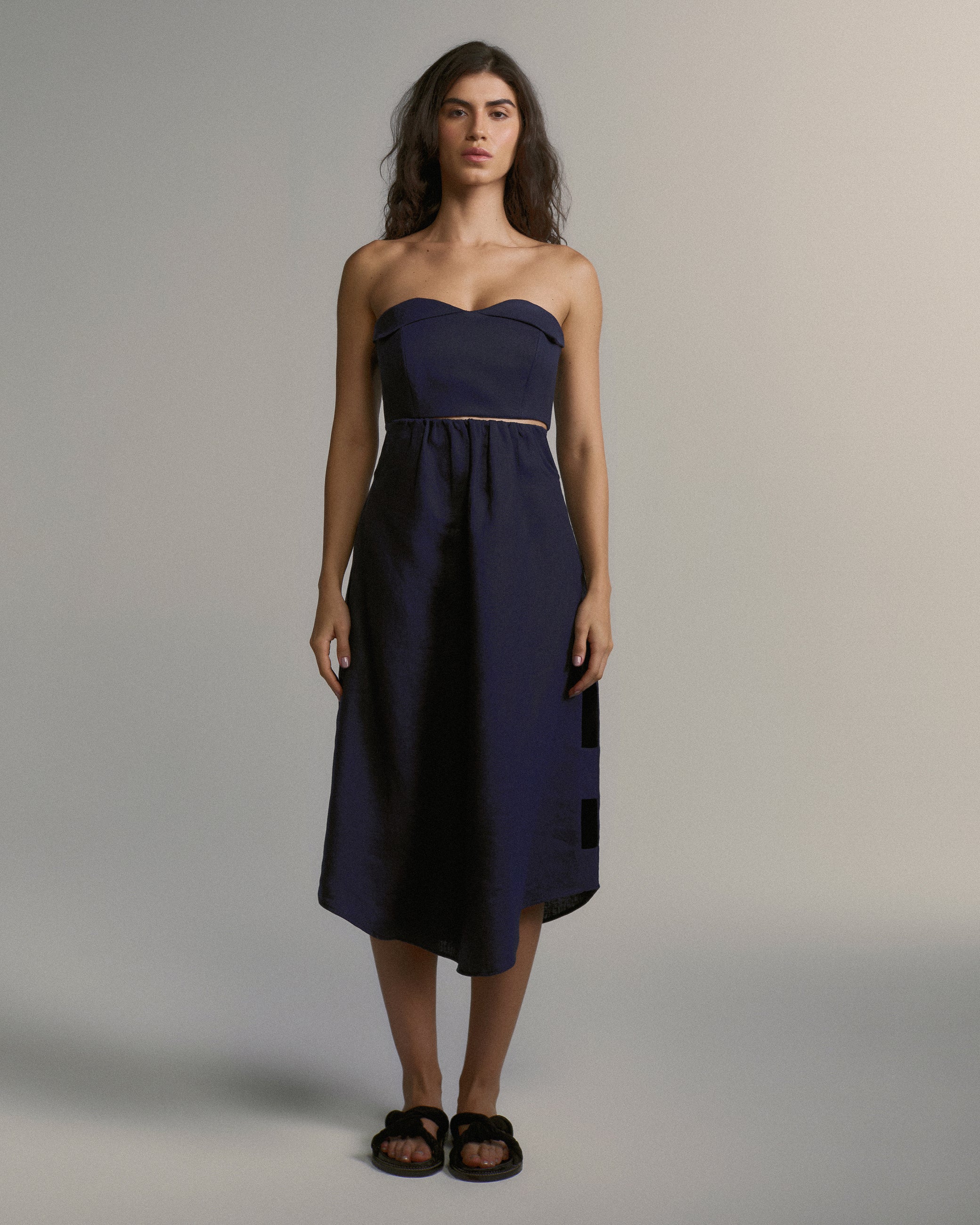 O Top Eros é um cropped tomara que caia estruturado em alfaiataria dupla. Possui entretela, barbatanas e forro no próprio tecido. Nas costas, apresenta duas fileiras de botões reguláveis; na frente, dobra triangular no decote.