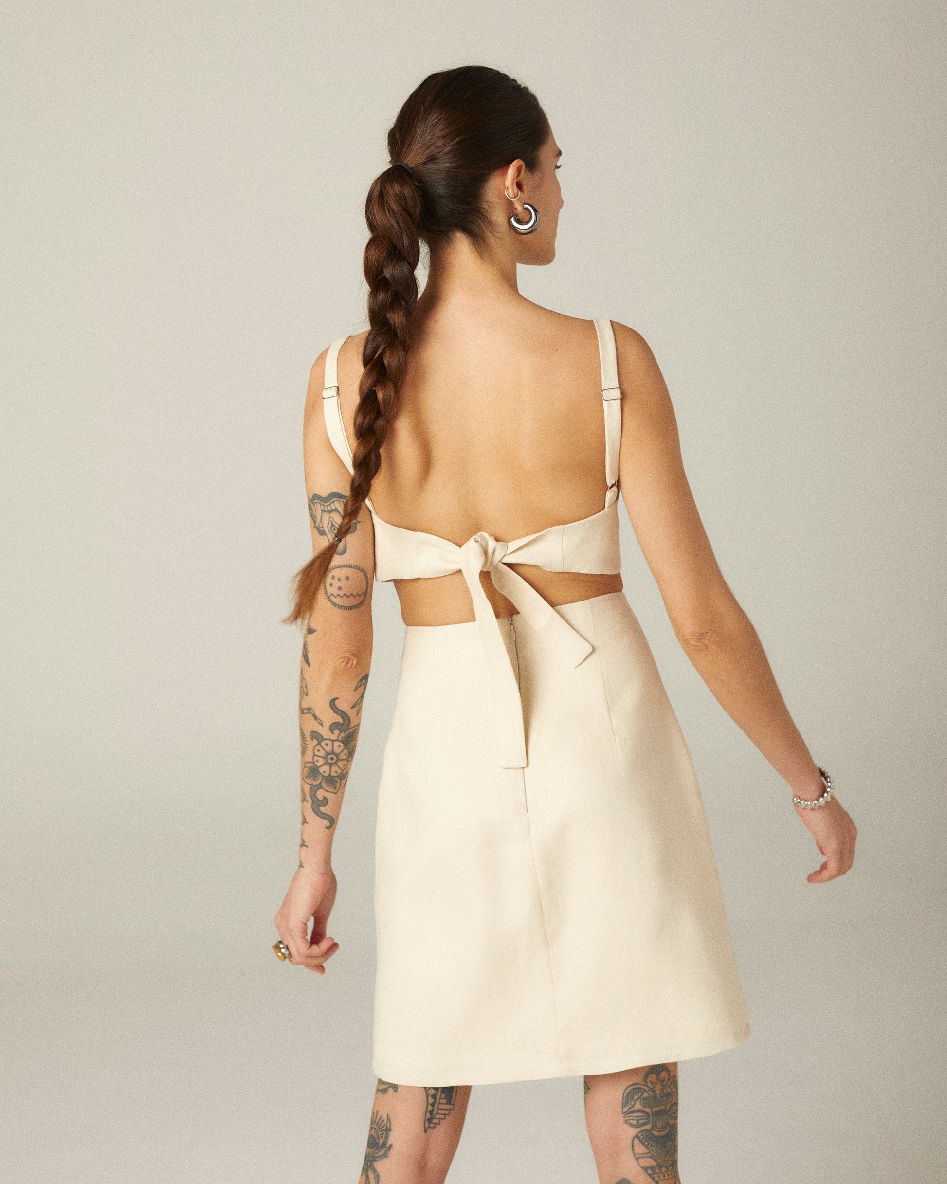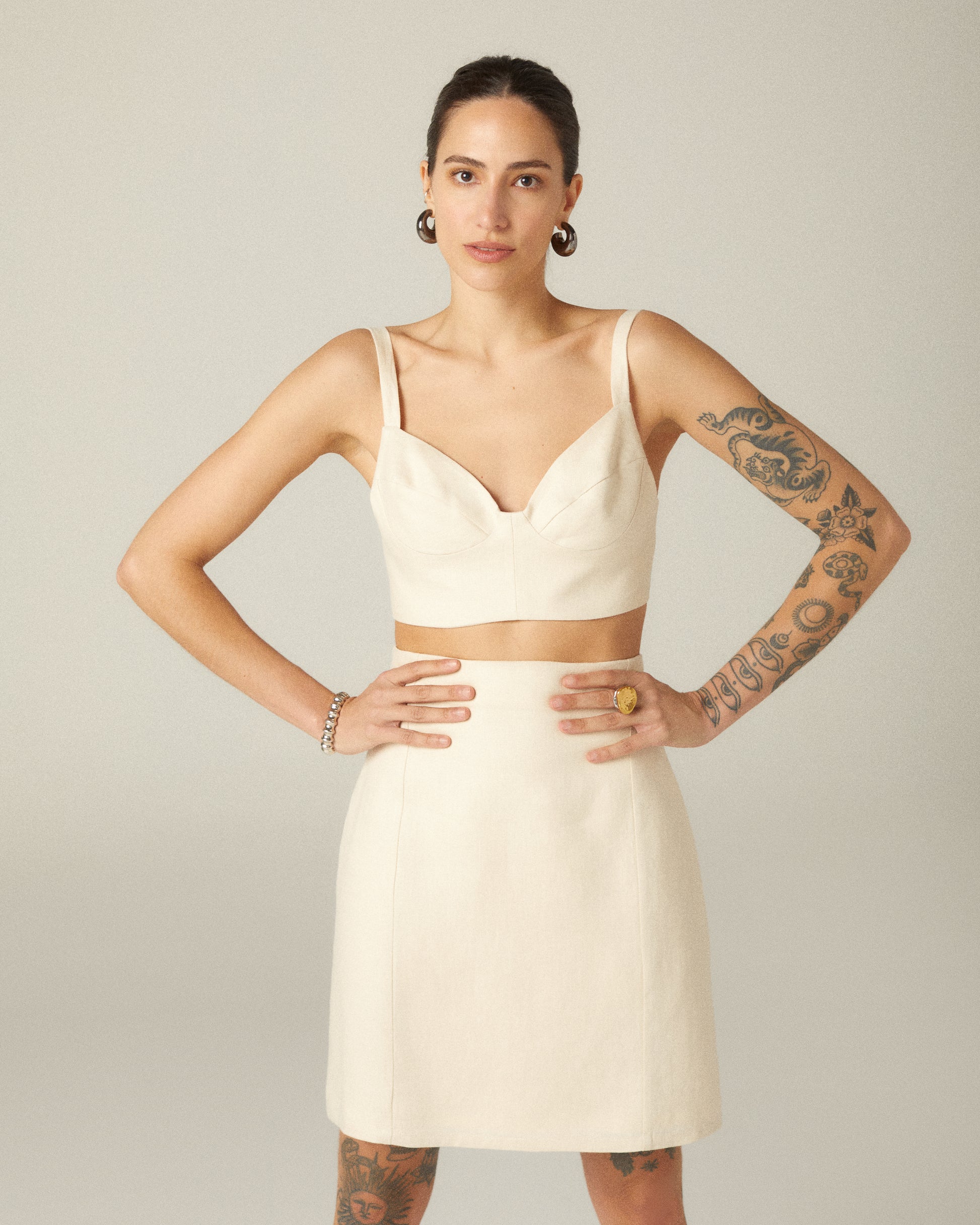 Top meia-taça em linho, estruturado, duplo e forrado, desenvolvido para transitar entre diferentes composições da coleção. Pode ser usado sozinho ou sobreposto por outras peças. O fechamento nas costas é feito por amarração, garantindo ajuste delicado e versatilidade no uso.