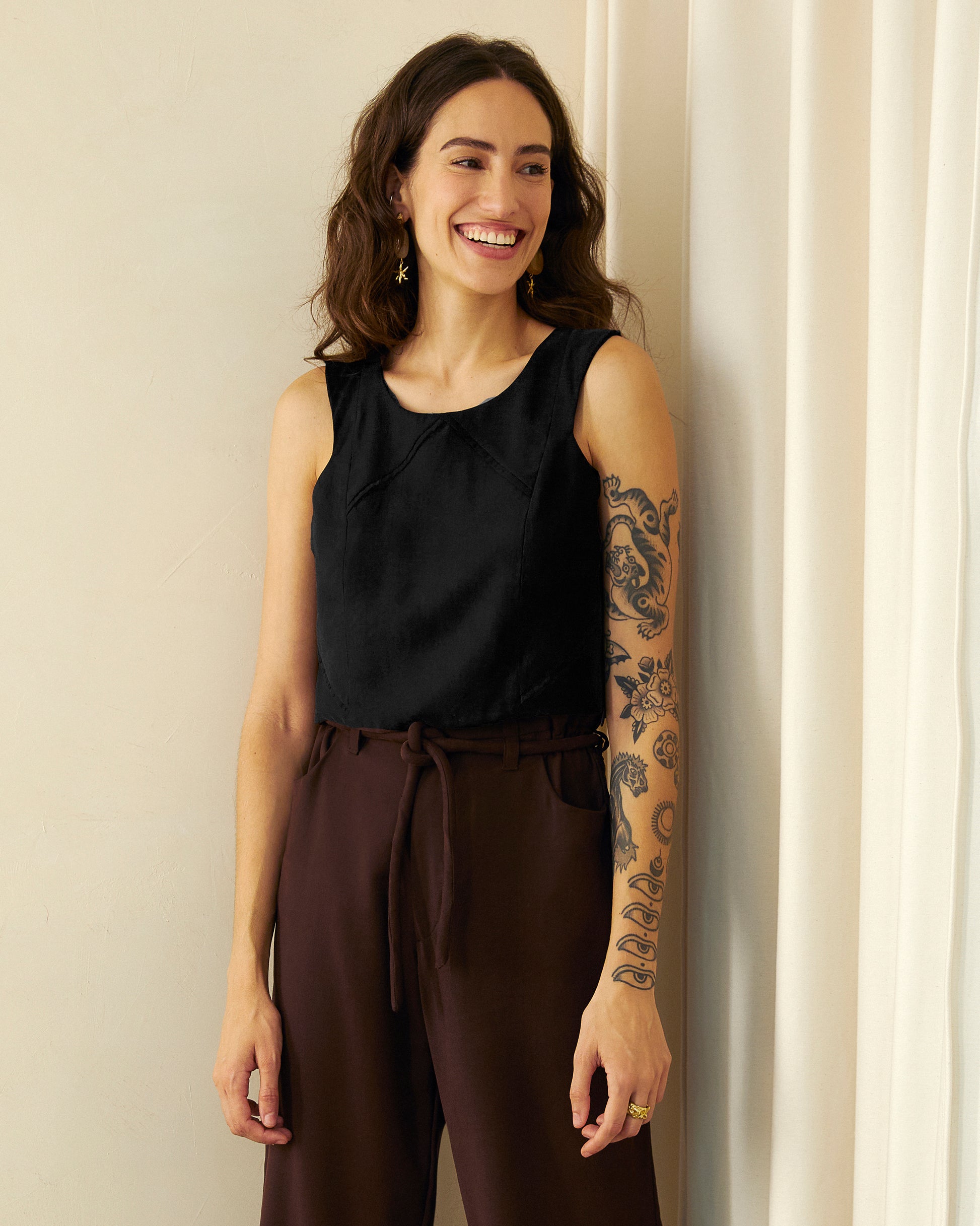 O Top Setas é um cropped estruturado, com recortes nos ombros e vazado triangular nas costas. Possui vivos aplicados na frente e abertura lateral com botão do próprio tecido. O fechamento é lateral, com zíper invisível. Uma peça refinada e versátil, indicada para compor tanto conjuntos casuais quanto de festa.
