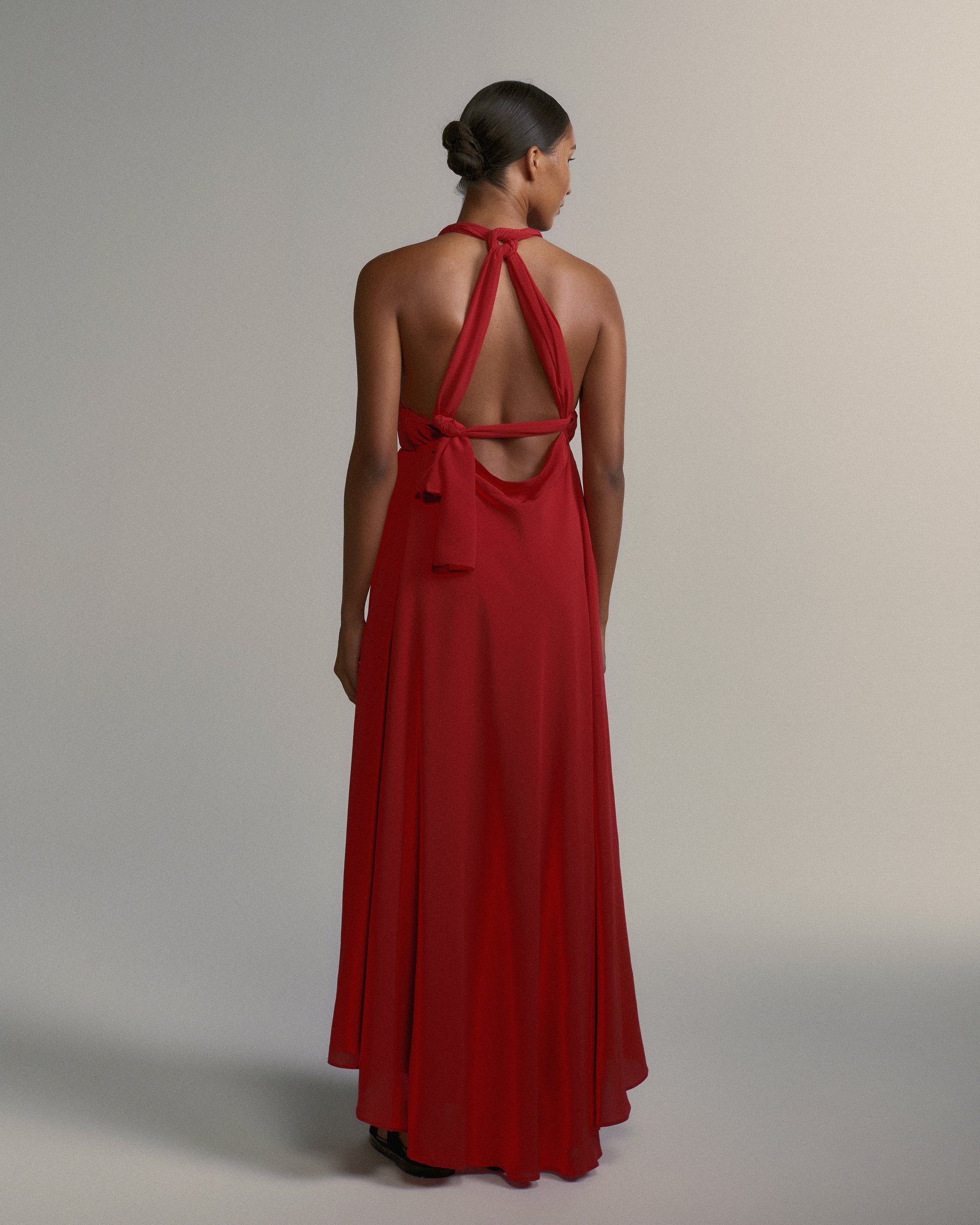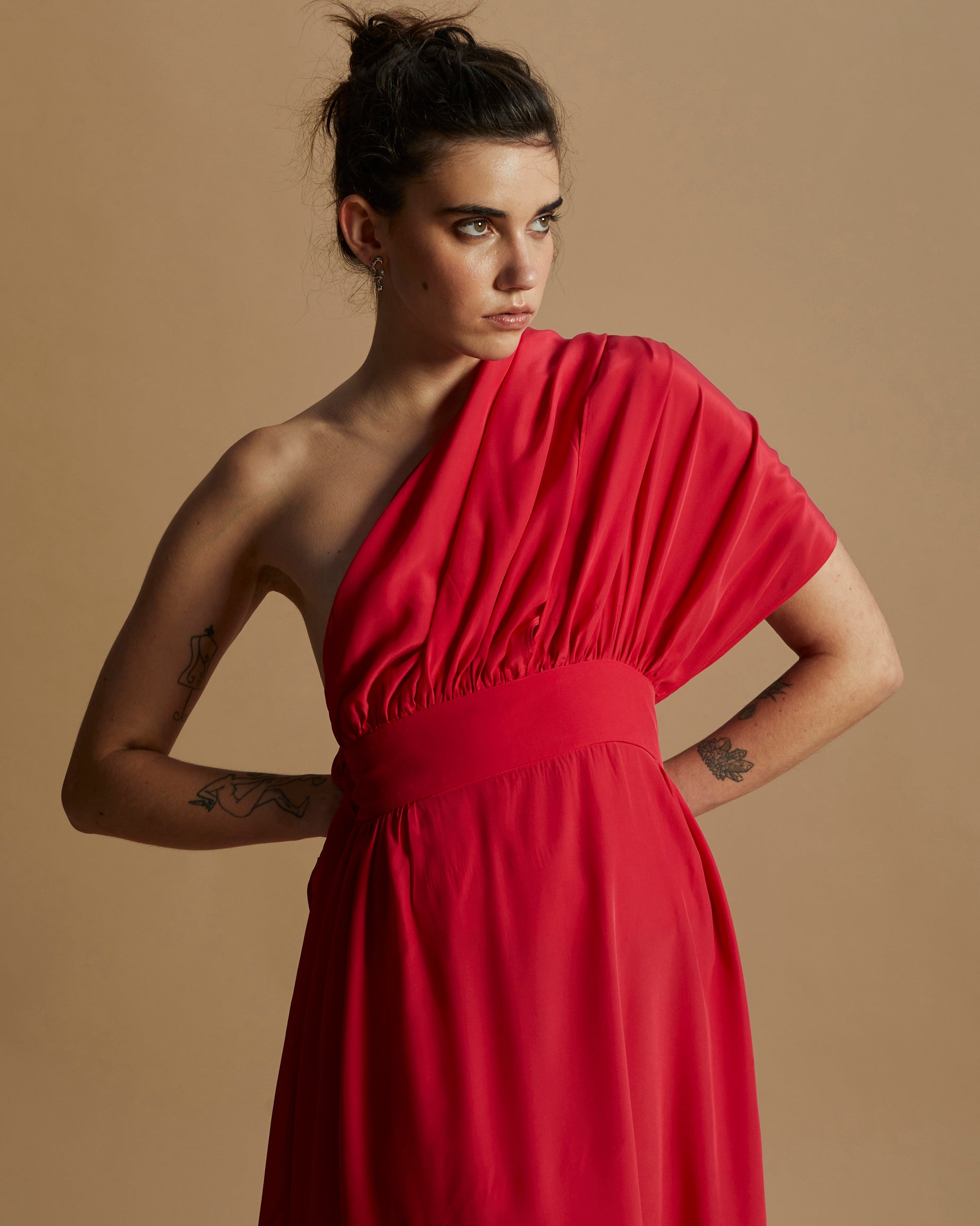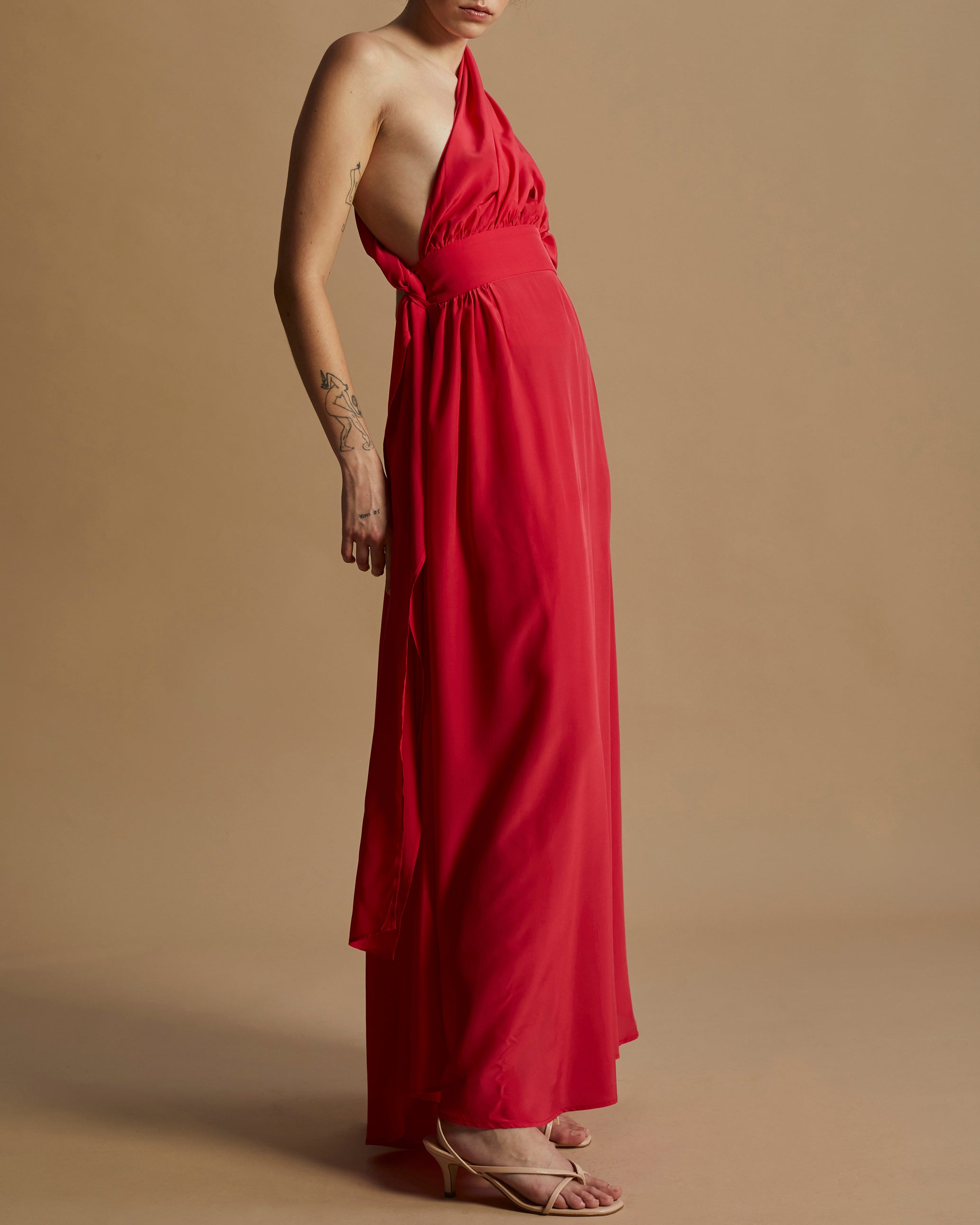 O Vestido Amanda é confeccionado em seda pura, com busto formado por duas faixas ajustáveis e saia assimétrica. Possui cós largo estruturado e fechamento em zíper invisível.