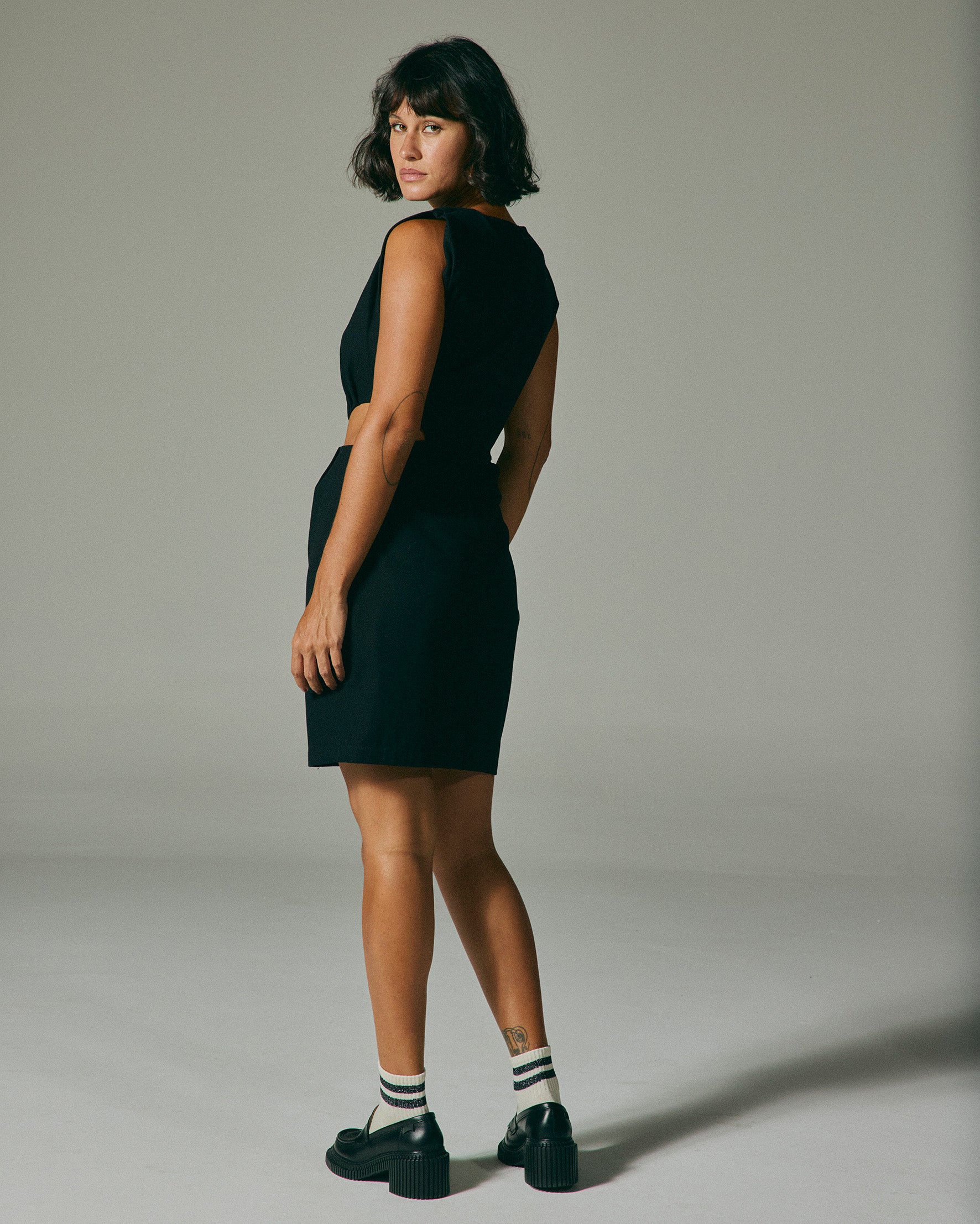 Vestido curto com mangas japonesas e pregas delicadas nos ombros. Apresenta vazados laterais, fenda frontal sobreposta e fechamento traseiro com zíper invisível.