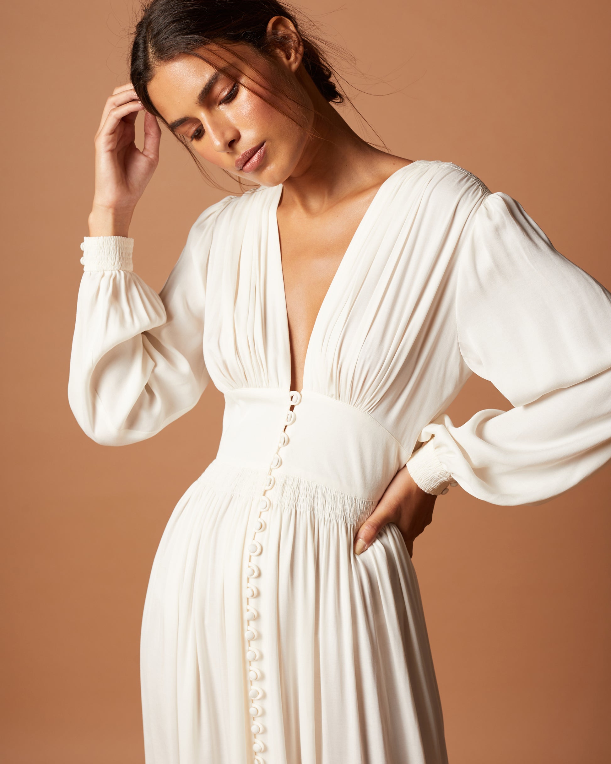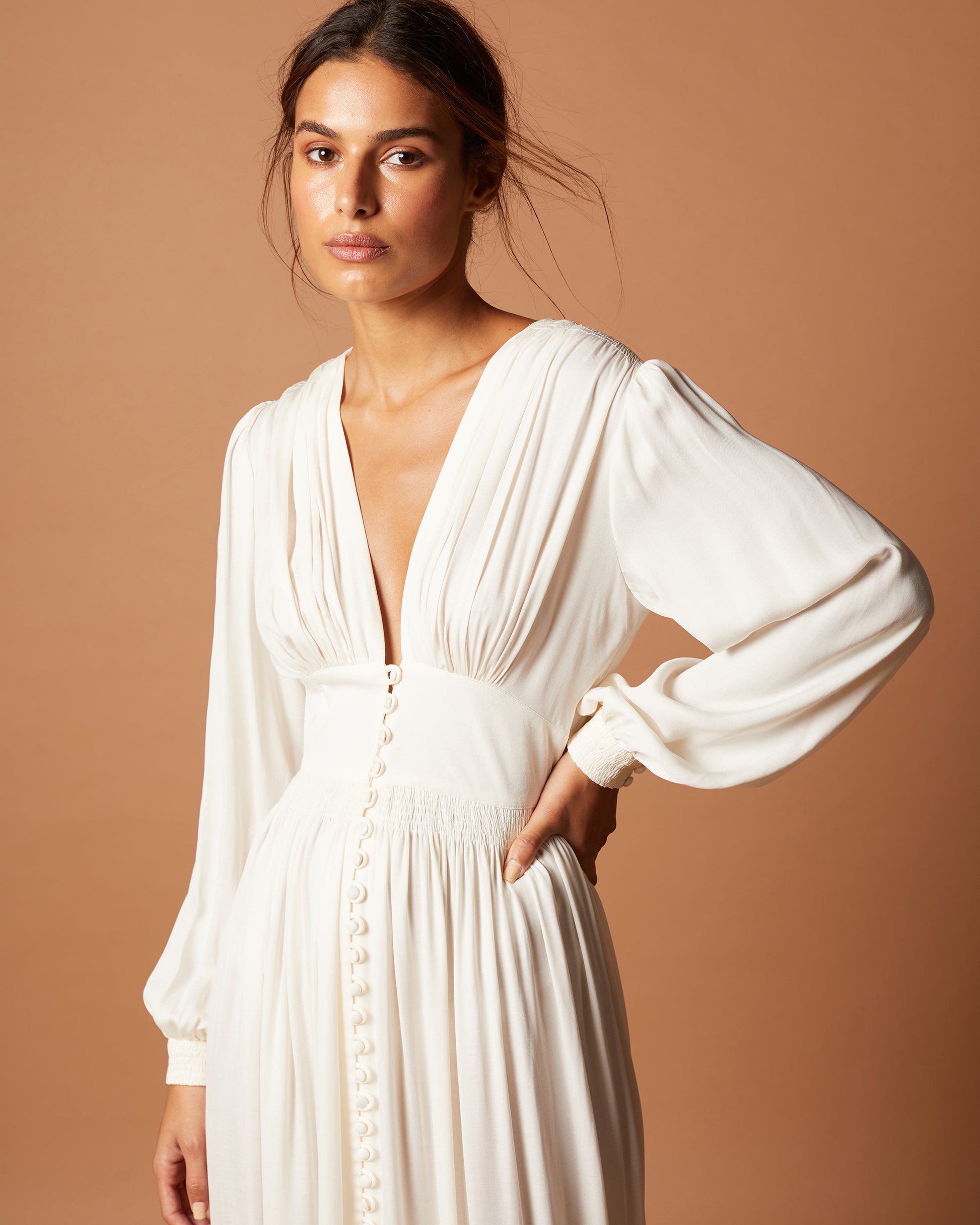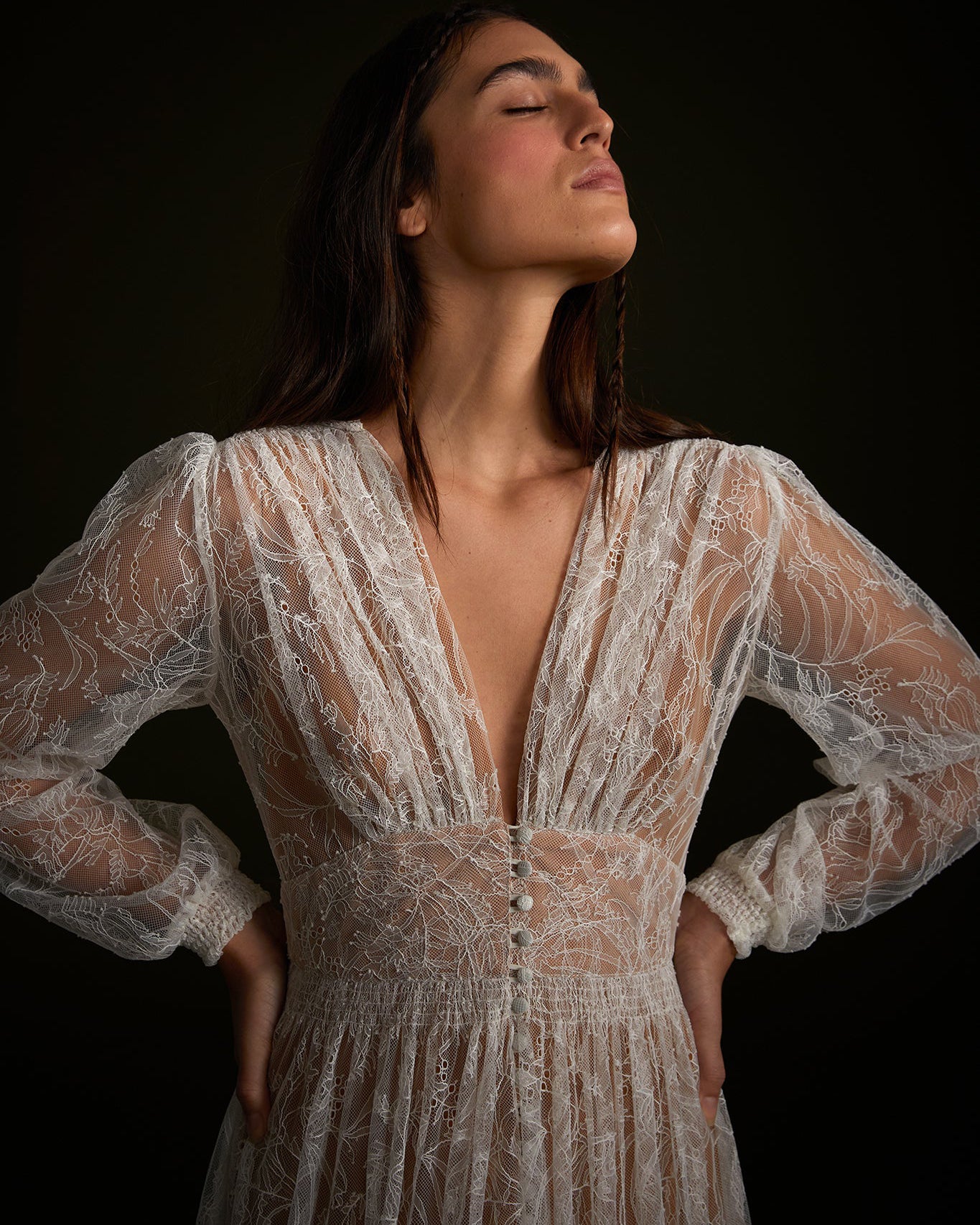 Equilibrando leveza e densidade, o vestido Julieta é uma peça de manga longa bufante, fechamento frontal com azelhas e botões forrados no próprio tecido.