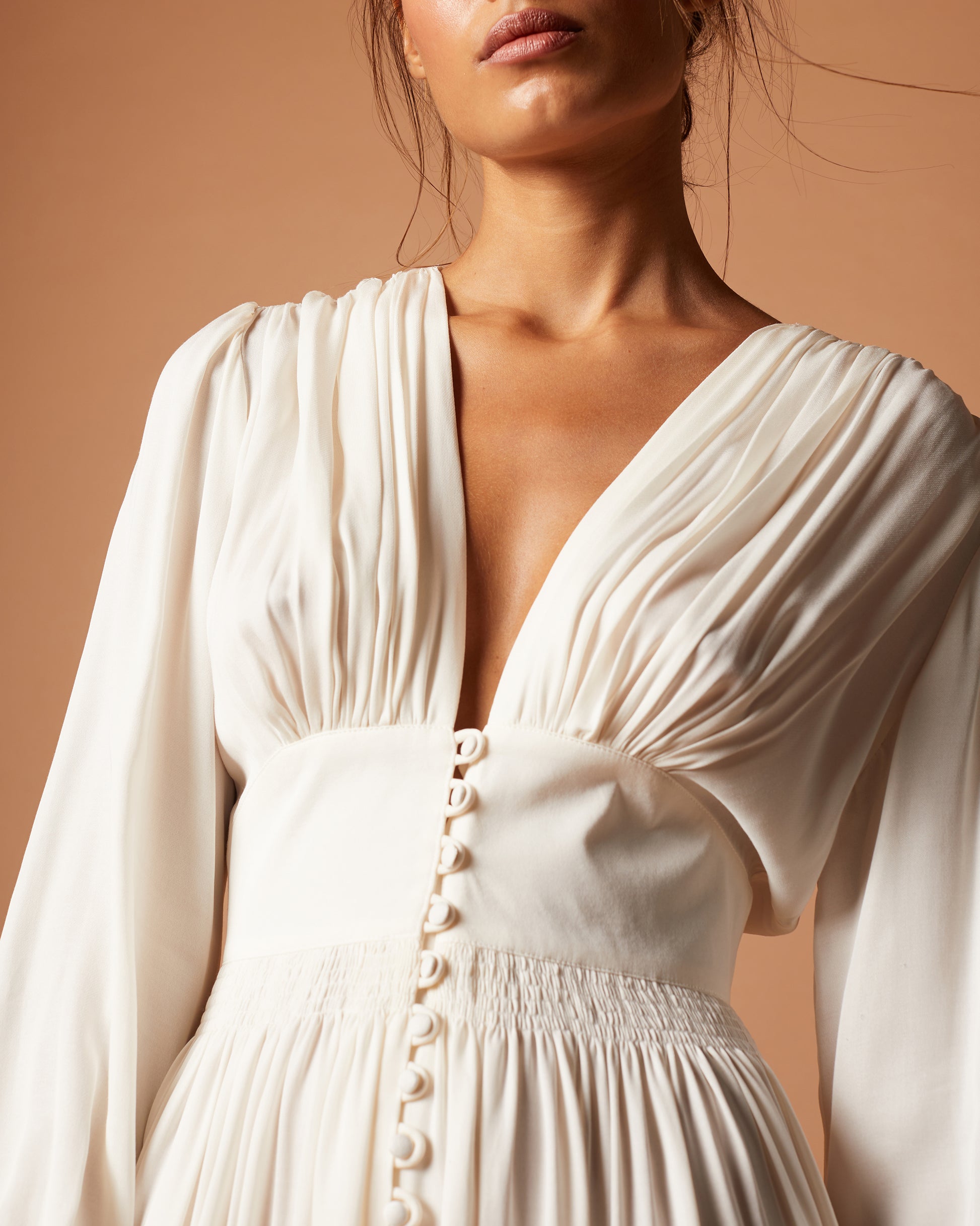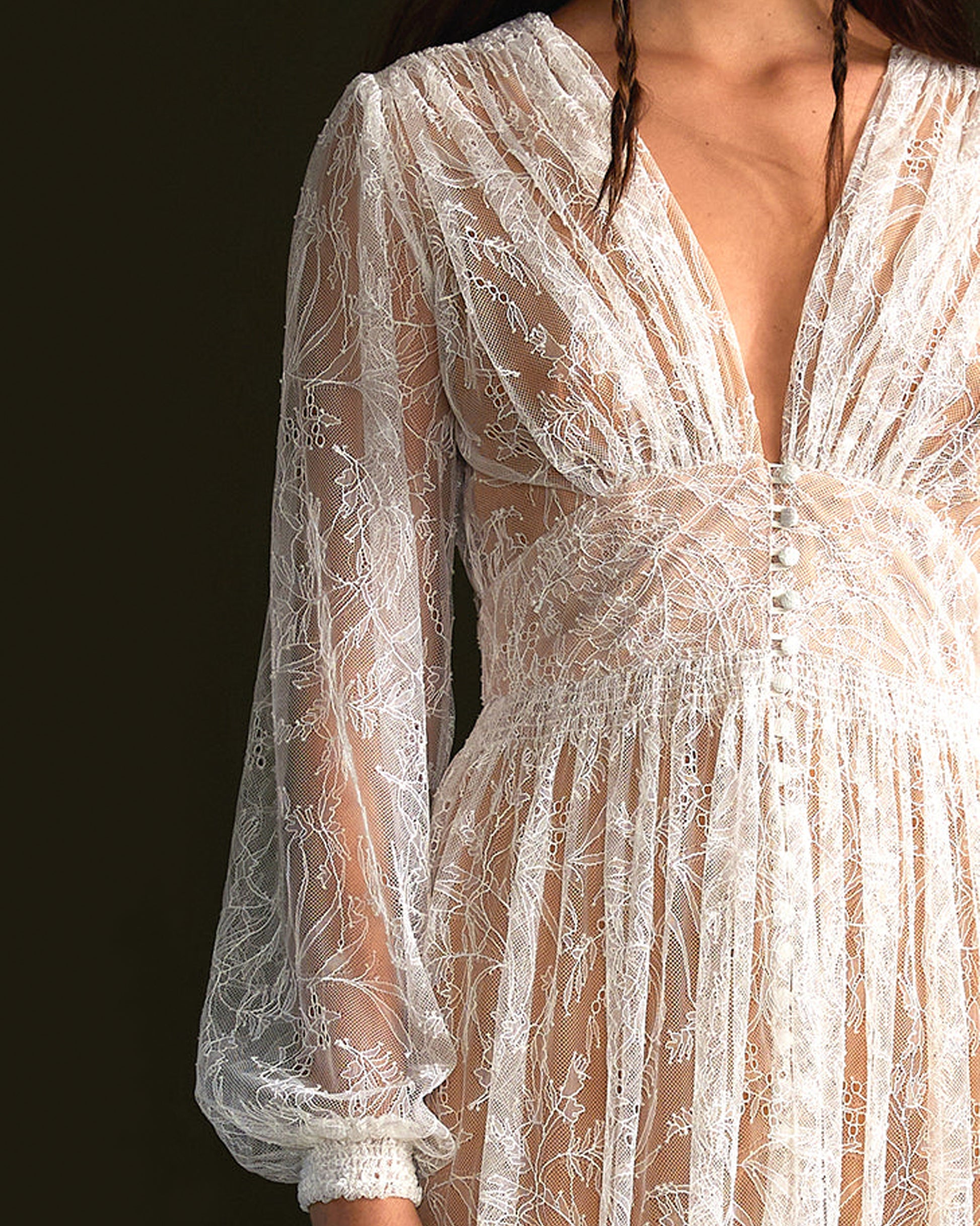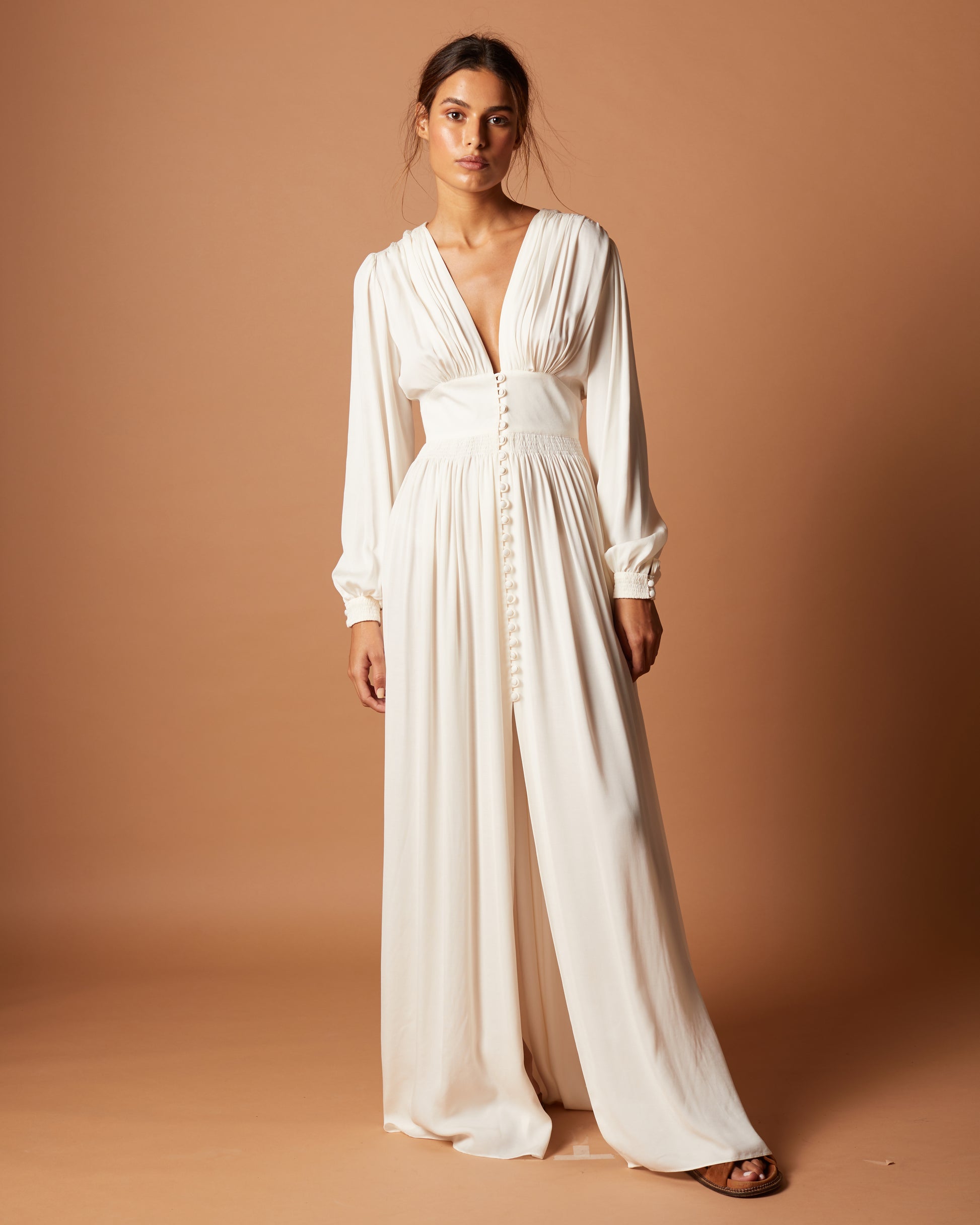 Equilibrando leveza e densidade, o vestido Julieta é uma peça de manga longa bufante, fechamento frontal com azelhas e botões forrados no próprio tecido.