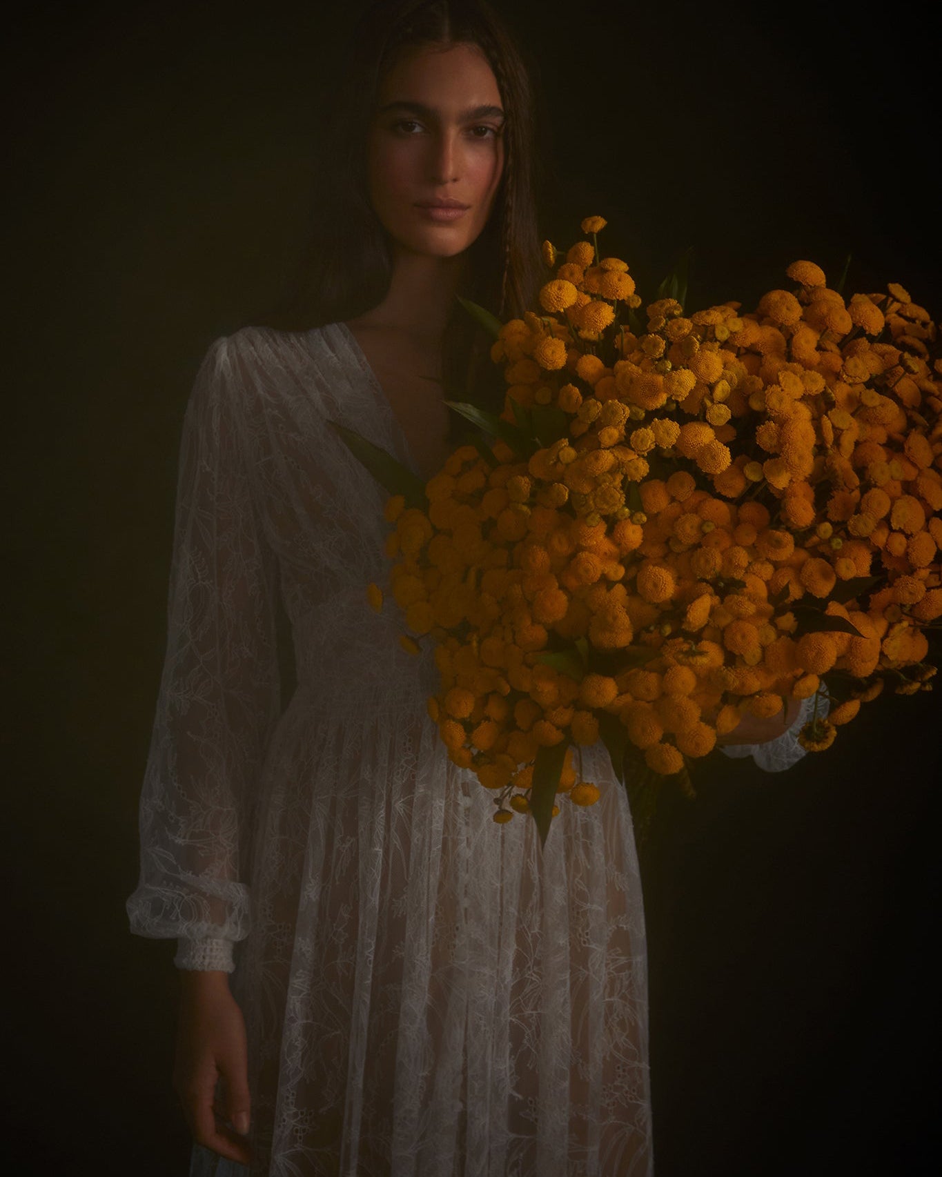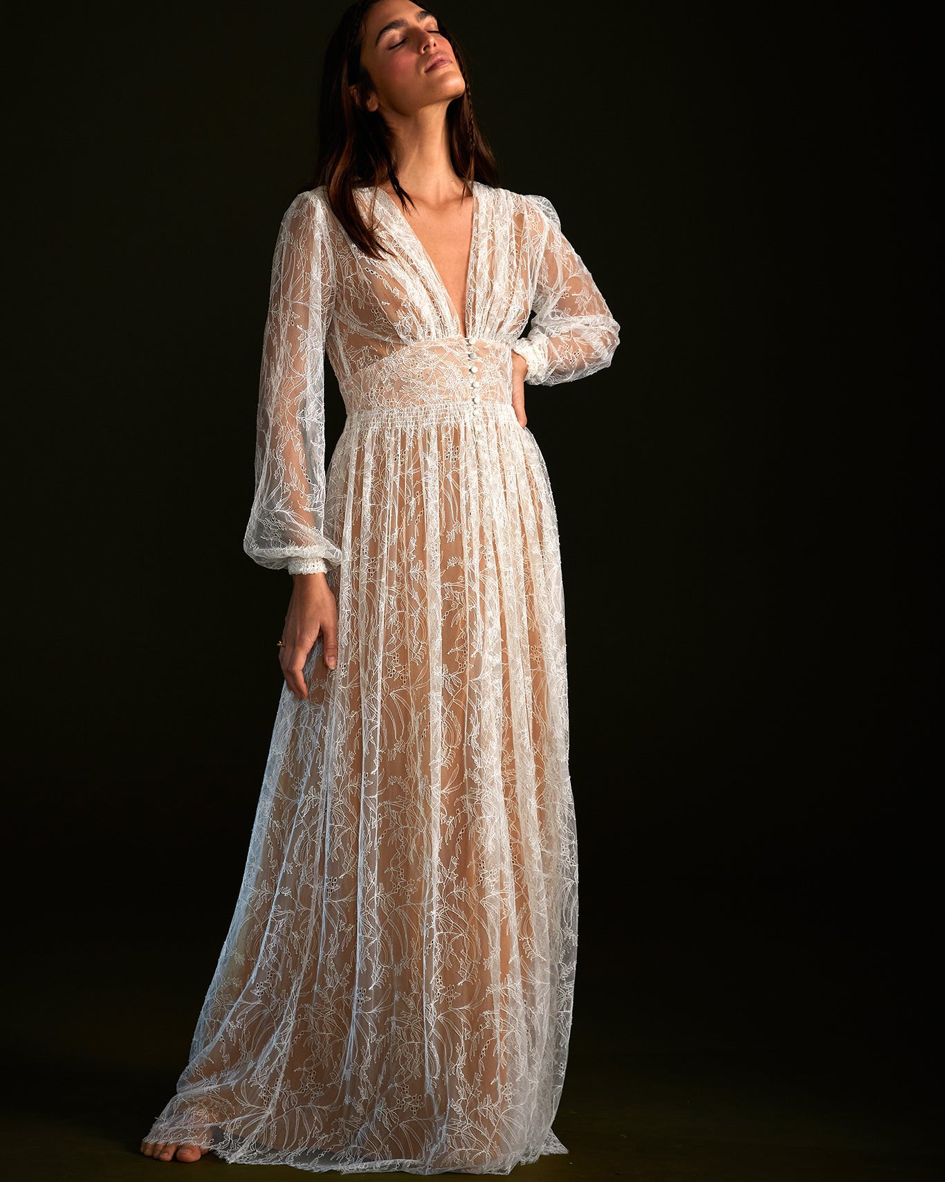 Cinturado e longo, tem como inspiração os enxovais de núpcias das mulheres na década de 30, dialogando também com o vestuário feminino do período elizabethano.