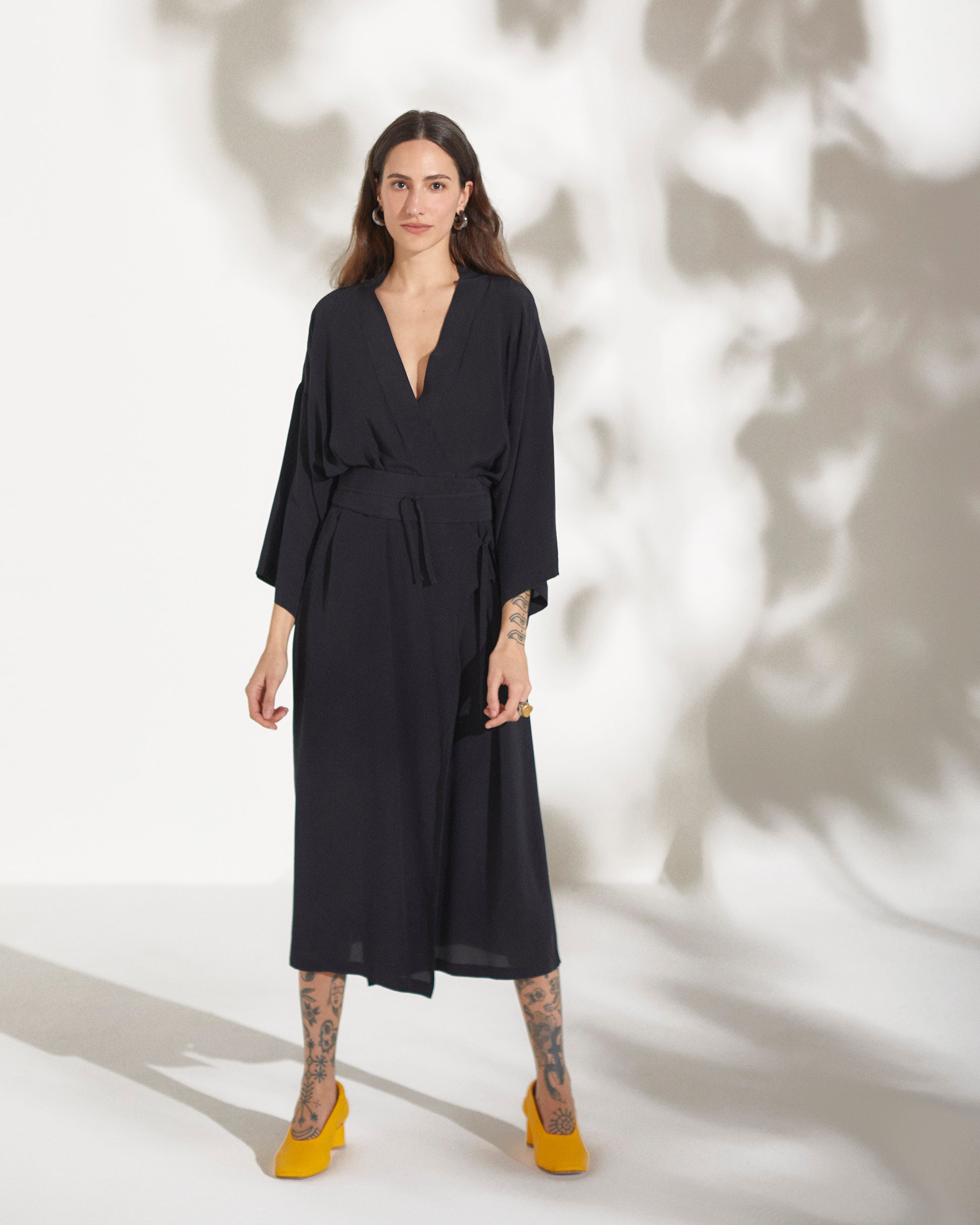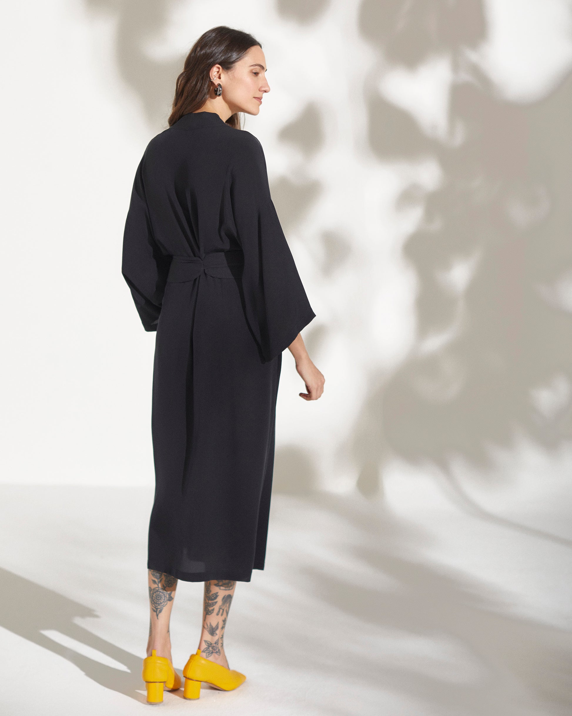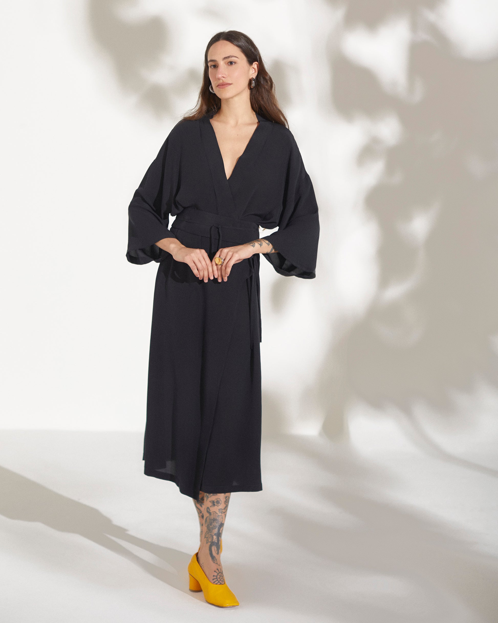 O Quimono Laura é confeccionado em seda, com comprimento midi e mangas longas evasê. Pode ser usado como vestido, robe ou casaco leve, compondo looks versáteis.