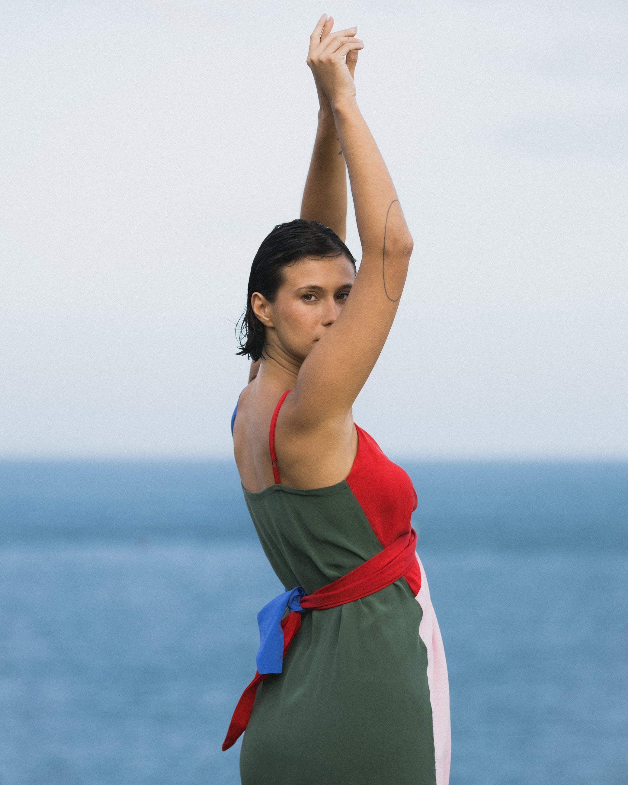 O Vestido Tarsila é midi, com base no Top Lenço e modelagem pareô de amarração interna. Possui títulos finos reguláveis e barras ovaladas. Apresenta as cores da coleção: azul, vermelho, canela, verde e rosa.