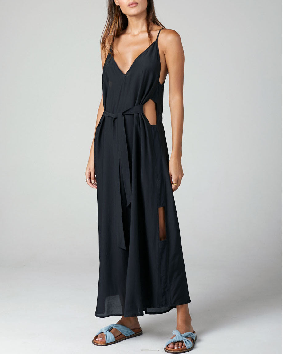 O vestido Vazado é longo, amplo, de alças reguláveis e decote em “V”. Versátil, pelas suas múltiplas possibilidades de uso, equilibra despojamento, conforto e sensualidade. Seus retângulos vazados laterais, na altura da cintura e acima do joelho sugerem novas maneiras de avistar o corpo.