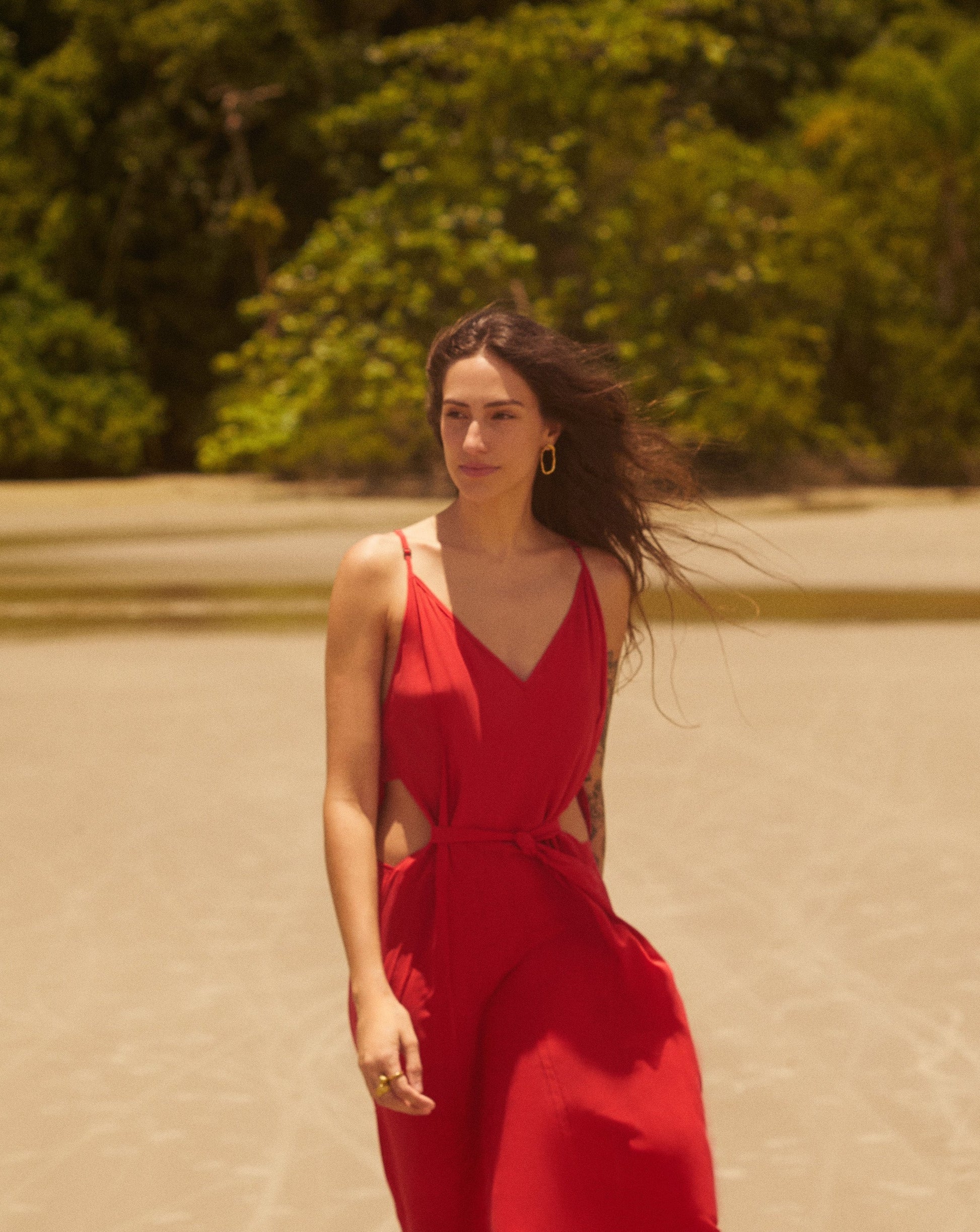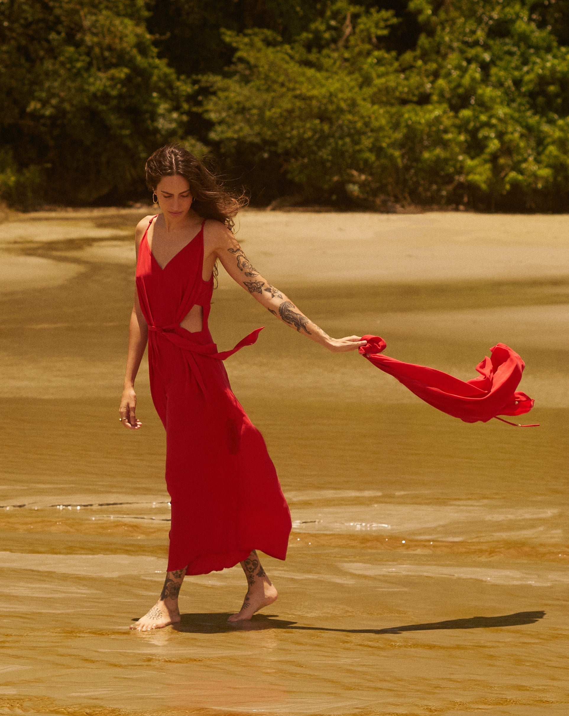 O Vestido Vazado é longo e amplo, com alças reguláveis e decote em “V”. Apresenta retângulos vazados laterais na cintura e acima dos joelhos, além de faixa ajustável que valoriza a silhueta. Confeccionado em seda, é versátil e adequado para o verão.